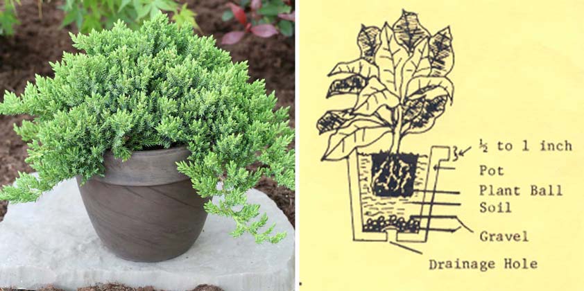 - Fill the bottom 5 cm (2 in) with Horticultural Gravel to improve drainage, prevent clogging and create a lower centre of gravity. Potted conifers can become top-heavy and this will lower accidental spilling during high winds.