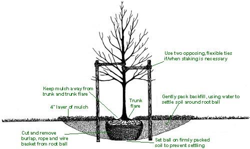 - Add soil around the root ball gradually packing it up to the top of the ball and gently packing it in the sides so that is stays positioned properly, eventually slightly covering the root mass.