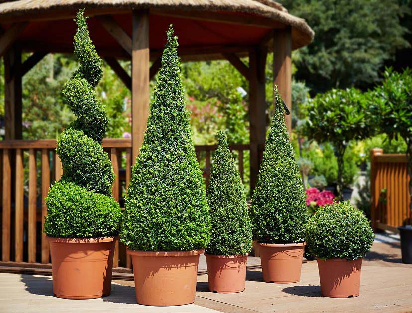 Here at Garden Plants we recommend the first yearly trimming in April-May and the second mid-September just like we do at our nursery. This will encourage growth and create denser, fuller foliage and a healthier plant. Ideally trim on a cloudy, dry day as cutting in the full sun can scorch the leaves and cutting when wet is not recommended as it can encourage blight. Your new topiary should be allowed one full growing season before a hard pruning.