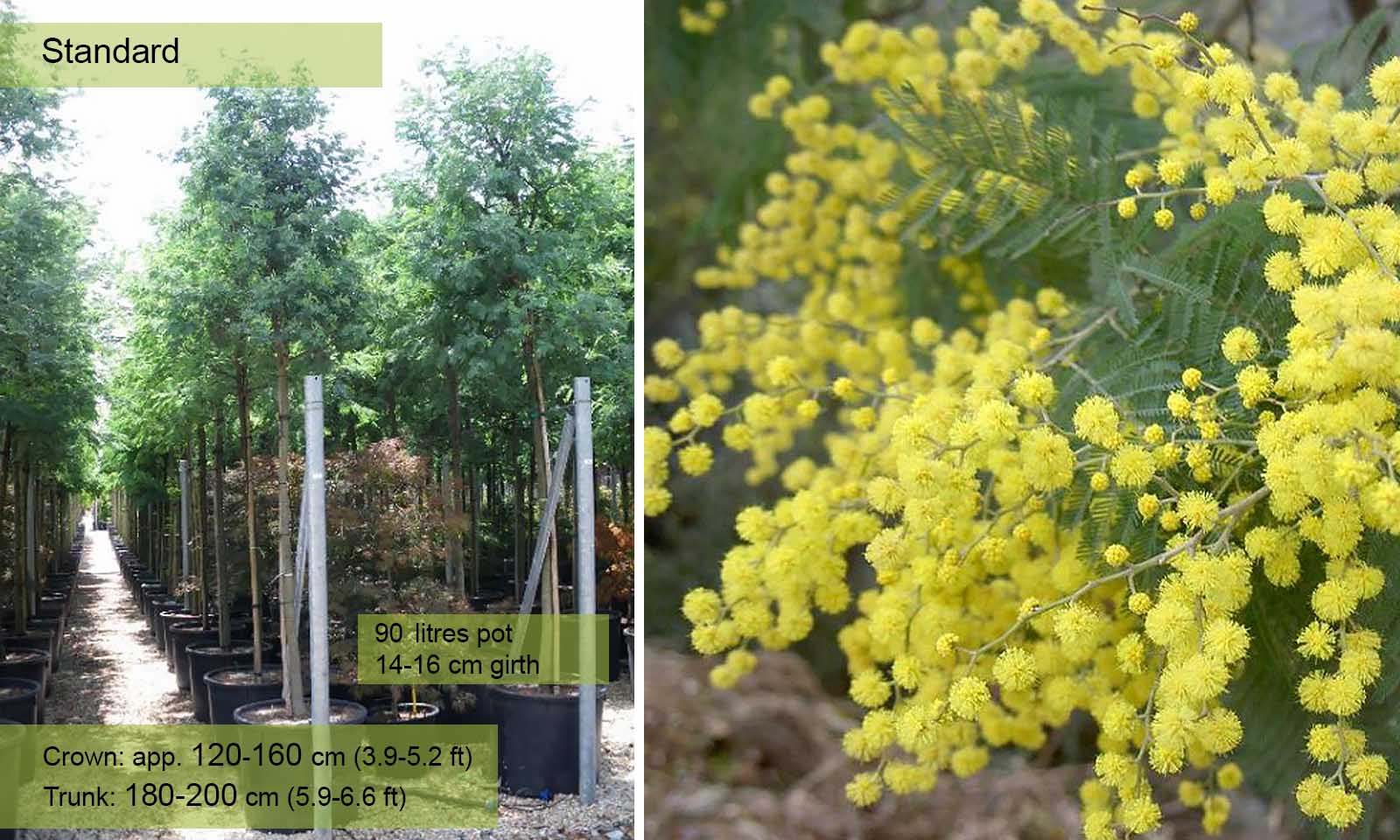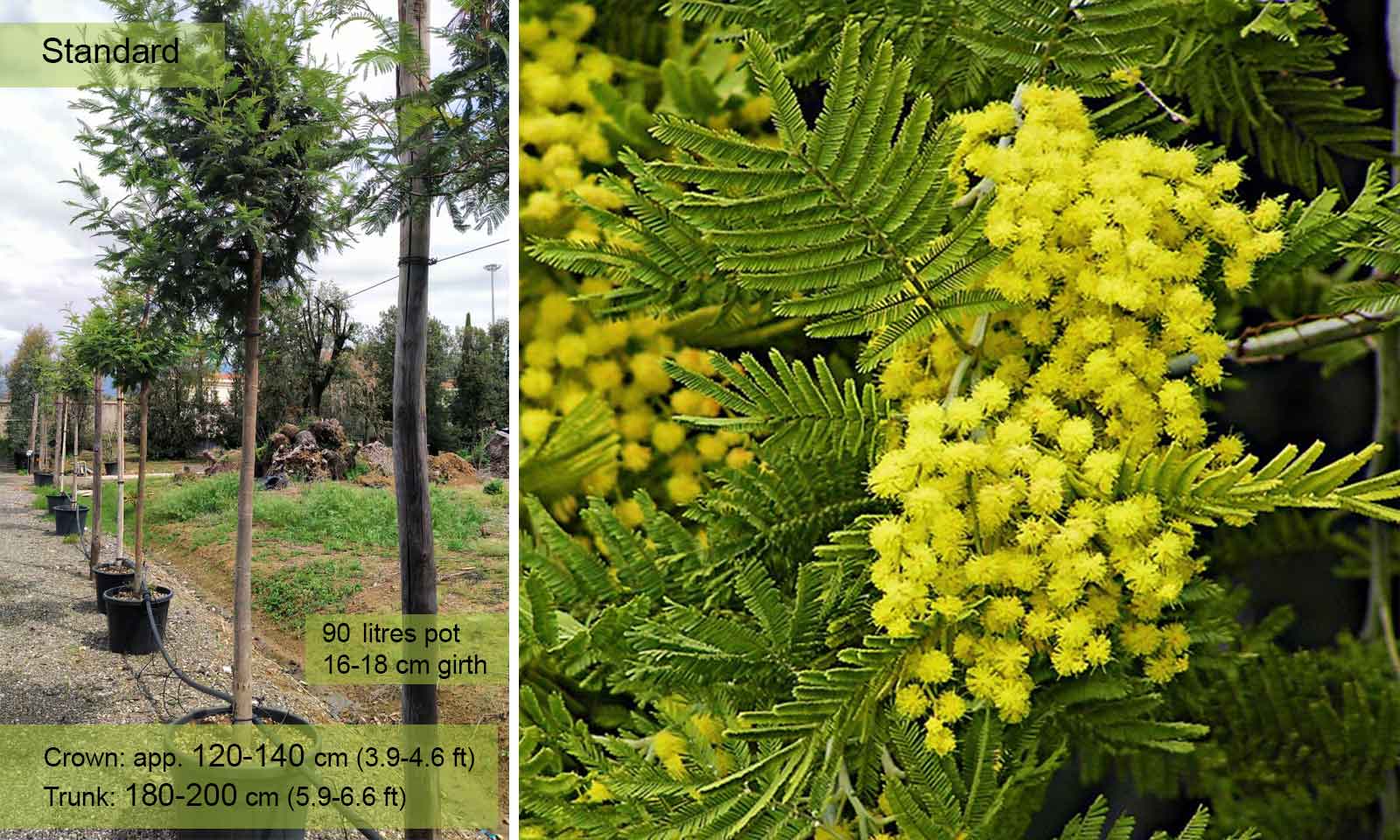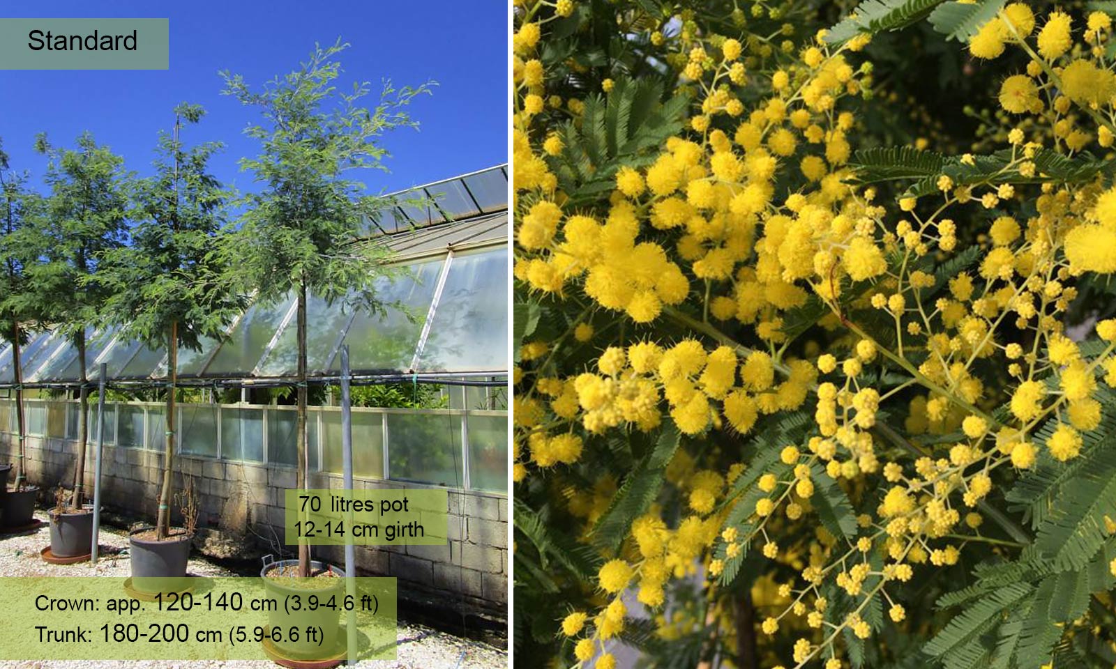Chiefly native to Australia, Acasias are fast-growing trees or saplings, which require neutral or acid soil. Acacias can be deciduous or evergreen trees, shrubs or climbers They have light, elegant evergreen leaves, glaucous or green. Flowers are a mass of tiny golden yellow pompons, which brighten the winter and spring in mild climates and are are strongly honey-scented. They adapt to coastal climates, but only if sheltered from strong winds. Very easy to grow in pots. Acacia Dealbata – The first mimosa to be introduced to Europe, in 1824. Silvery- grey foliage, flowers from December to March. Most resistant of all varieties to low temperatures. Acacia Dealbata – the first mimosa to be introduced to Europe, in 1824. Silvery- grey foliage, flowers from December to March. Most resistant of all varieties to low temperatures.