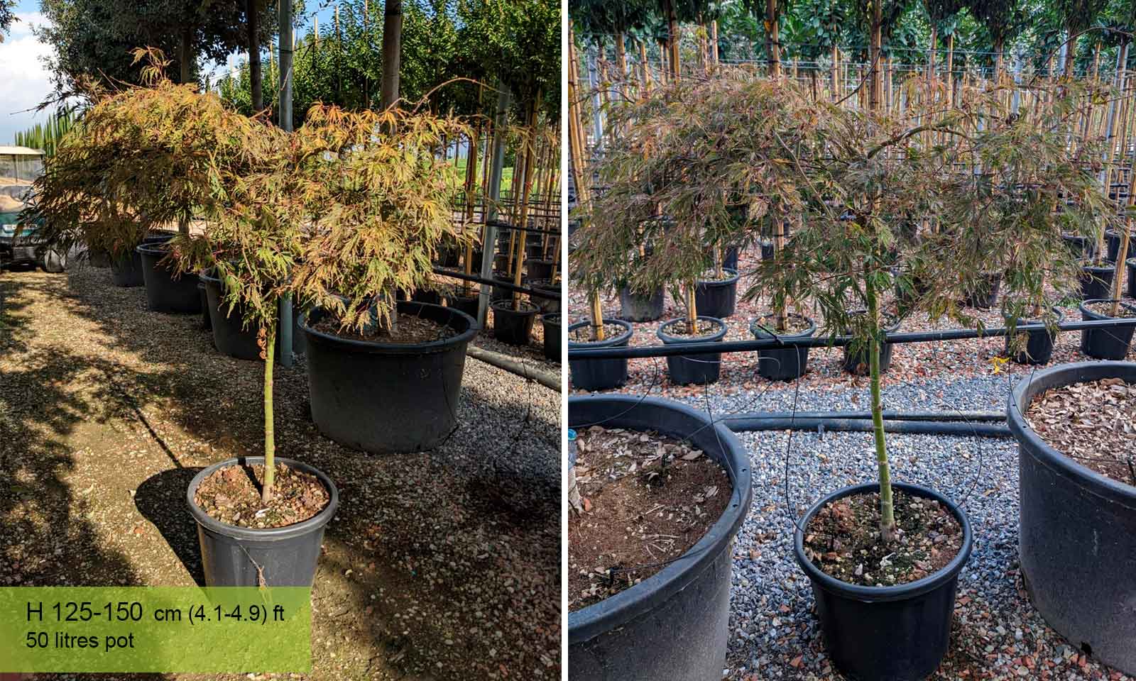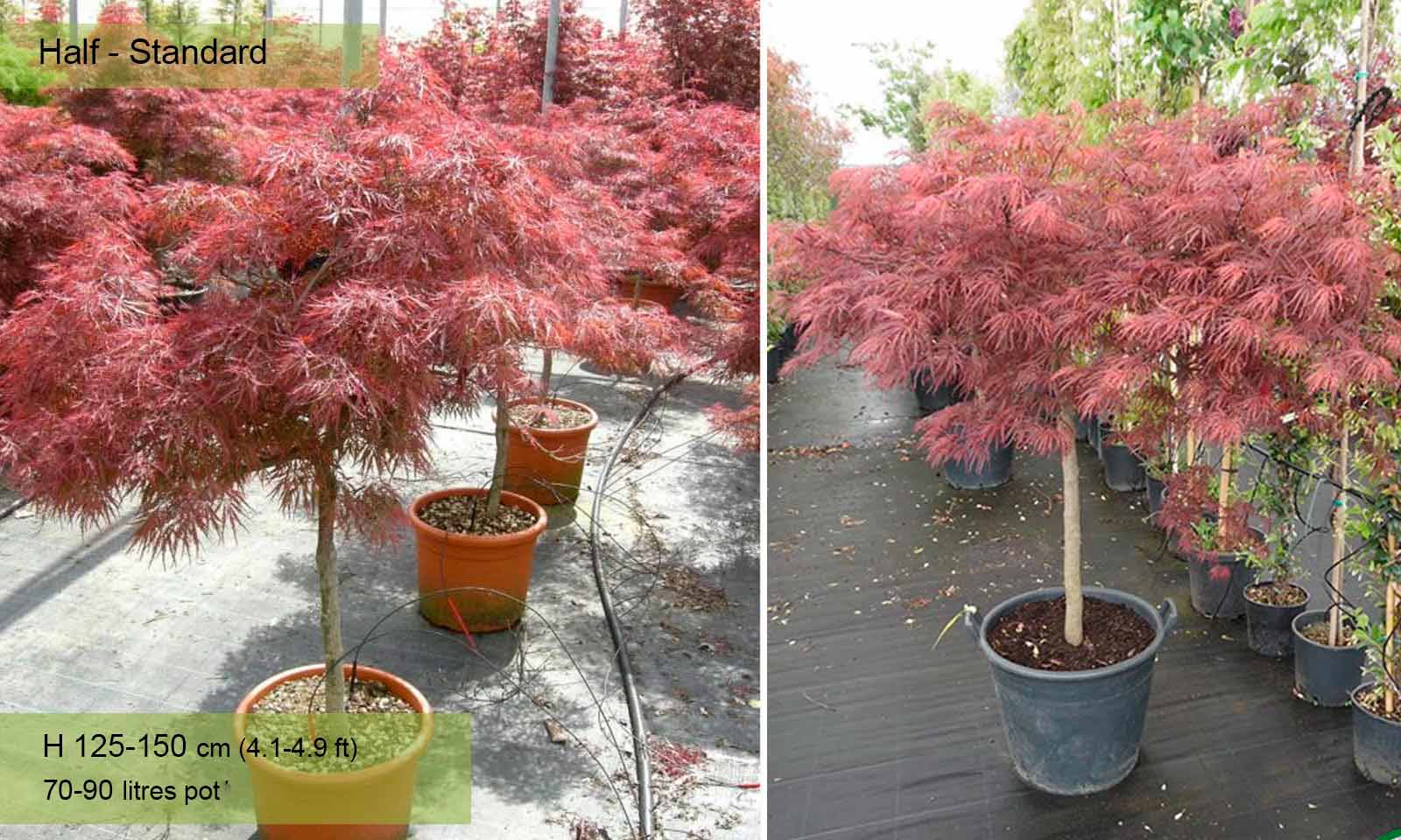 110-160 litre pot: trunk 80 – 120 cm (2.6-3.9 ft), canopy spread app. 100 – 160 cm (3.3-5.2 ft)
