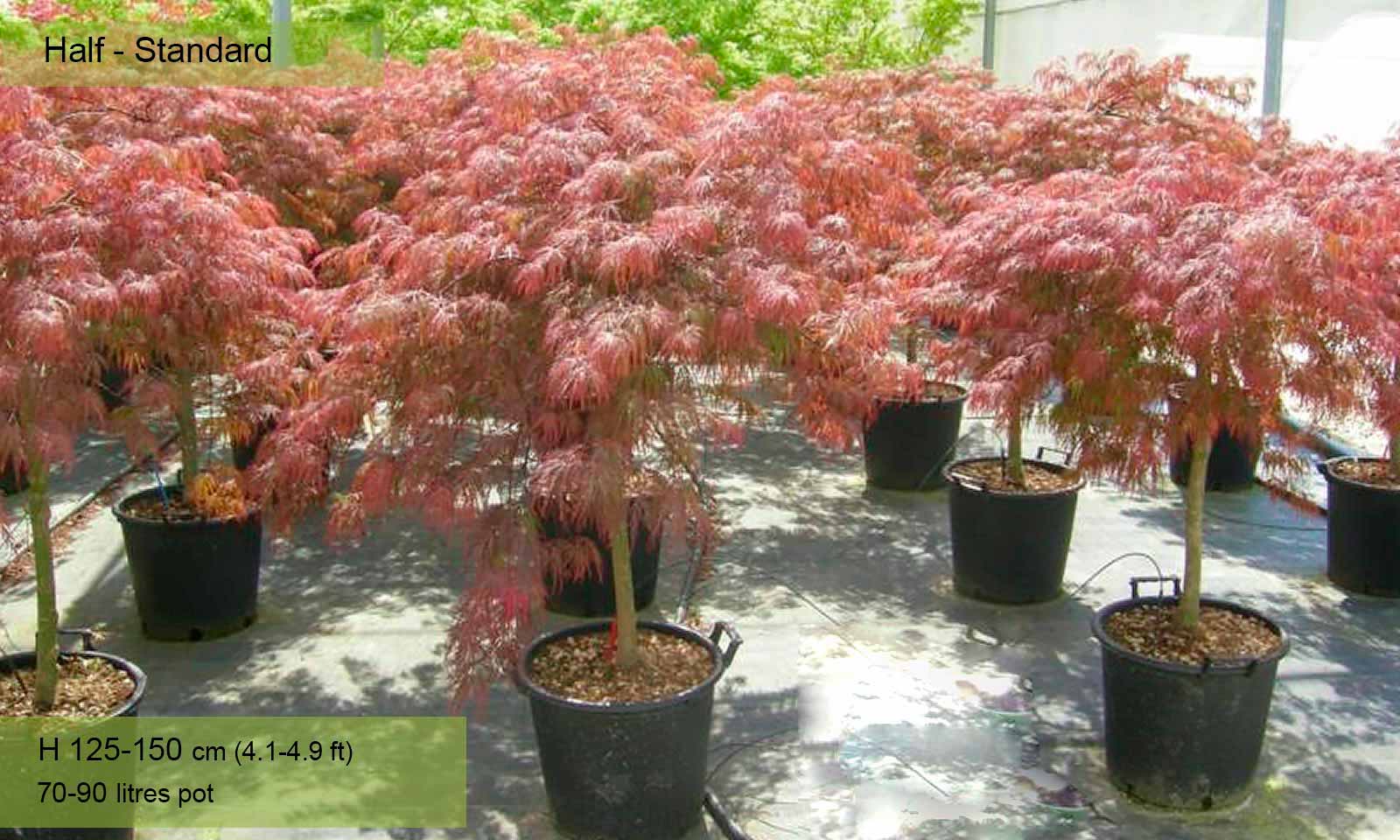 70-90 litre pot: trunk 80 – 120 cm (2.6-3.9 ft), canopy spread app. 80 – 120 cm (2.6-3.9 ft)