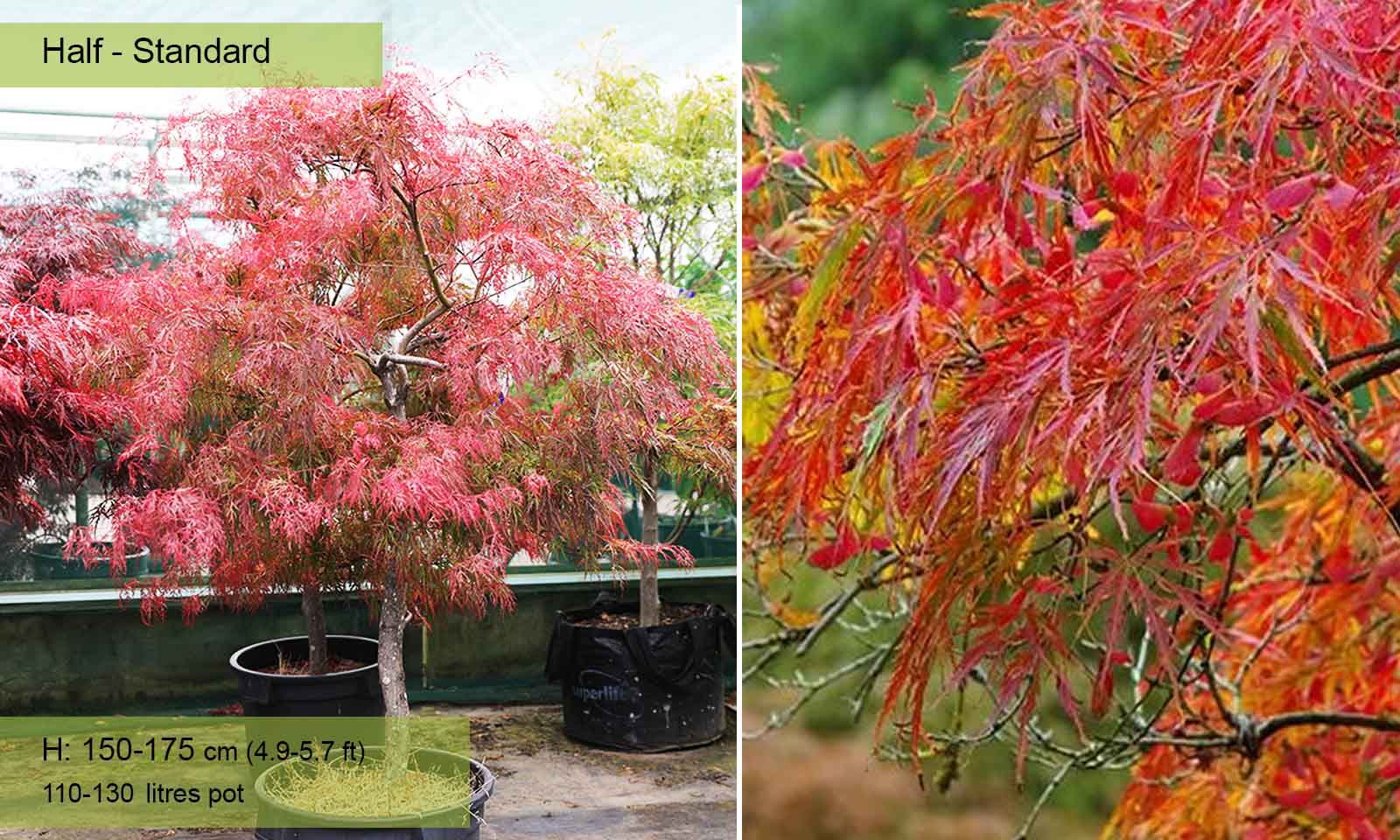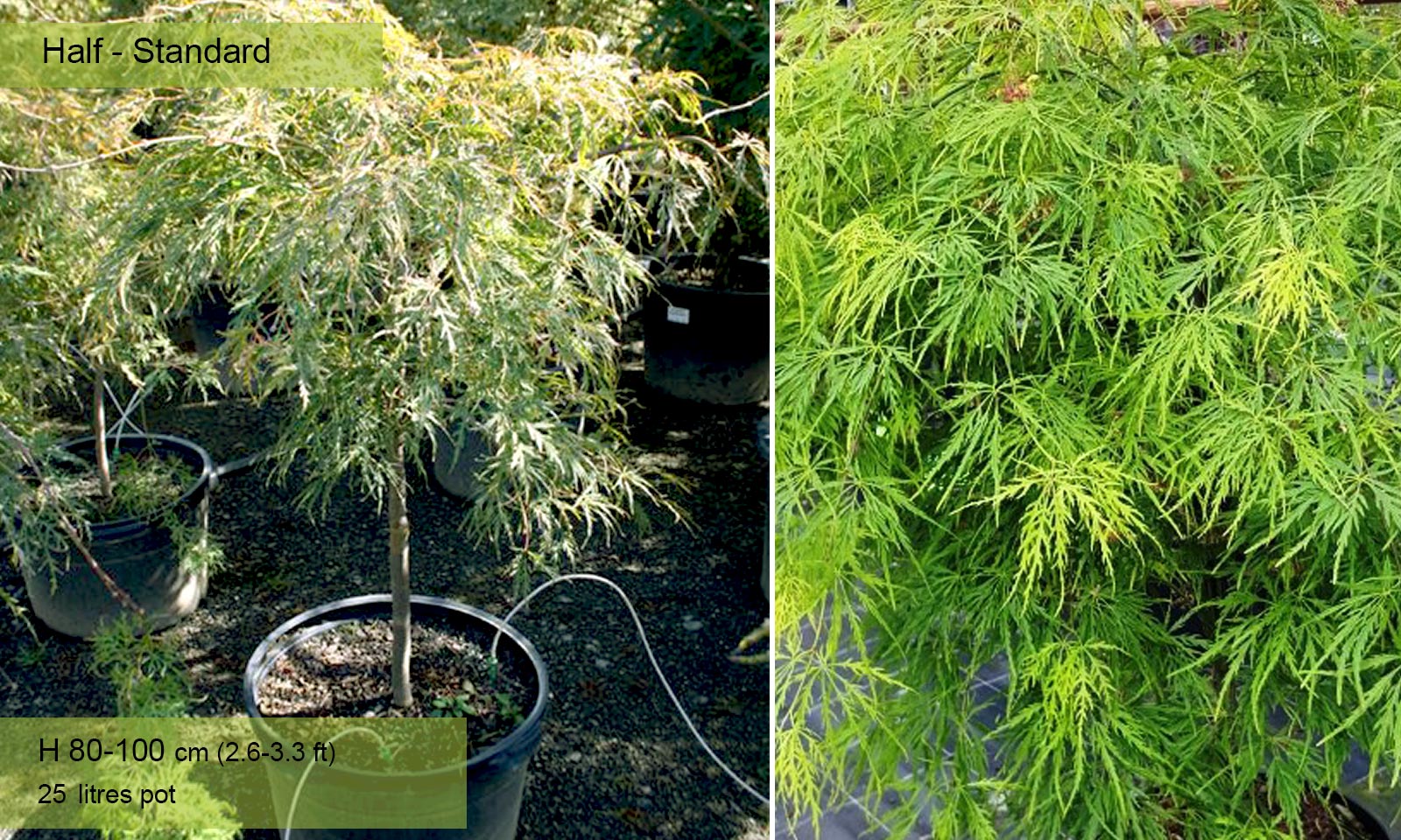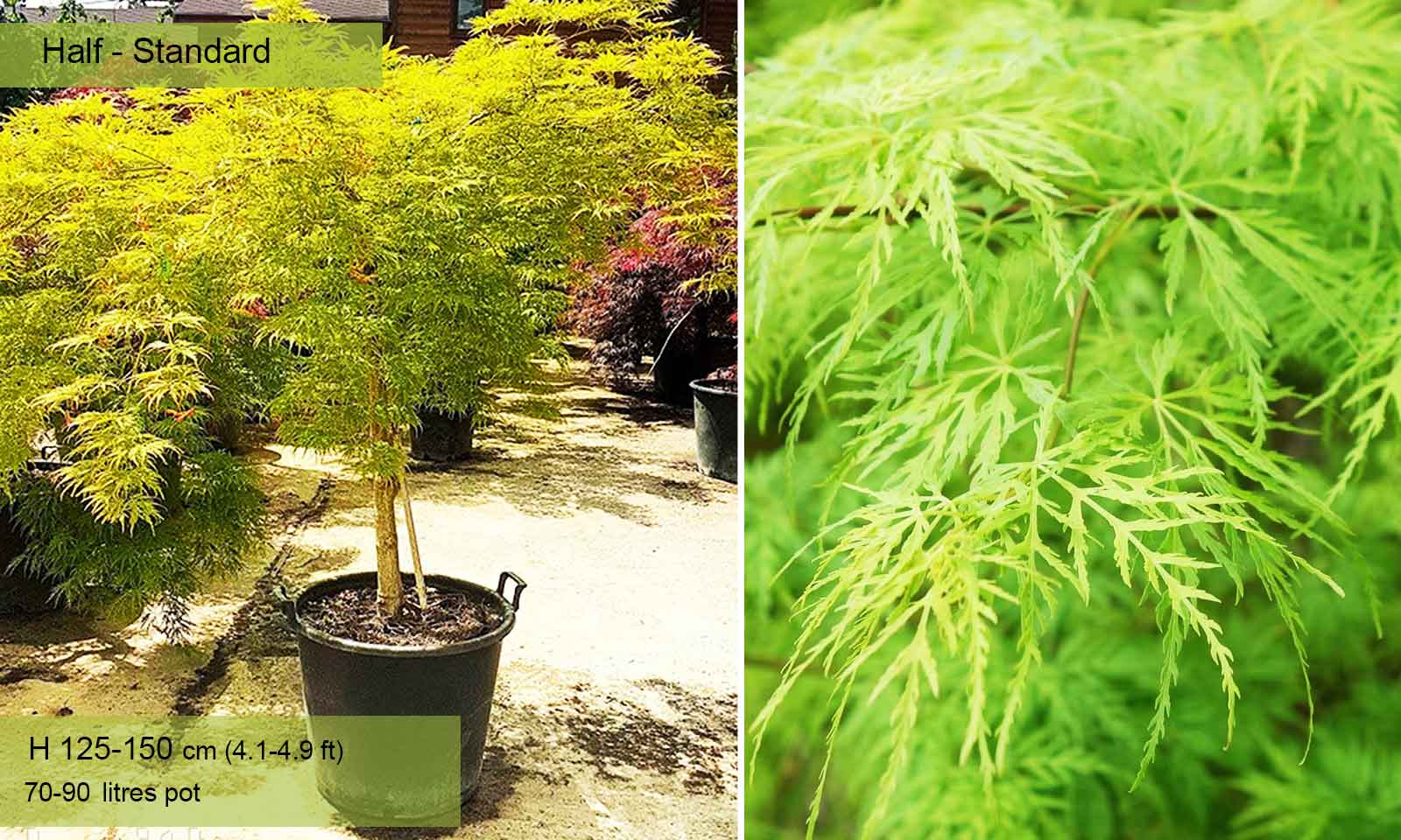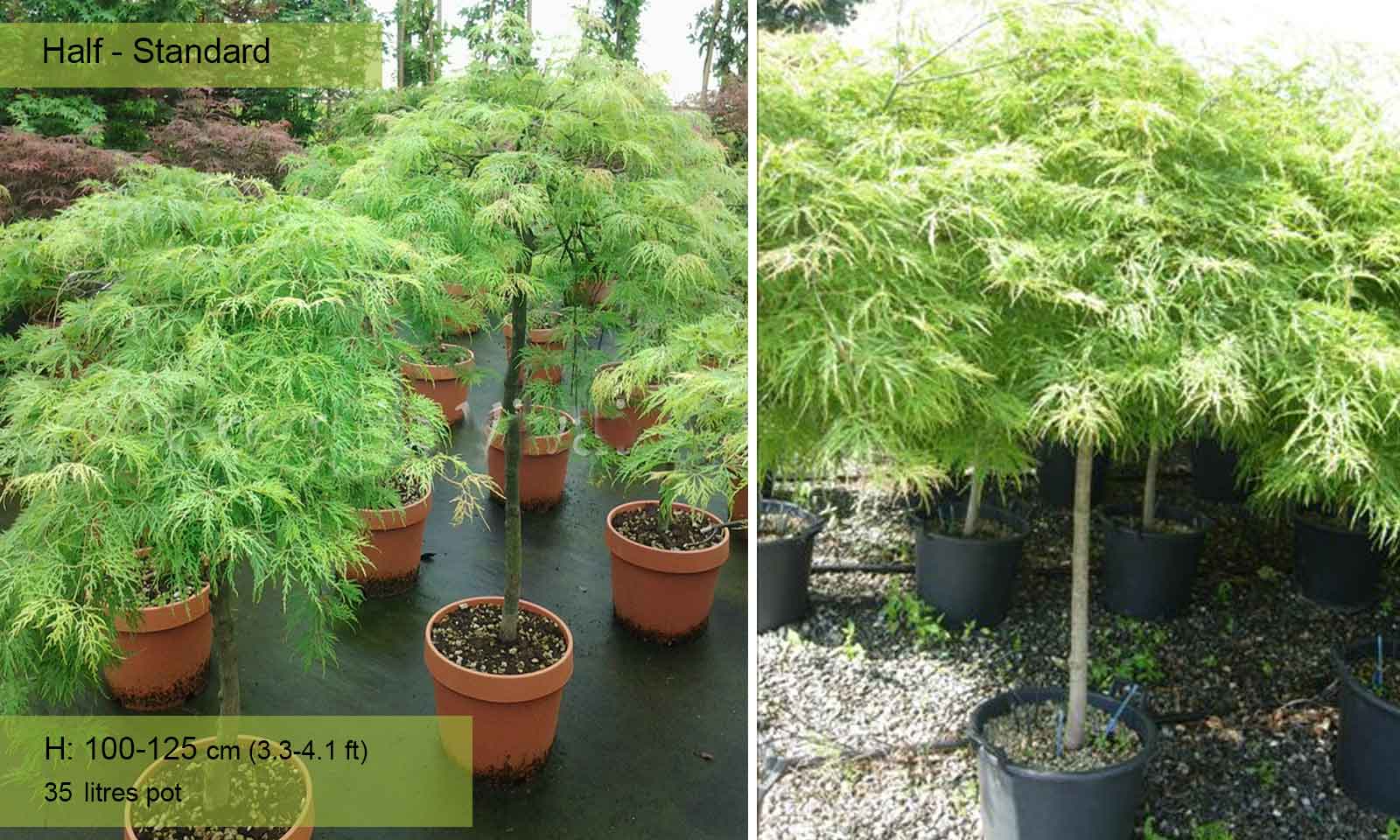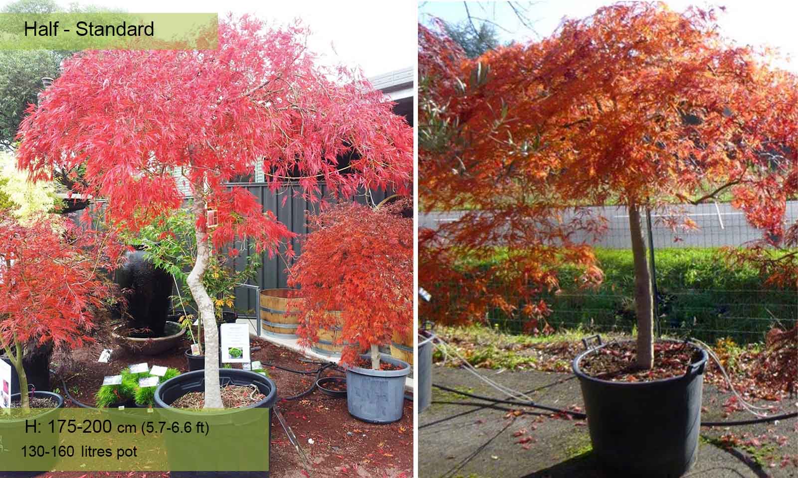 110-160 litre pot: trunk 80 – 120 cm (2.6-3.9 ft), canopy spread app. 100 – 160 cm (3.3-5.2 ft)