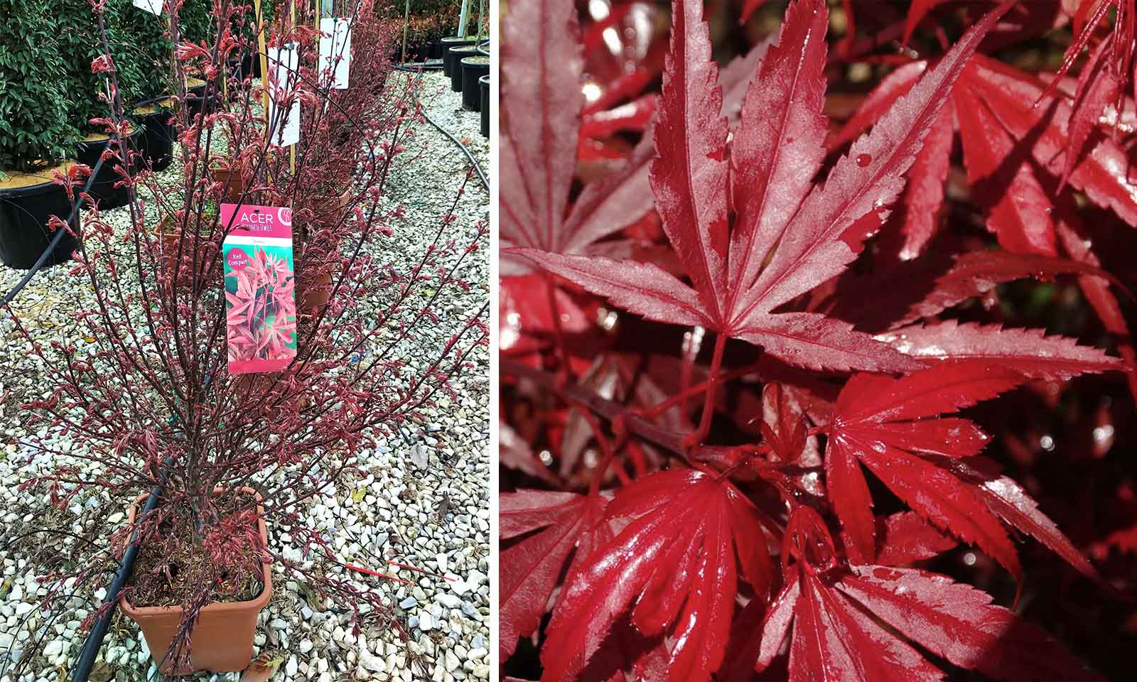 Japanese maples – shrubs, saplings or small trees, deciduous, native to Asia and very popular in Japan where, together with the flowering Cherry and Pine they are the main attraction in all parks and gardens. They have a very harmonious form, elegant leaves that create attractive, colourful symphonies that change according to the season. In spring, small, reddish-purple flowers with yellow stamens grouped in hanging clusters appear. Very attractive, bright red, winged fruits, brown when mature, follow. They grow quite rapidly when young, and then more slowly, withstand the cold but may be damaged by late frosts, especially when young.
