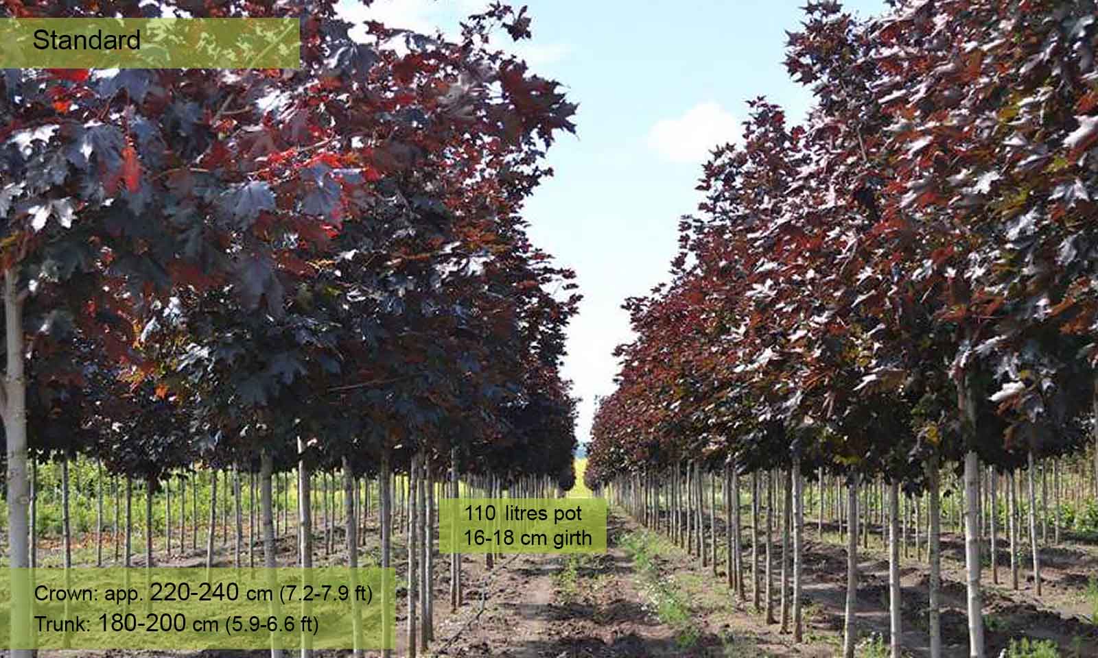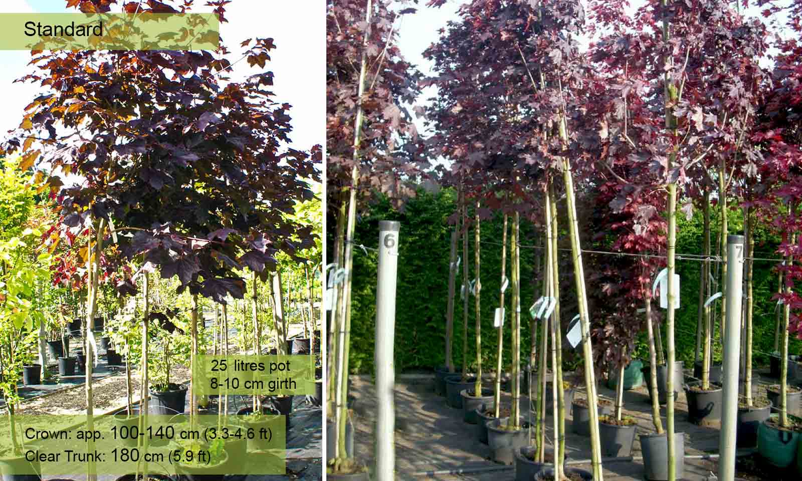 A full standard tree; deciduous with a wide conical or rounded crown. 5-lobed leaves are initially an enthralling bright red, deepening to glossy blackish-red or purple through till autumn. Flowers in erect corymbs; the red calyx making a fine contrast to the yellow petals. Fruit in October: brown samaras with open wings. This is the most vigorous of the red-leaved Acer platanoides and is effective planted on its own or in groups. It is suitable for all gardens, avenues, streets and squares. Stick to the advice of pruning group 1 for this plant. The plant is prone to potential pests and diseases so keep an eye out for this.