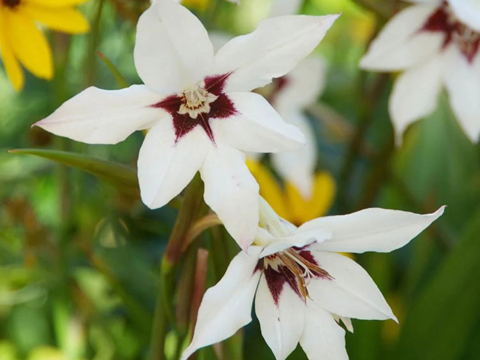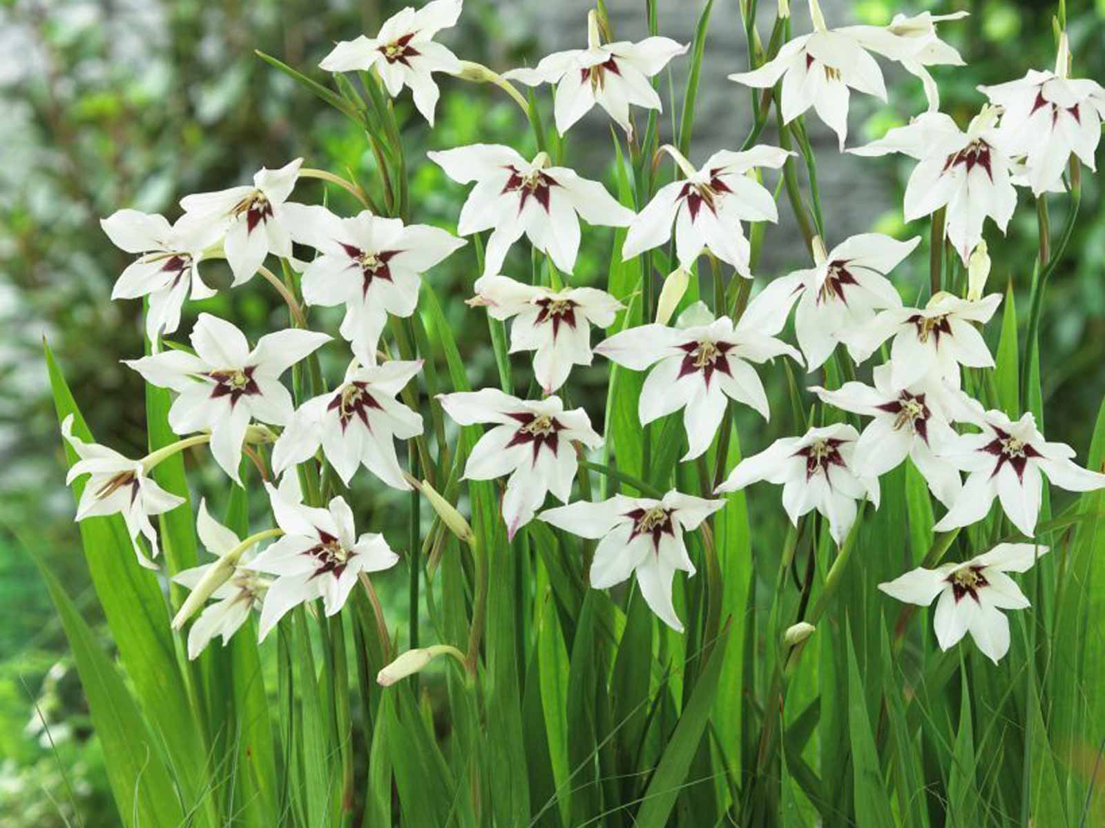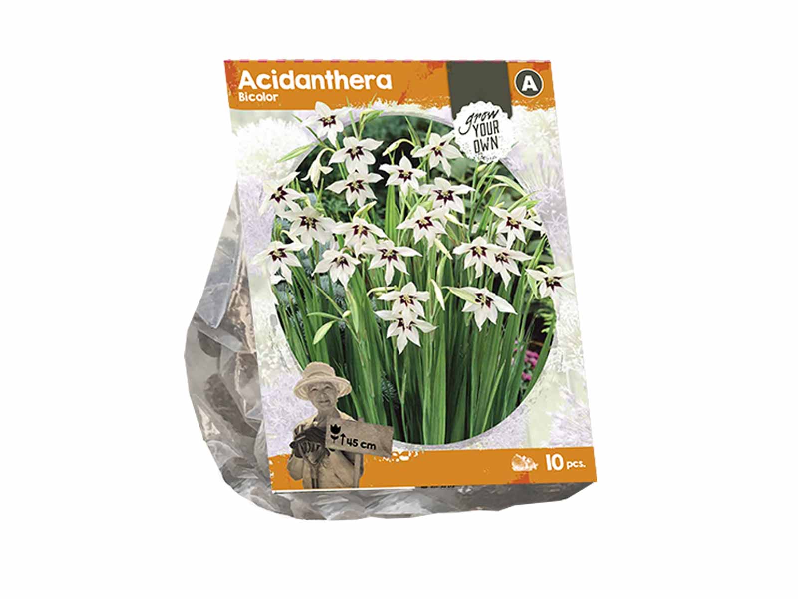 Acidanthera Bicolor is an elegant and fragrant variety with graceful, star-shaped white blooms accented by deep maroon centers. Held on slender stems above narrow, sword-like foliage, the flowers exude a delicate beauty and sweet perfume, making them a refined addition to borders, beds, and containers. This striking plant brings a touch of exotic charm and gentle movement to any garden display.