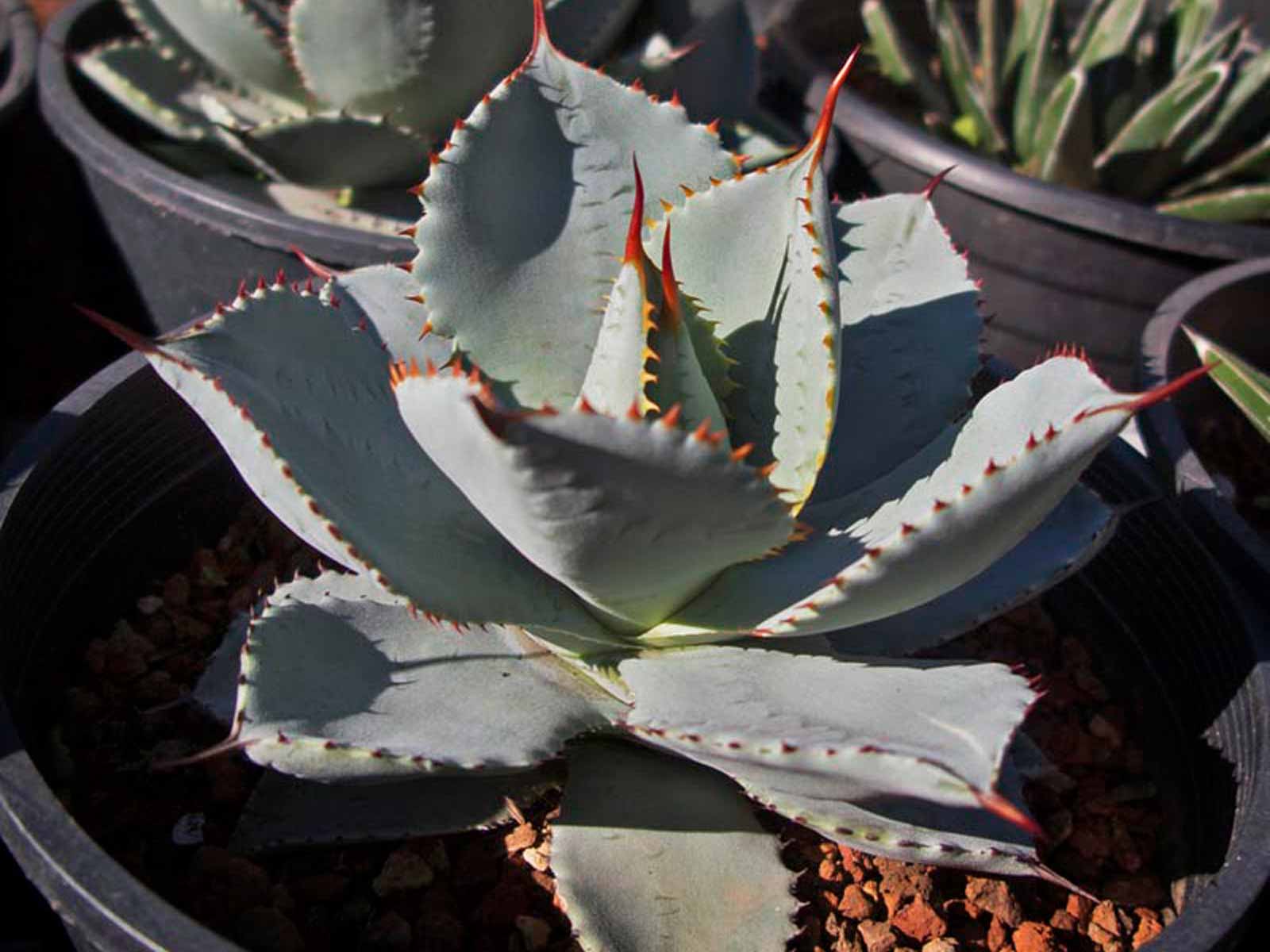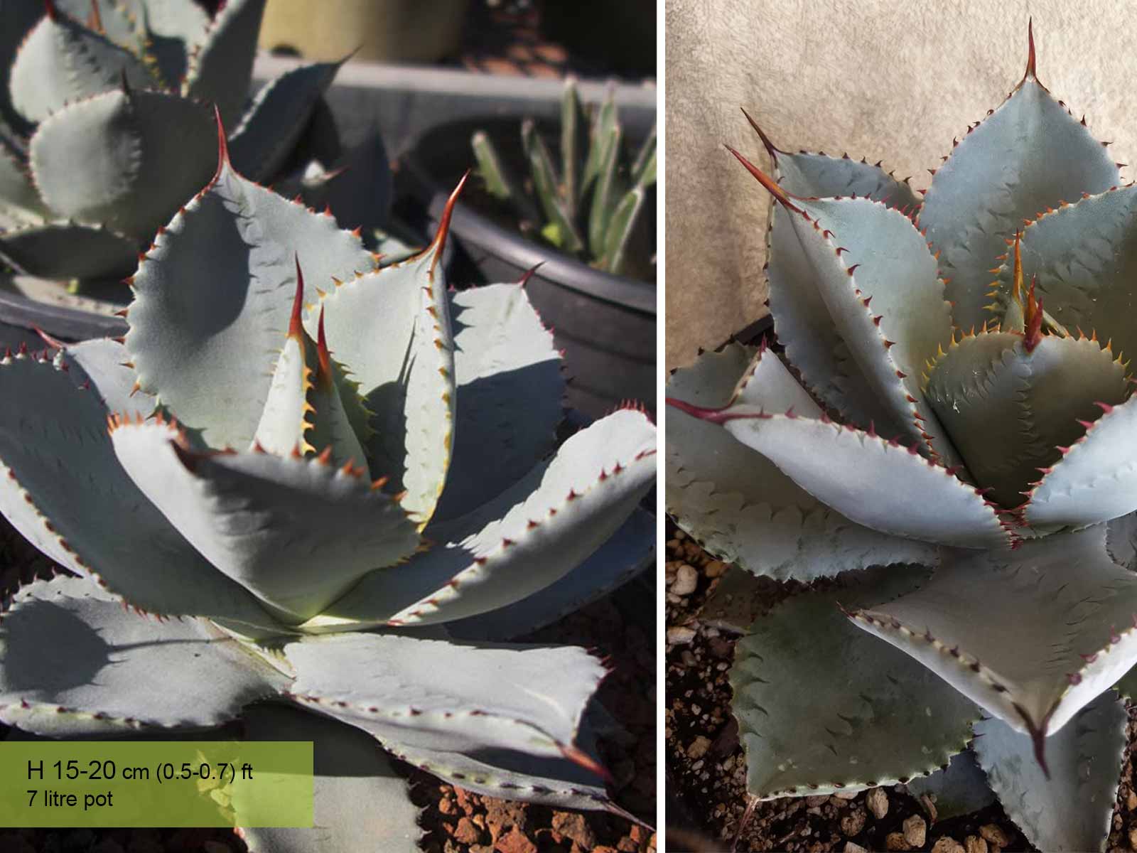 Genus of succulent, mostly native to the hot and dry regions of Mexico southern states of North America, now naturalised to the Mediterranean area. The leaves are arranged in a rosette. They are fleshy with a thorn at the tip and often sharply toothed at the edges. After many years it produces inflorescences of pale yellow, bell-shaped flowers at the end of extremely long stalks. Agave Pygmaea is a dwarf agave that often develops rosettes with some offsets. It is part of the variable complex of Agave Seemanniana and might merely be a depauperate form, a consequence of its arid, limestone habitat. Leaves are glaucous or gray-green. Water thoroughly when soil is dry to the touch. In winter watering this plant can be done once every 1-2 months, there is no need to mist the leaves.