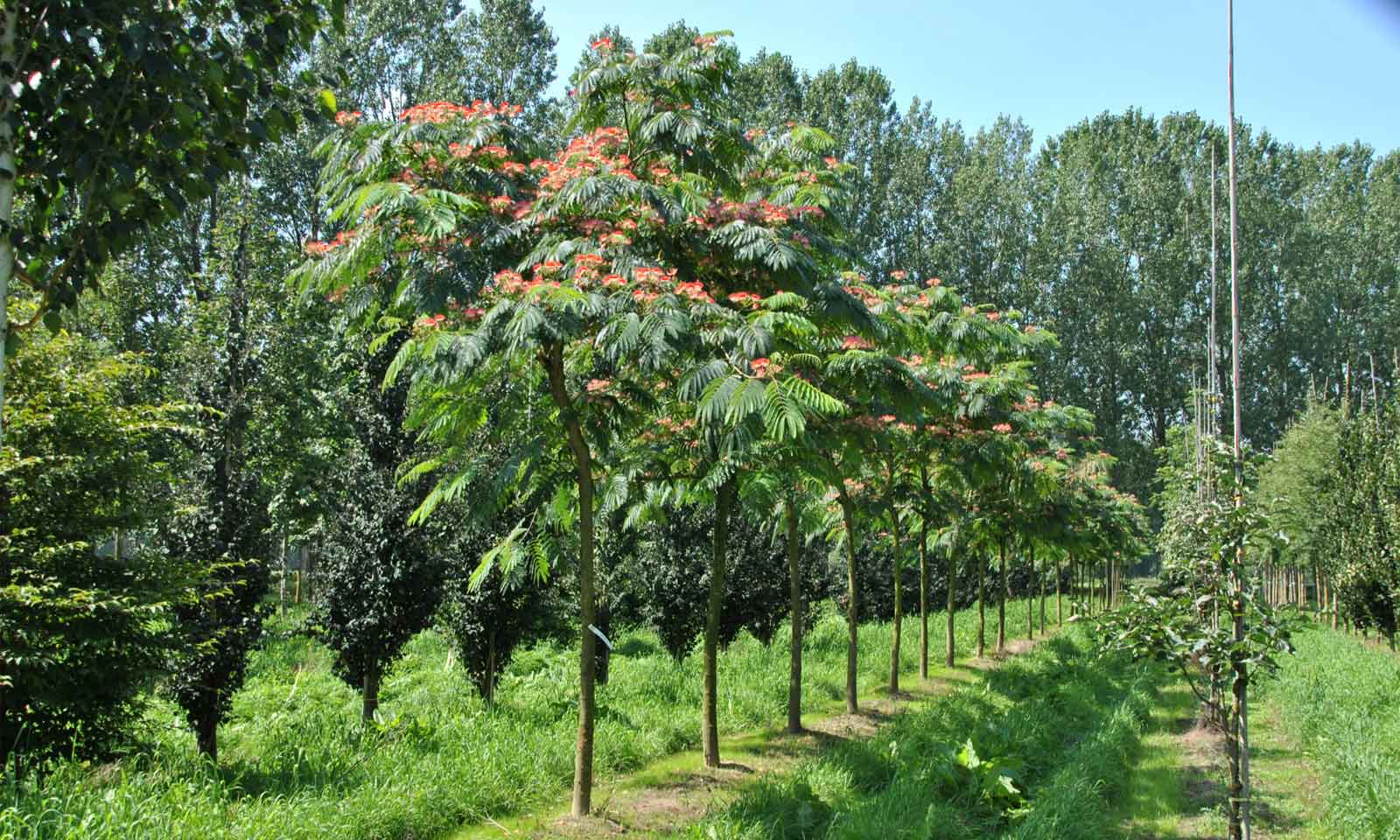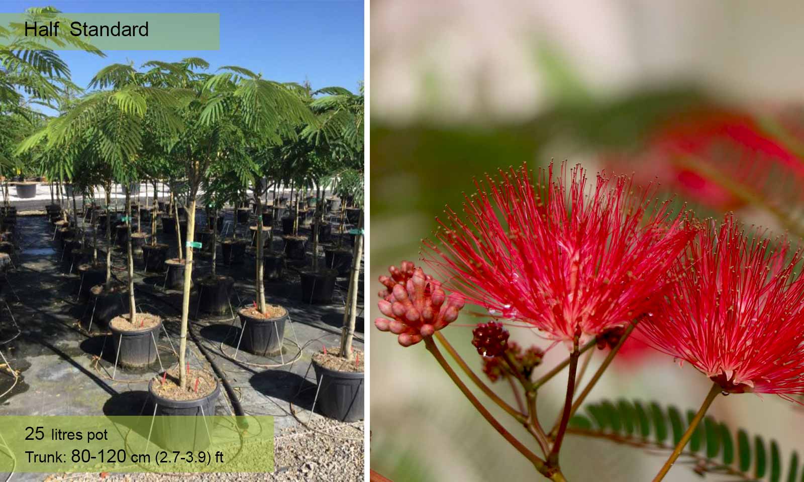 Selected in France from a seedbed of Albizia Julibrissin. Deciduous tree with dome-shaped crown, very broad. Elegant leaves composed of leaflets similar to fern. Continuous flowers (after just 2 years) from July to September in panicles that have at least 10 short stalks which end in a round head made up of tiny red stamens, yellow at the base. Fruit: green pods, 8-15 cm long, pendulous, brown when mature which last a long time on the plant. Grows well even in poor soil. It requires warmth and light in order to flower.