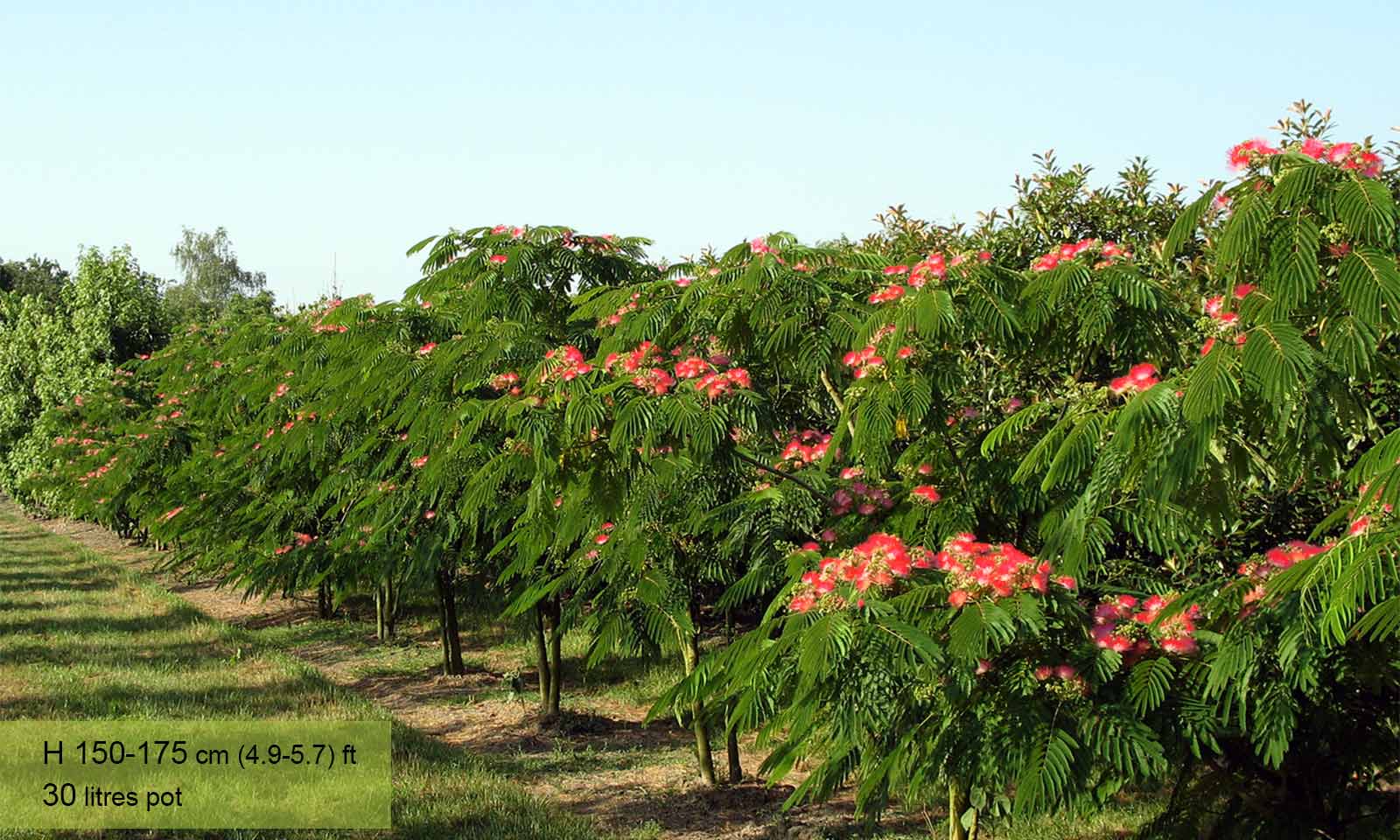 Selected in France from a seedbed of Albizia Julibrissin. Deciduous tree with dome-shaped crown, very broad. Elegant leaves composed of leaflets similar to fern. Continuous flowers (after just 2 years) from July to September in panicles that have at least 10 short stalks which end in a round head made up of tiny red stamens, yellow at the base. Fruit: green pods, 8-15 cm long, pendulous, brown when mature which last a long time on the plant. Grows well even in poor soil. It requires warmth and light in order to flower.