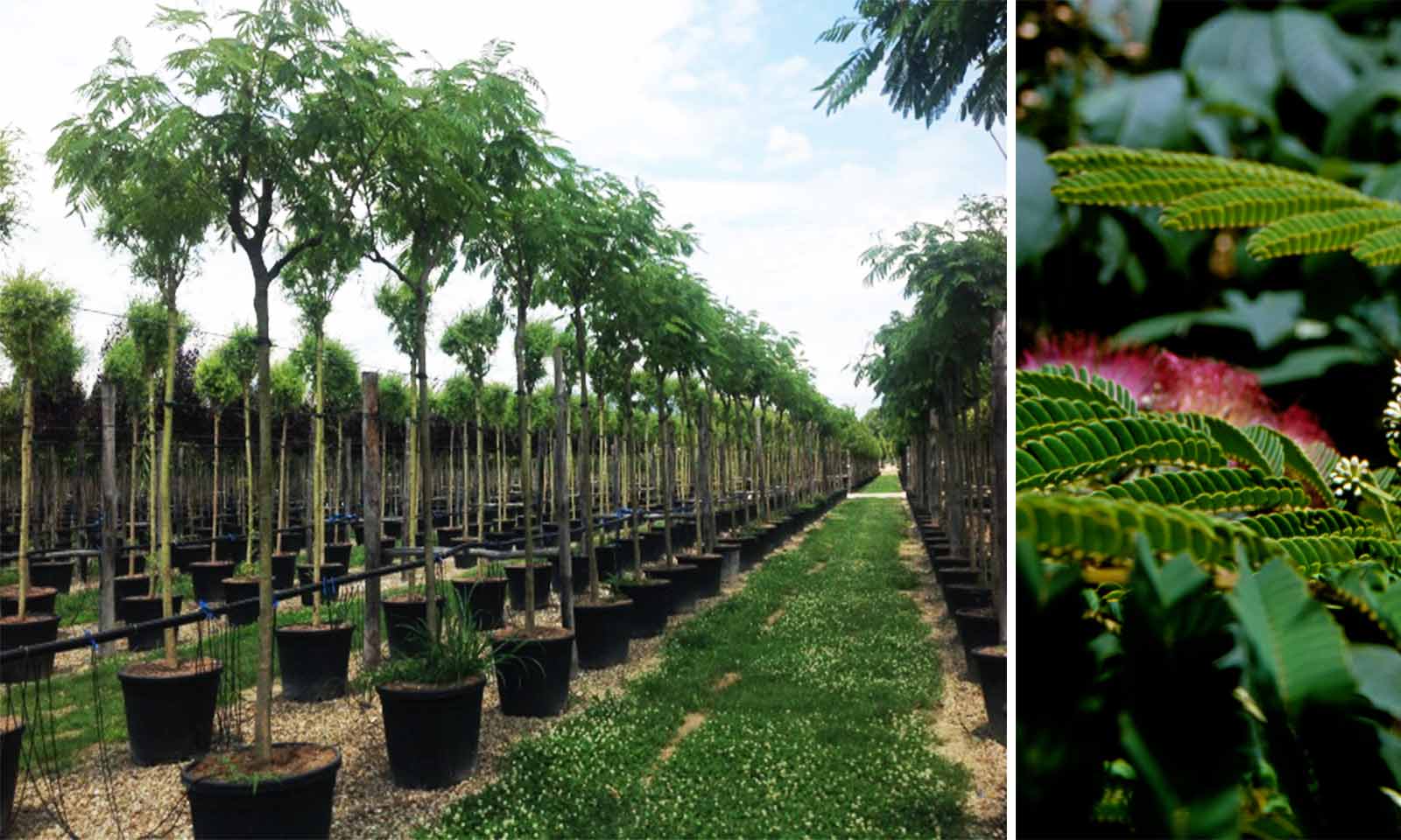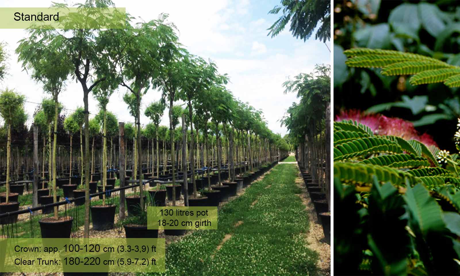 Selected in France from a seedbed of Albizia Julibrissin. Deciduous tree with dome-shaped crown, very broad. Elegant leaves composed of leaflets similar to fern. Continuous flowers (after just 2 years) from July to September in panicles that have at least 10 short stalks which end in a round head made up of tiny red stamens, yellow at the base. Fruit: green pods, 8-15 cm long, pendulous, brown when mature which last a long time on the plant. Grows well even in poor soil. It requires warmth and light in order to flower.