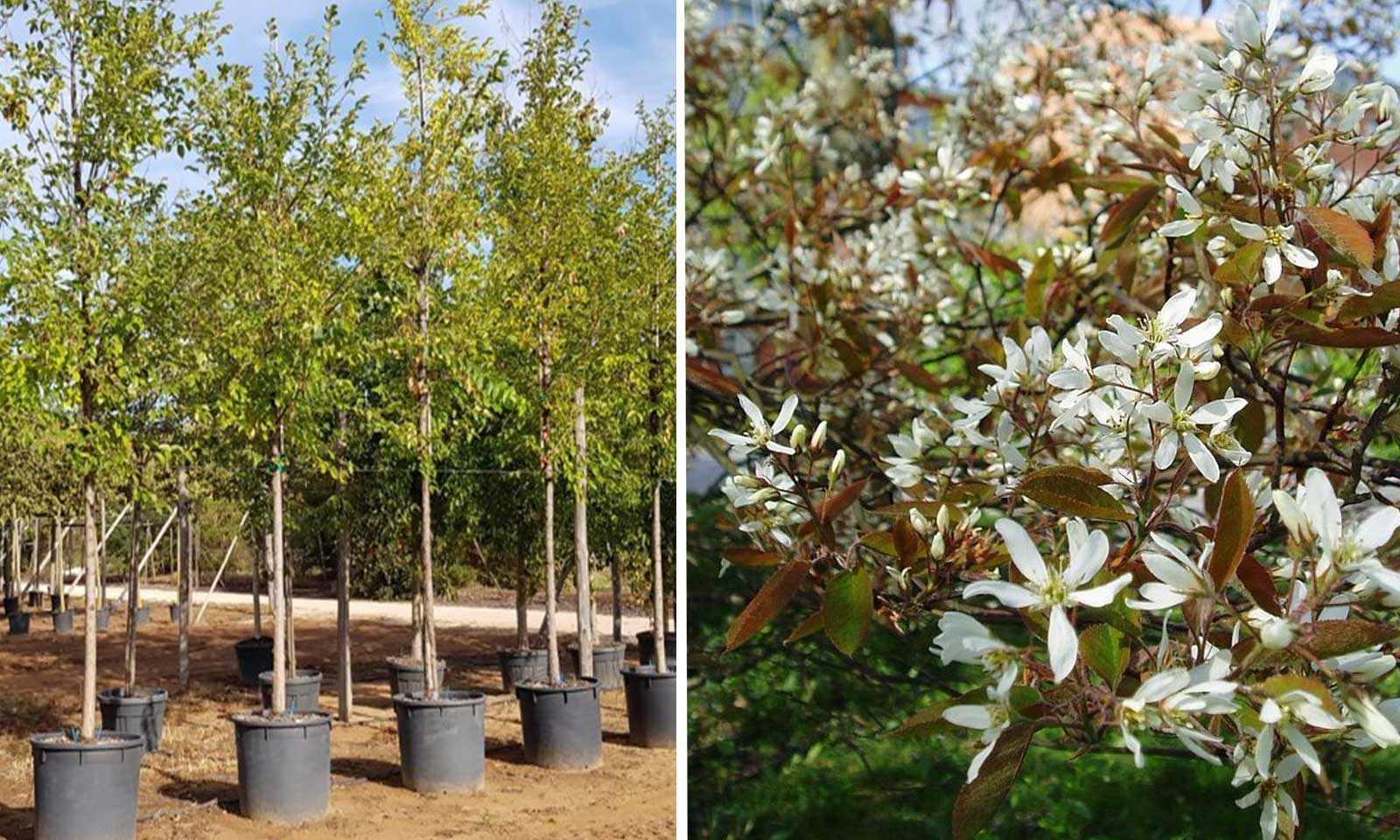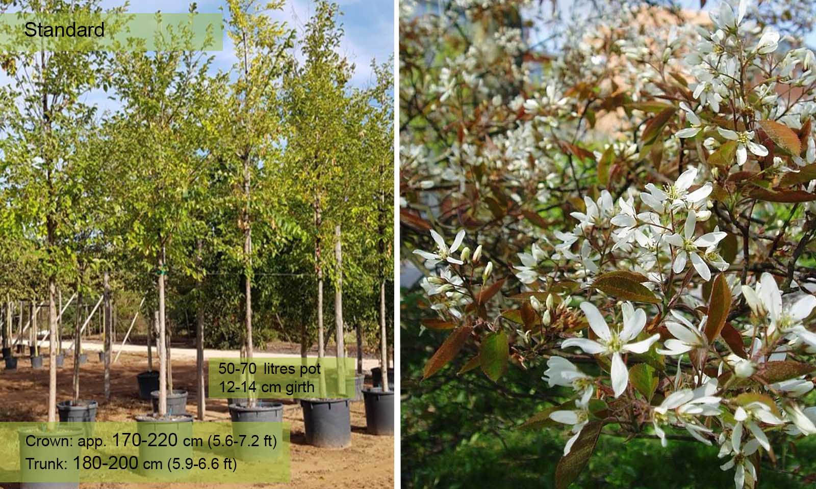 ‘Amelanchier Laevis’ is an upright shrub or tree, up to 8m high, with oblong hairless leaves which are coppery pink when they emerge, become mid-green in summer, then turn yellow flushed with red in autumn. Hanging, nodding clusters of large, fragrant, starry-white flowers in spring are followed in summer by edible, sweet, blue-black fruits, up to 1.5 cm long. Grows in moist, well-drained, lime-free soil; will grow in sun or partial shade but autumn colour will be brightest in full sun.