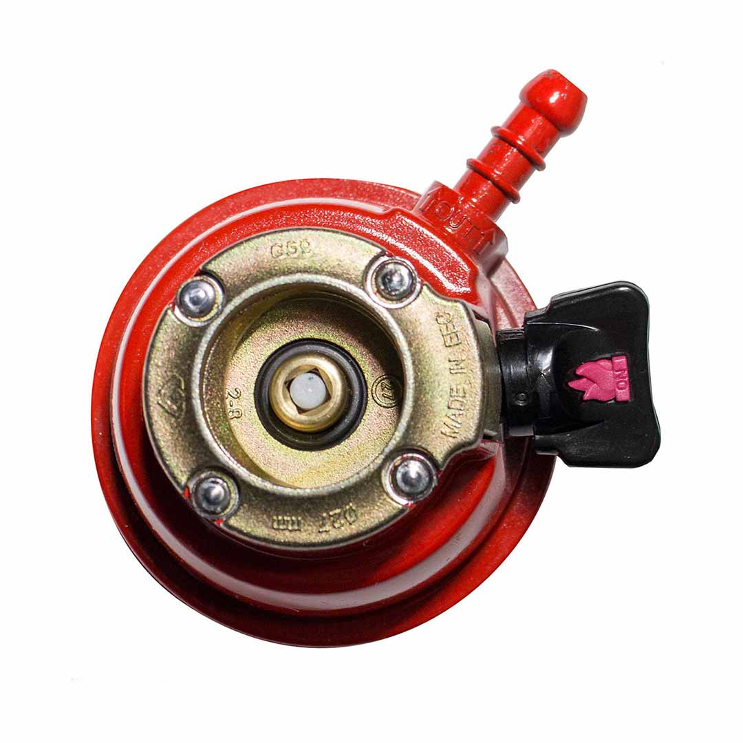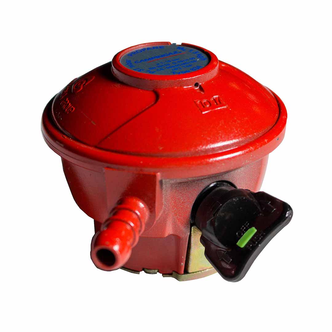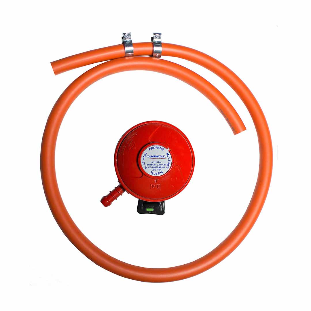 A Campingaz Patio Gas 37-mbar Low-Pressure Propane Gas Regulator with hose and clips. Regulates the rate and flow of gas from the cylinder to the barbeque.