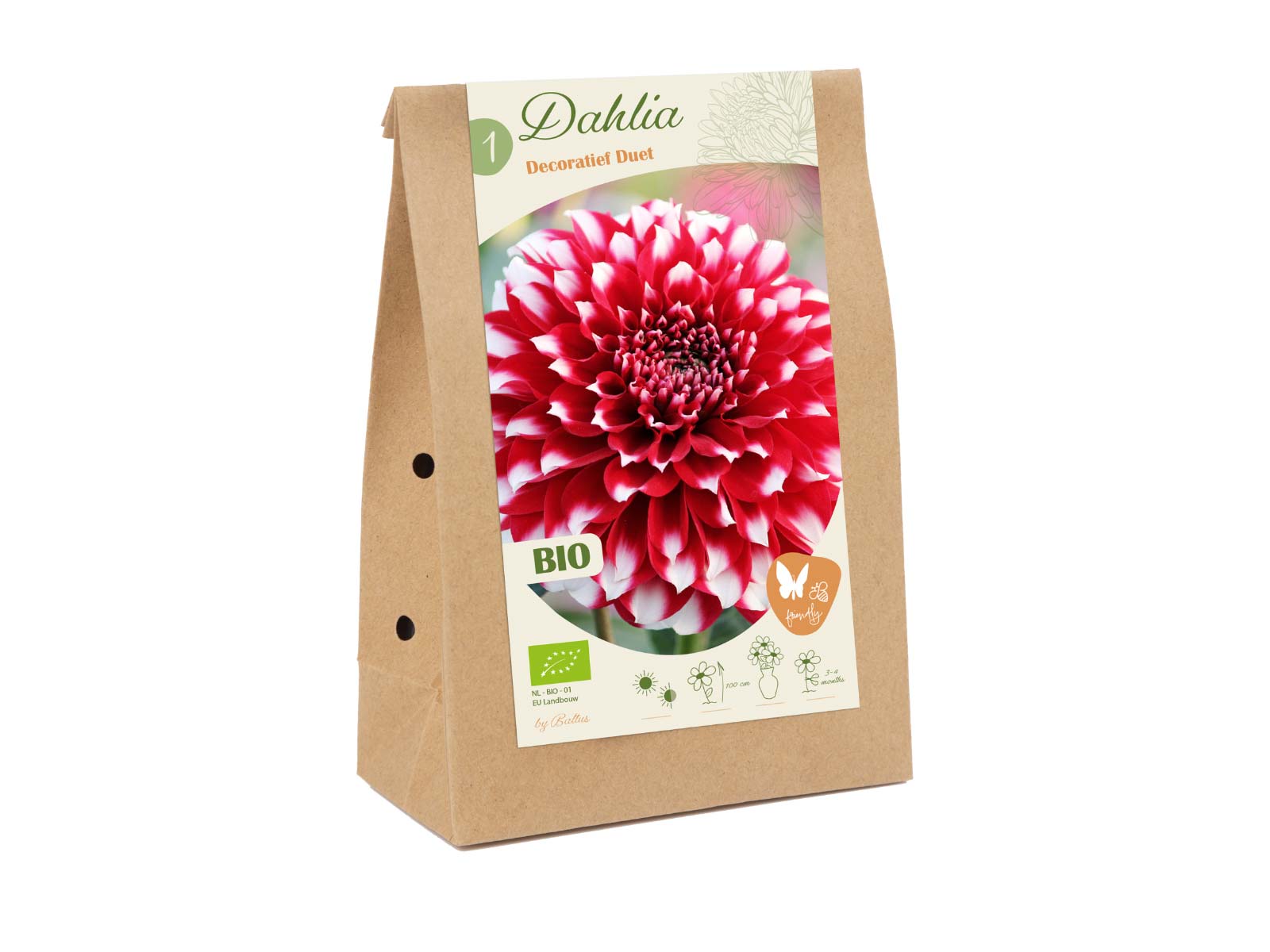 Bio Dahlia ‘Duet’ is a striking, free-flowering variety with bold, bi-color blooms featuring deep burgundy petals elegantly tipped in crisp white. Its fully double, decorative flowers create a dramatic contrast, making it a standout choice for borders, beds, and cut flower arrangements. The rich, velvety tones add sophistication and depth to any garden display.