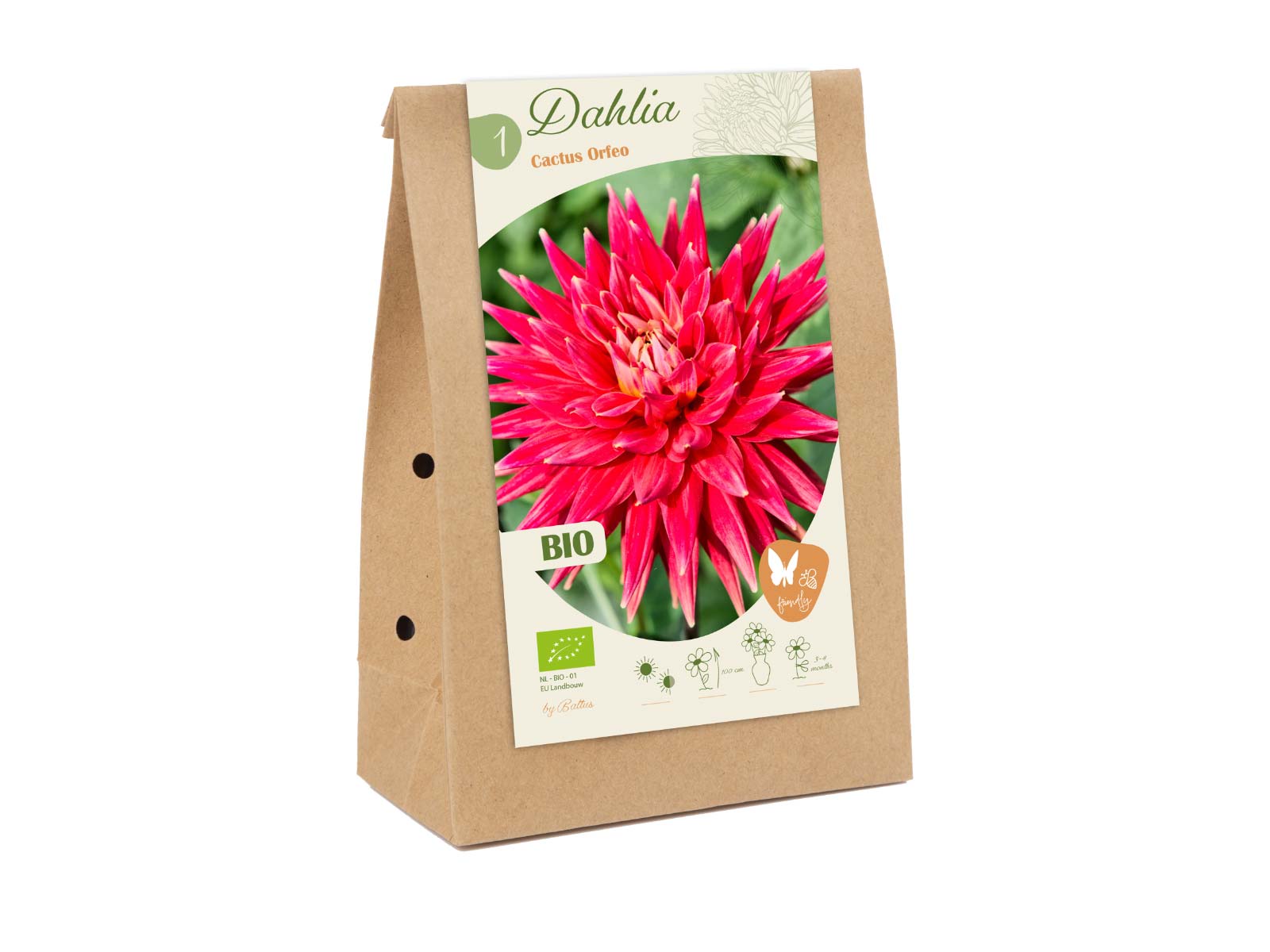 Bio Dahlia ‘Orfeo’ is a striking, free-flowering variety with deep, velvety red blooms that add a touch of drama and sophistication to any garden. Its fully double flowers and rich, bold color make it a standout choice for borders, beds, and cut flower arrangements. The intense red petals contrast beautifully with lush green foliage and complement both warm and cool-toned flowers in mixed plantings.