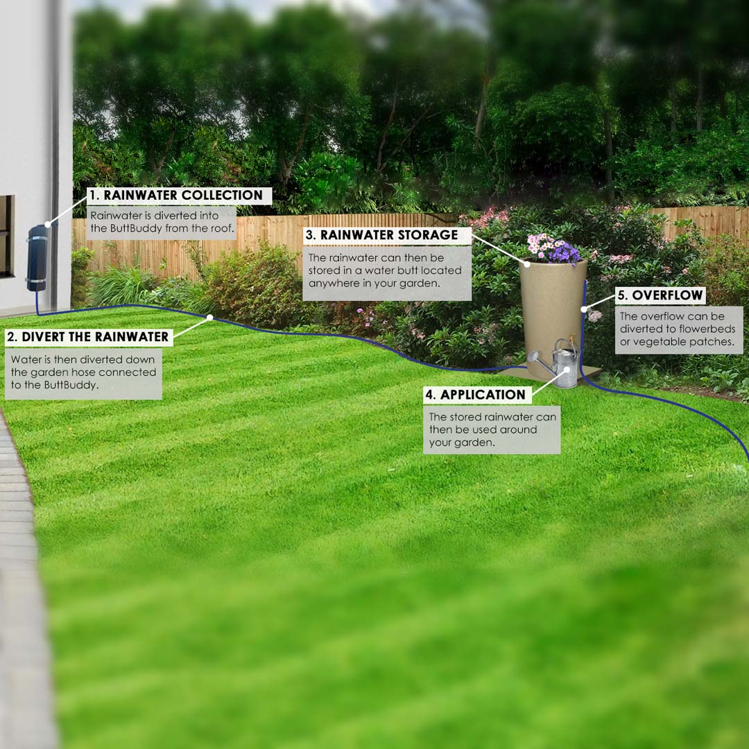 - The rainwater can ten be stored in a Water Butt located anywhere in your garden