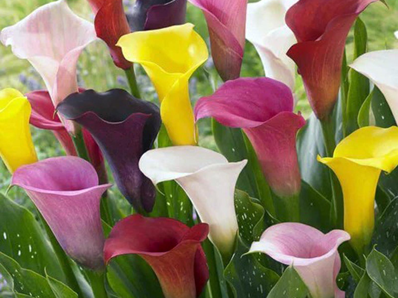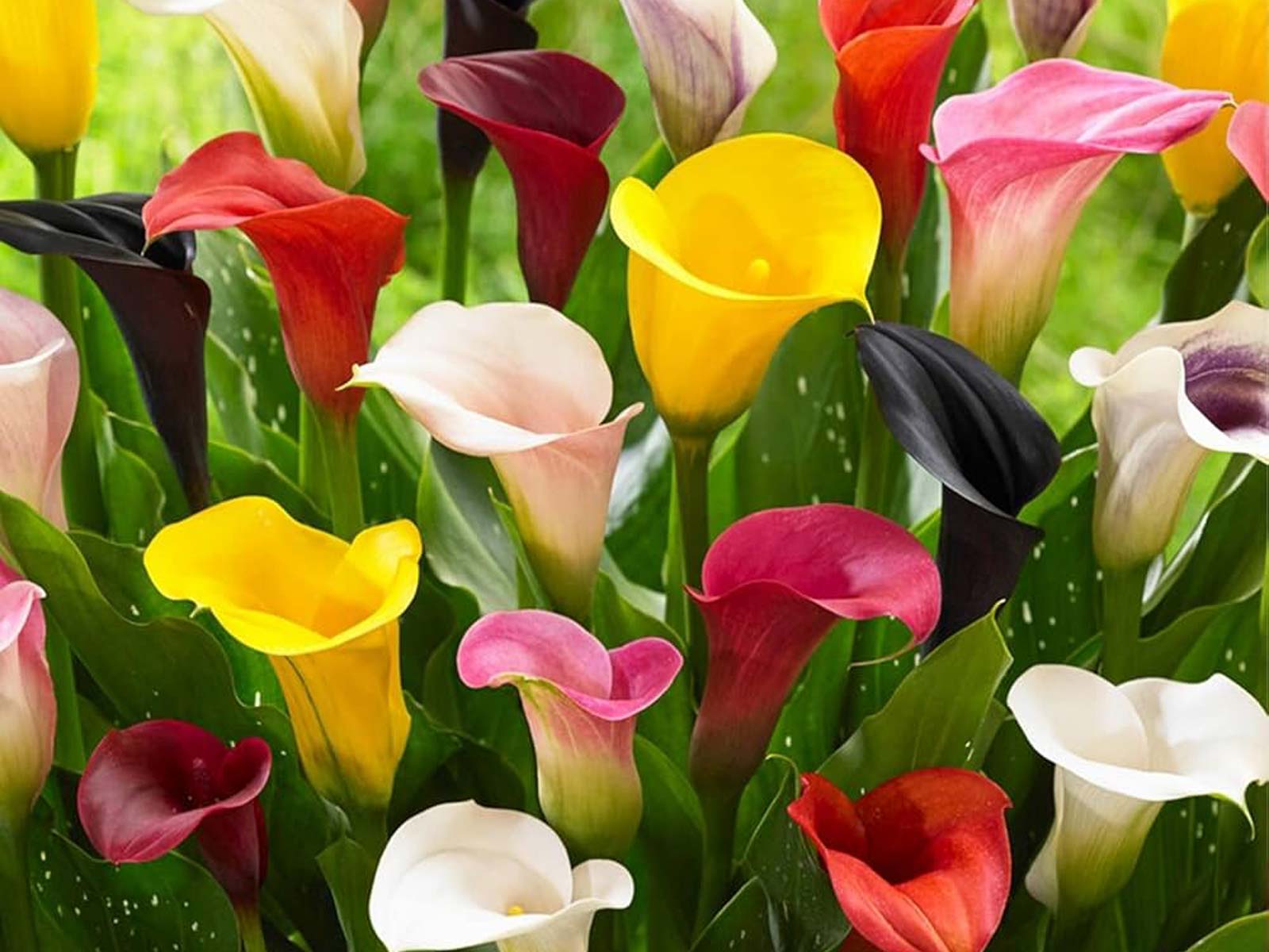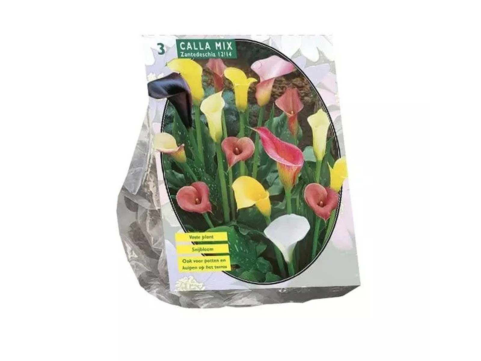 Calla Zantedeschia Mix is a stunning collection of calla lilies, featuring a vibrant blend of trumpet-shaped blooms in shades of white, yellow, pink, purple, and deep red. Rising above lush, dark green foliage speckled with white, these elegant flowers bring a touch of sophistication to borders, beds, and containers. Their long-lasting blooms also make them an excellent choice for cut flower arrangements.