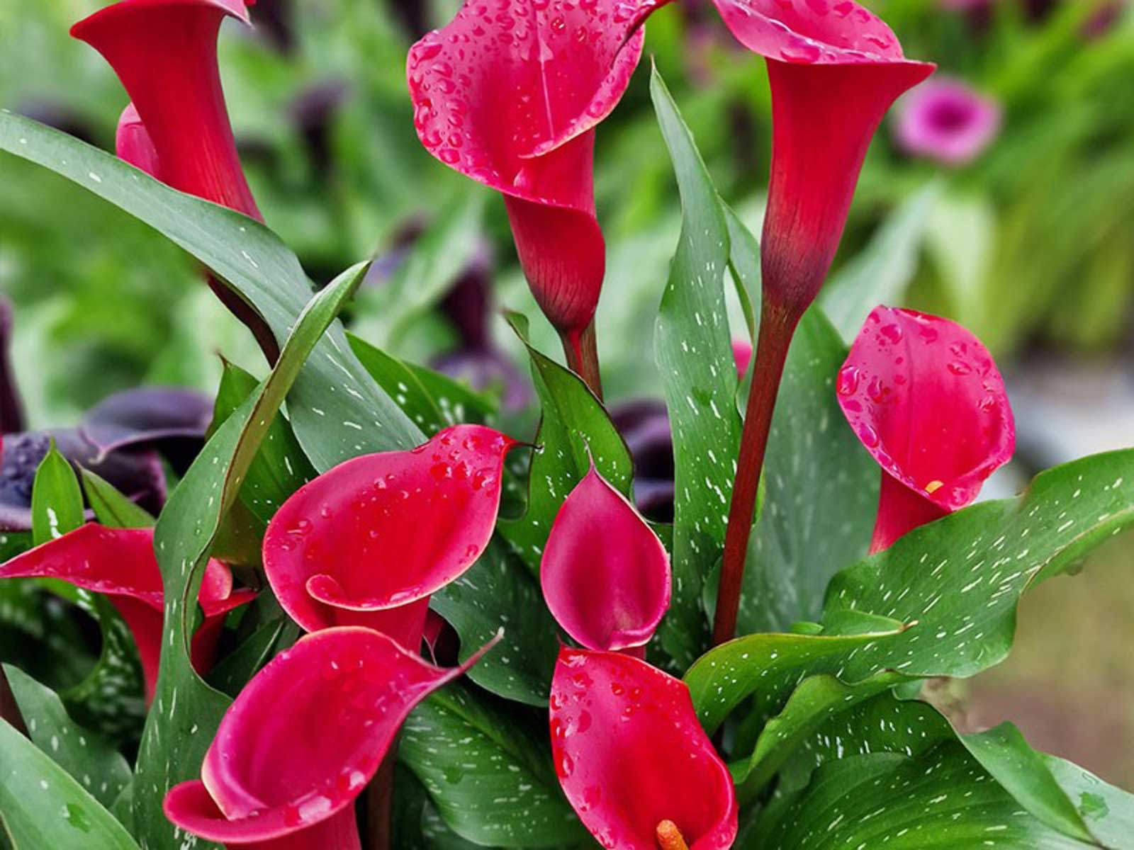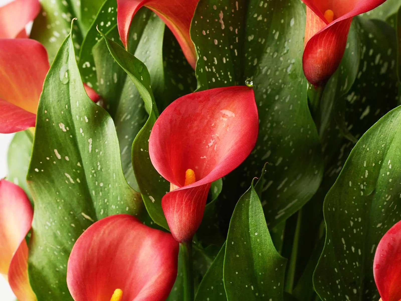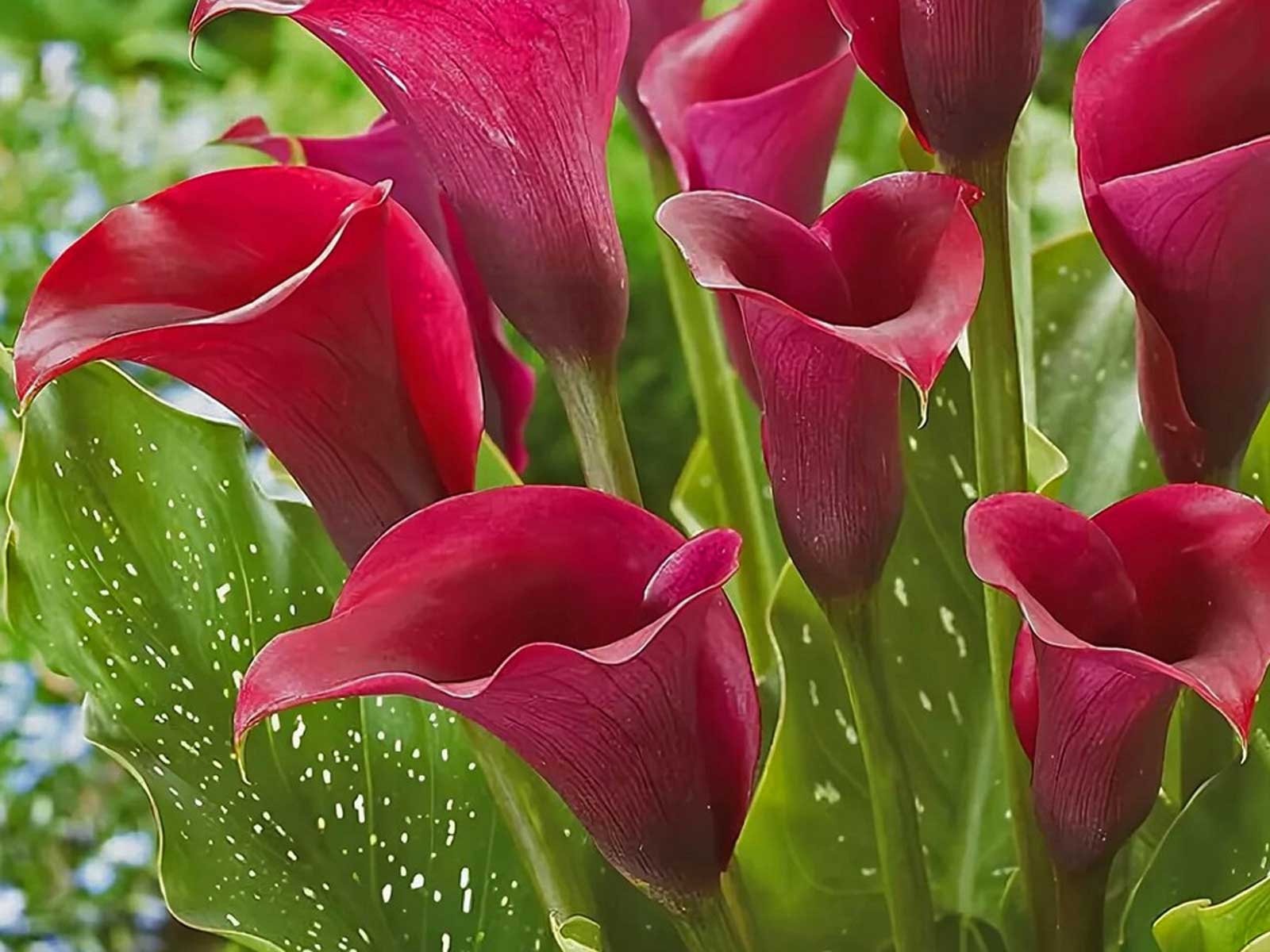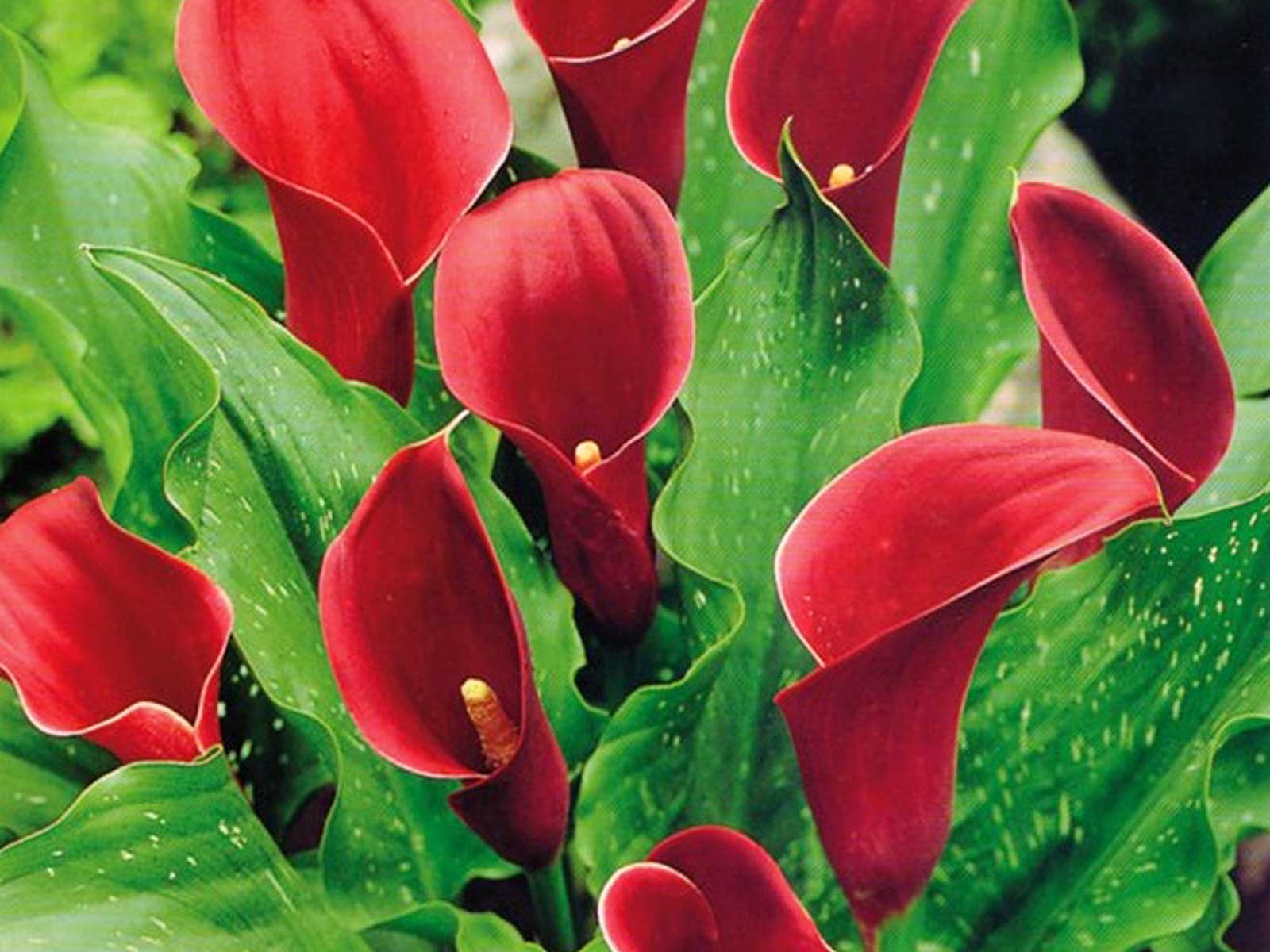 Calla Zantedeschia ‘Red’ is a striking variety with bold, velvety red blooms that stand out beautifully against rich green foliage. Its elegant, trumpet-shaped flowers and lush, upright leaves create a dramatic and exotic effect, making it an ideal choice for borders, beds, and containers. This captivating variety brings vibrant color and architectural flair to any garden setting.