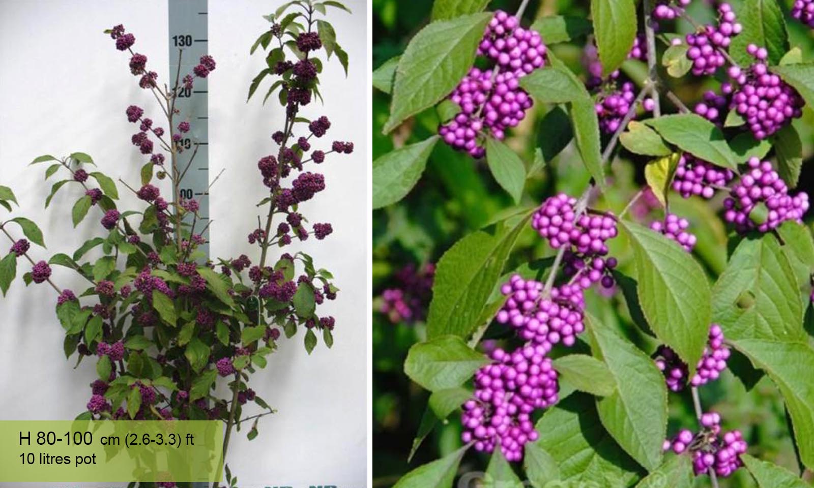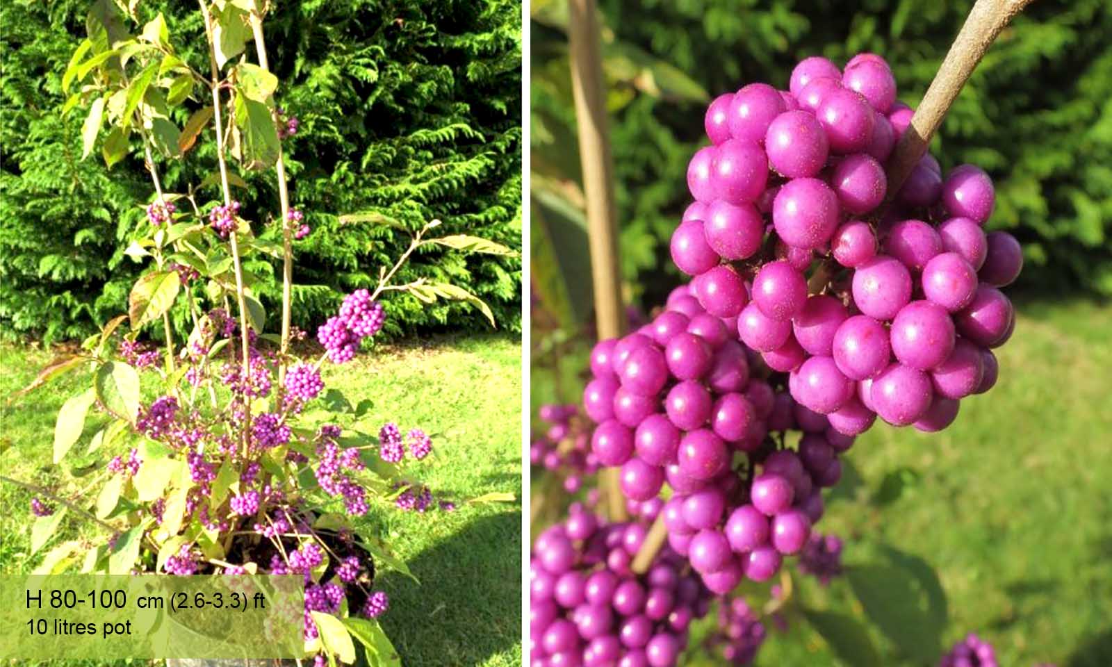 Commonly known as Beautyberry, the Calicarpa Bodinieri “Profusion” is a deciduous shrub with numerous horizontal branches. Small lilac flowers, followed by very decorative violet-blue fruit from October to January. Very hardy and grows in any type of soil; suited to all gardens and effective as hedging.