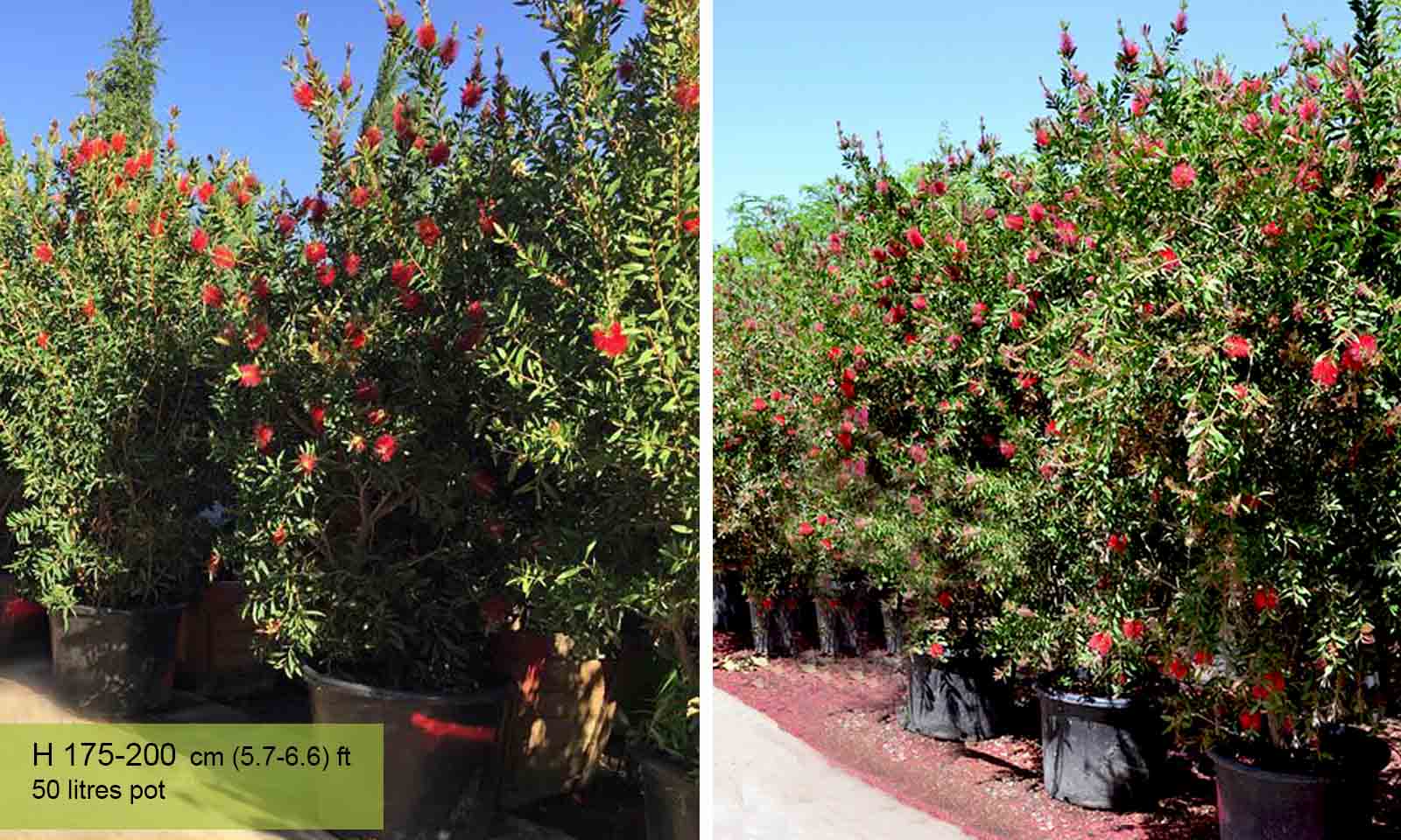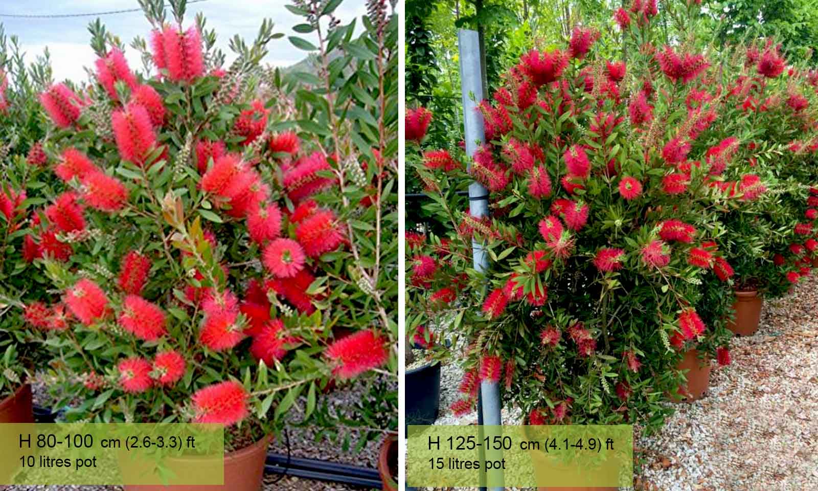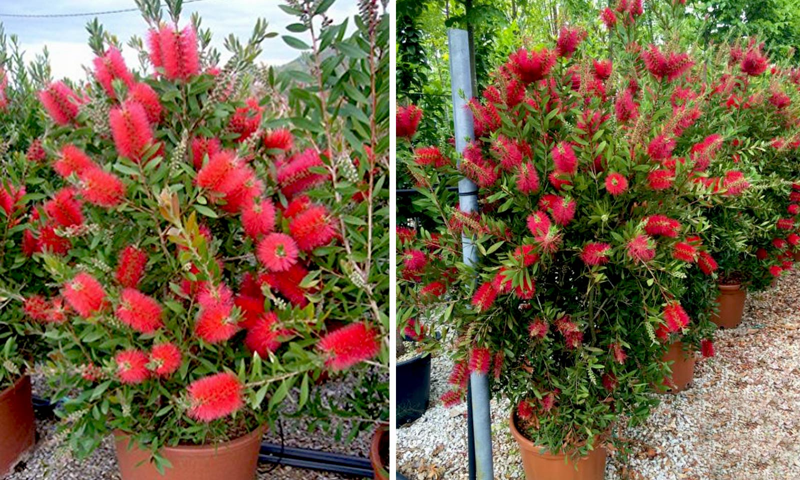 Genus comprising numerous species of evergreen shrubs and trees native to Australia which have an extraordinary elective affinity with our species of the Myrtaceae family. They have become popular in Europe because of the spectacular flowers in axillary spikes, which look like bottle brushes. In colder areas they can be grown in pots, kept under cover in winter, giving plenty of water during the flowering period, little in winter. Requires moist, well-drained soil, not calcareous. Withstands pruning and drought. Callistemon Laevis is a tall perennial shrub or small Bottlebrush tree with an evergreen crown of fine green lanceolate leaves. The abundant intense red bottlebrush flowers it produces in mid to late summer look absolutely stunning with their bright colour. The bark of Callistemon laevis is brown with a rough texture.
