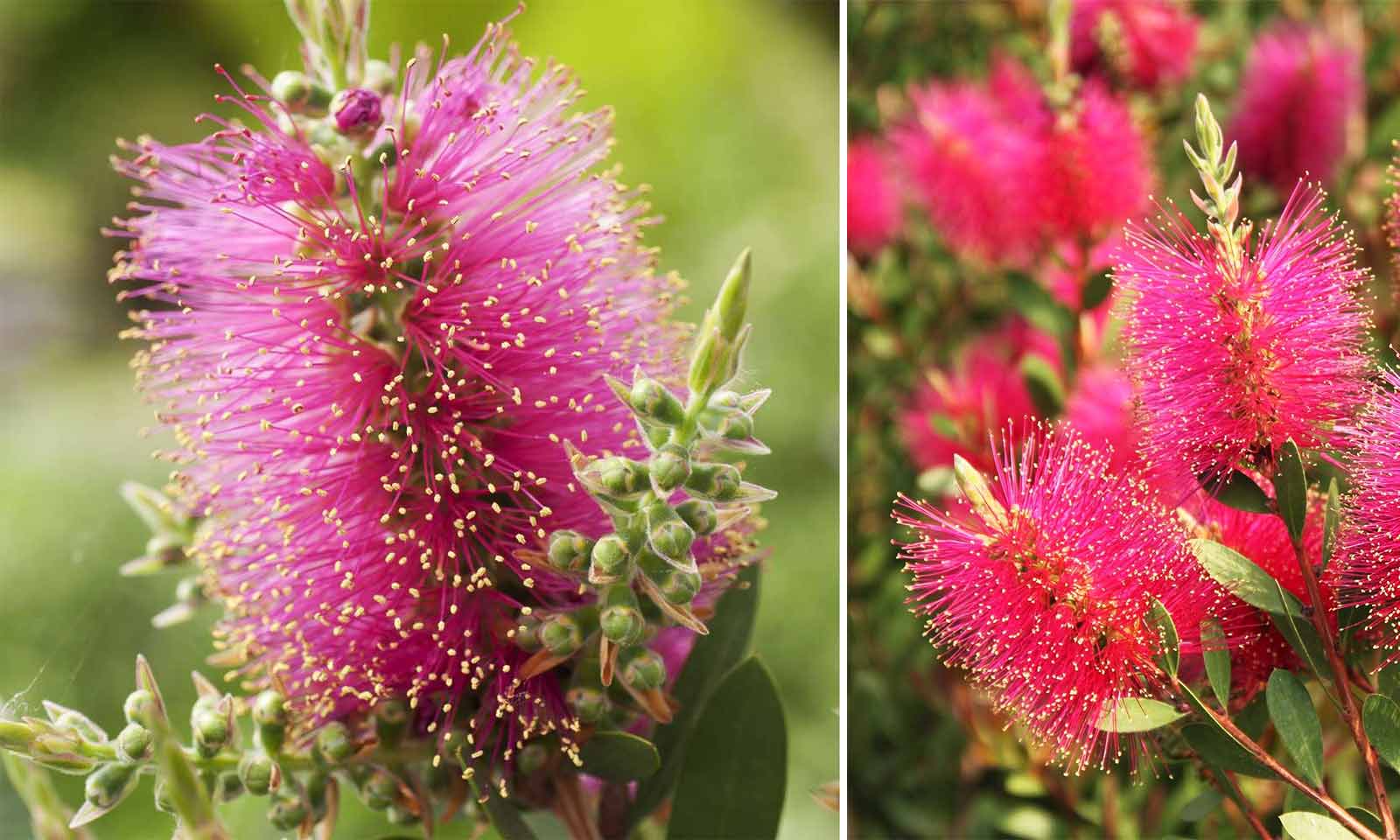 Callistemon viminalis “Hot Pink” is a stunning new variety of Bottlebrush plant with amazing bright magenta pink flowers flecked with golden highlights. Also known as ‘The Weeping Bottlebrush’, it flowers in spring, early Summer and again in the autumn if the stems are cut off under the wilted flowers. Hot Pink is a great addition to any garden as it will attract bees and other nectar sucking insects like butterflies into the garden throughout the summer.