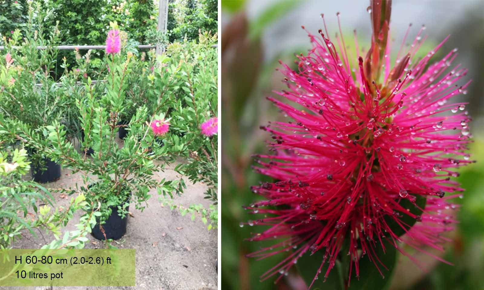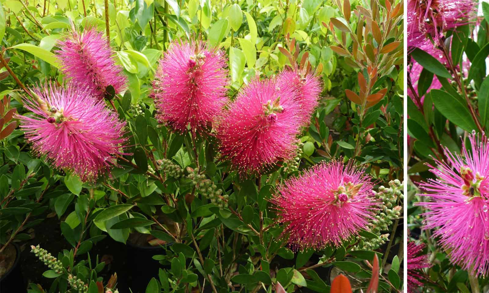 Callistemon viminalis Hot Pink suits smaller urban gardens as it is a compact medium sized bottlebrush bush reaching about 1.5m in height. Its foliage is also very attractive, with red coloured young shoots that develop into narrow grey-green leaves that last all winter. Hot Pink creates a bright eye-catching display that will definitely make an impact whether grown in a large container or planted in a border.Callistemon Hot Pink is a cross of Callistemon Citrinus Splendens (formerly Endeavour) and Callistemon Pallidus. Unlike most Callistemon varieties which originate from Australia, Hot Pink comes from South Africa.