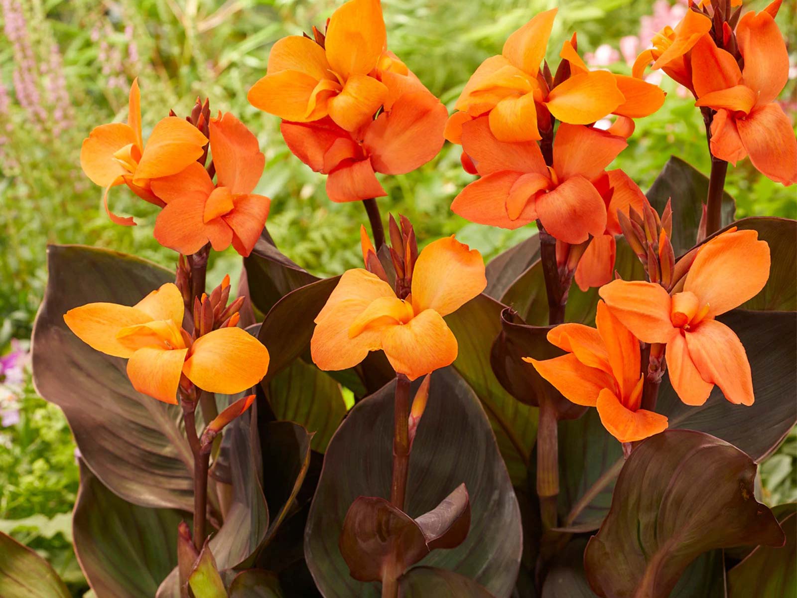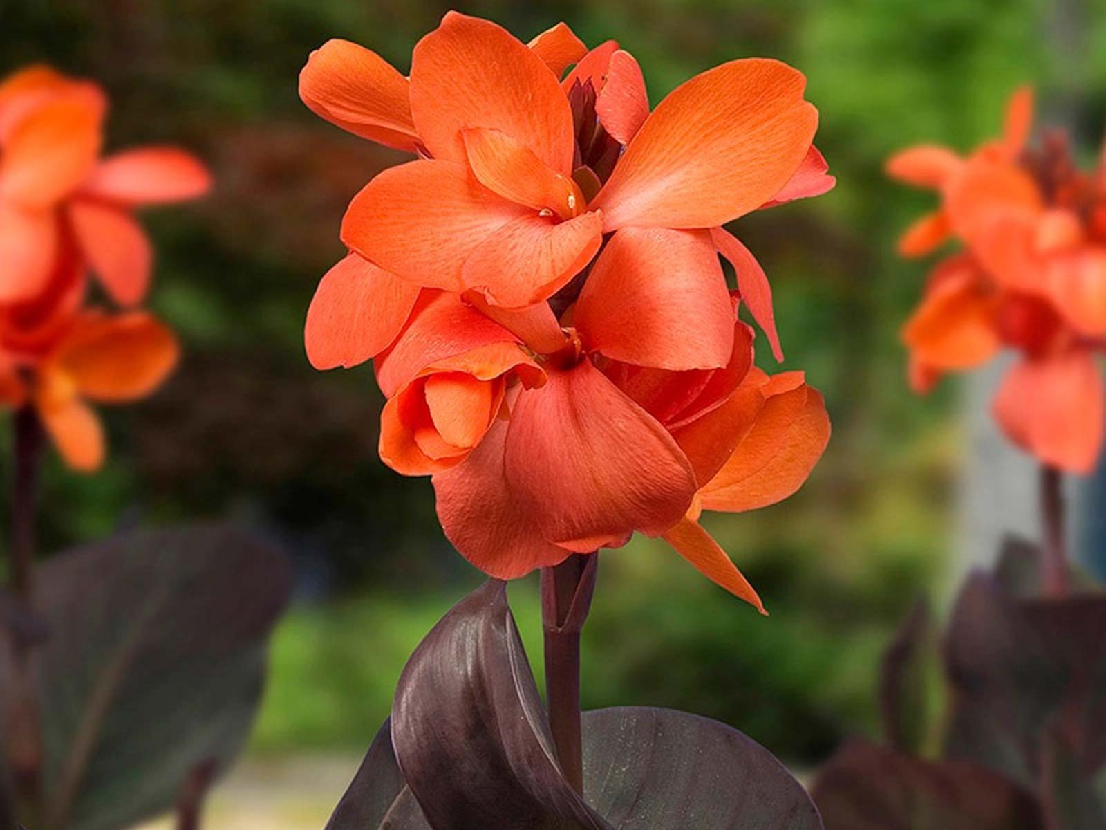 Canna ‘Brown Leaved Orange’ is a striking variety with bold, fiery orange blooms that contrast beautifully against deep bronze-brown foliage. Its large, tropical flowers and lush leaves create a dramatic, exotic effect, making it a perfect choice for borders, beds, and containers. This eye-catching variety adds vibrant color and architectural interest to any garden.