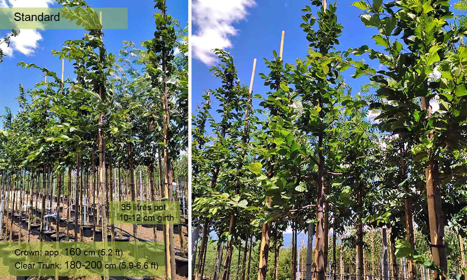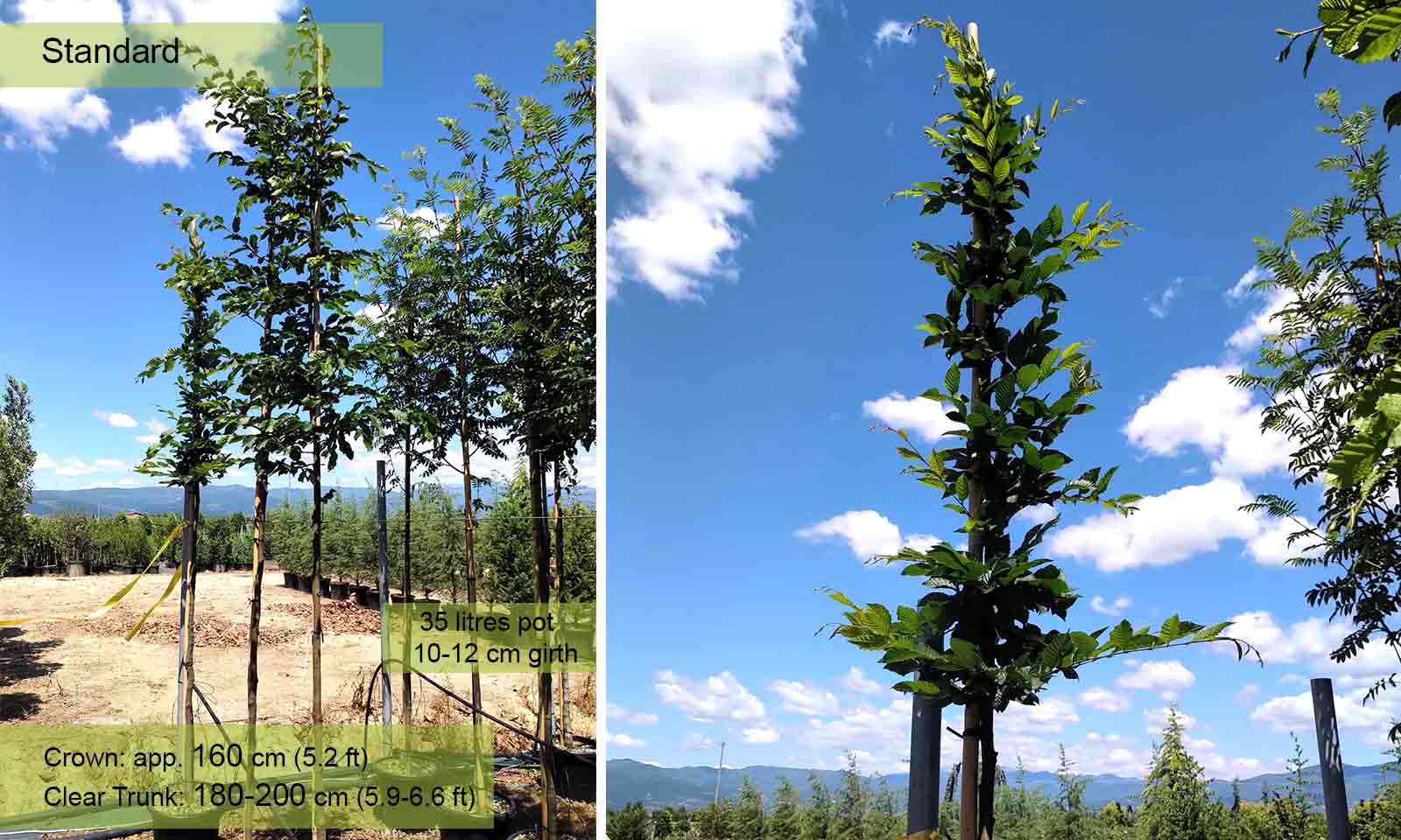 12-14 cm: 35 litre pot, trunk – 180-200 cm (5.9-6.6 ft), crown – 180 cm (5.9 ft)
