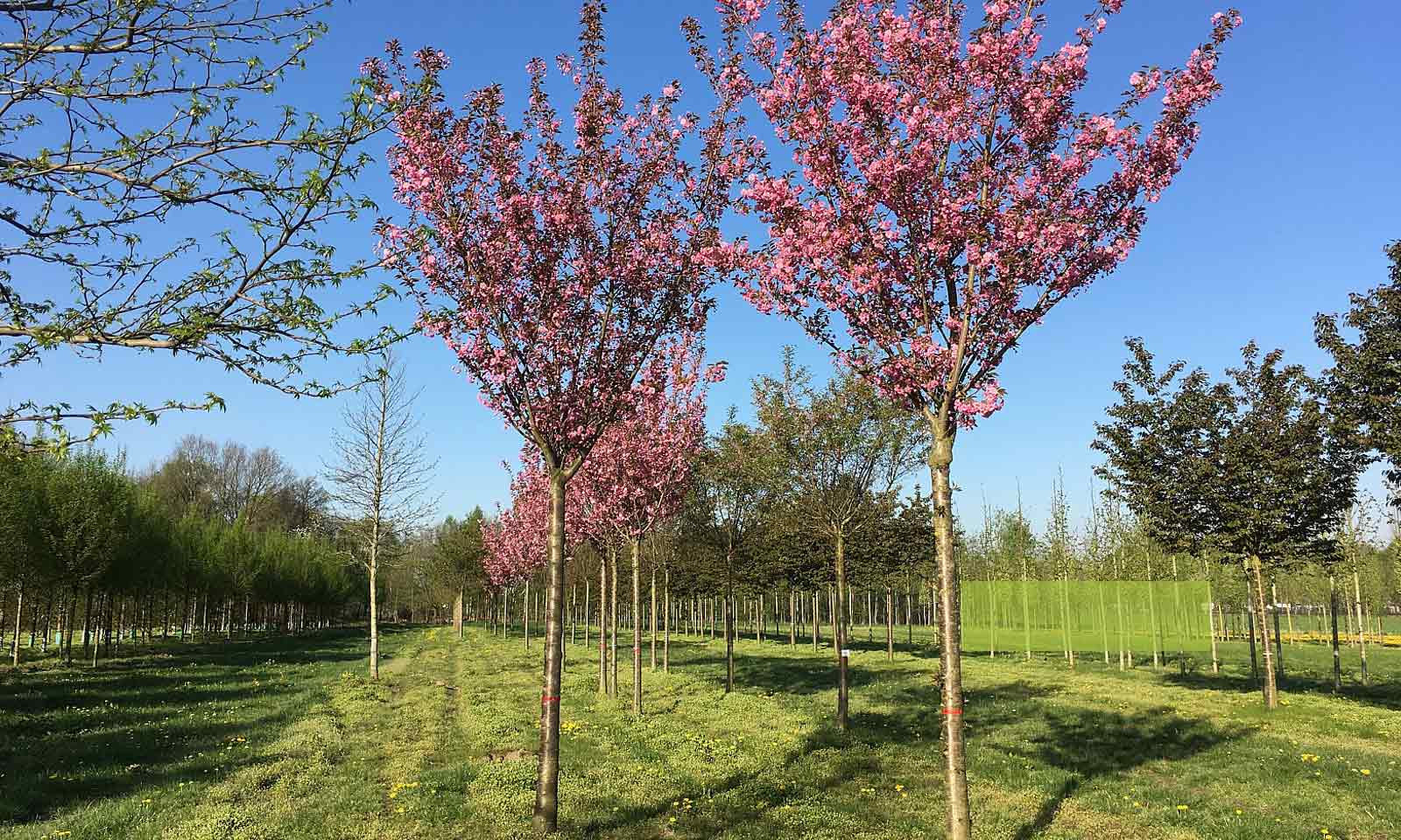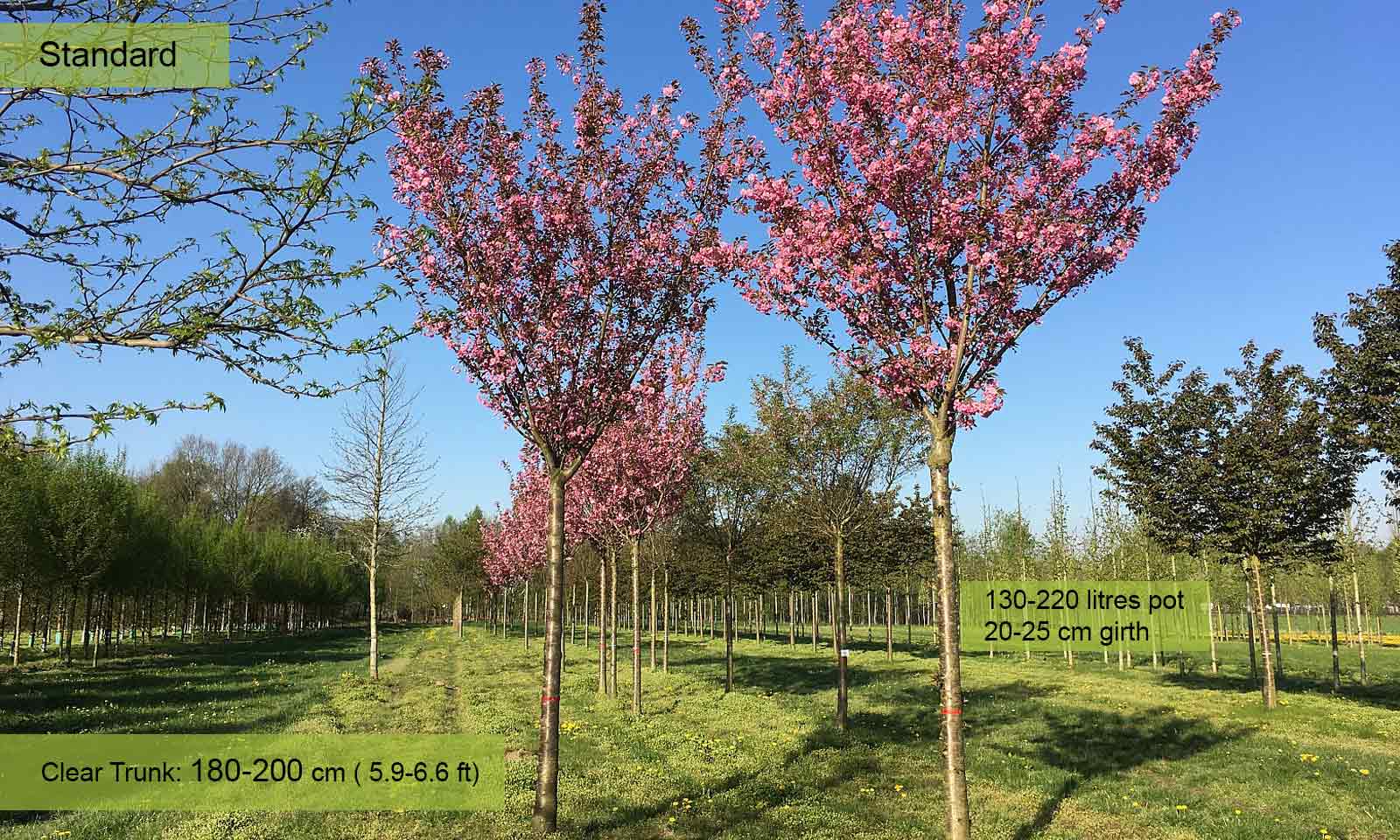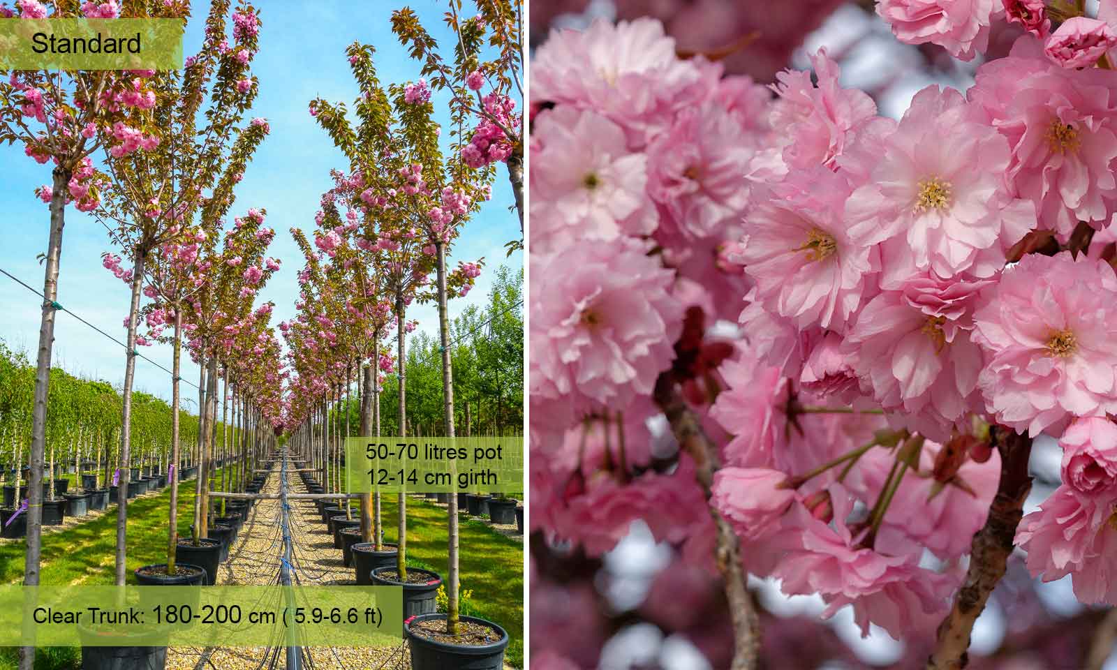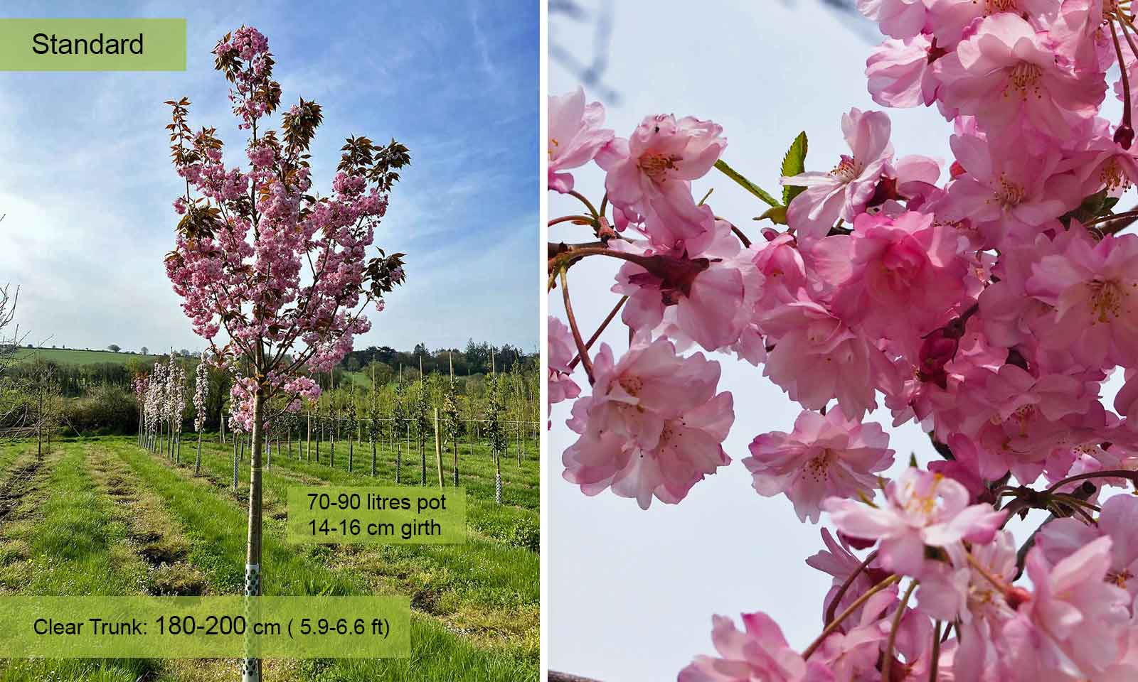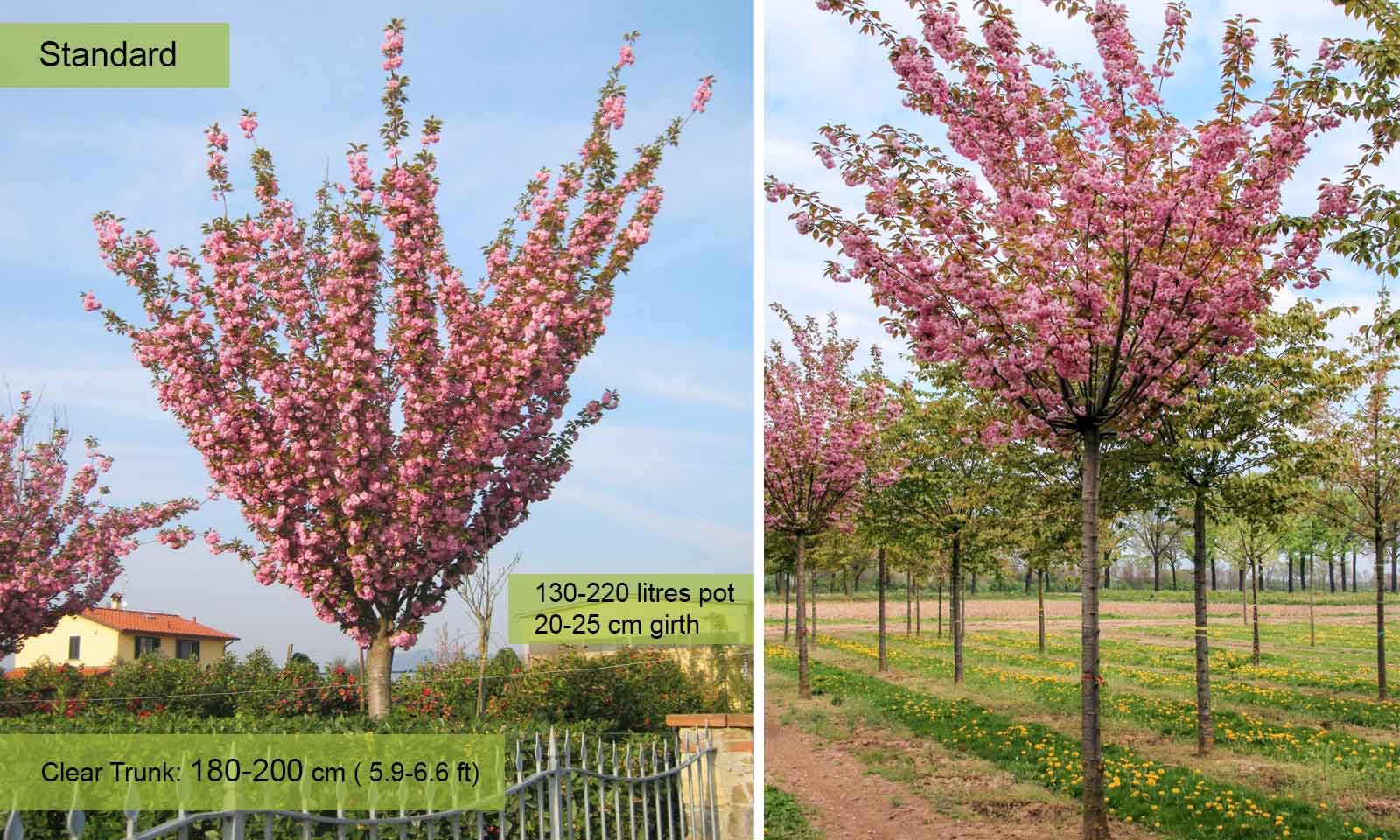 The most popular and most spectacular Flowering Cherry. A tree with characteristic crown which is initially broadly vase-shaped and later spreads out. Deciduous leaves, bronze when they appear, then bright green and yellow-orange in autumn. Flowers in April, red when in bud, bright pink when open, double, in groups of 2-5. No particular requirements as regards soil providing it is well-drained and not stagnant.
