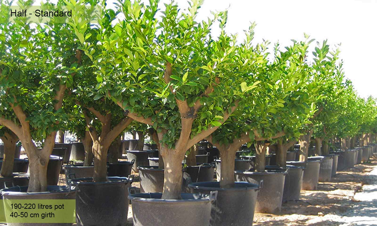 240-260 litre pot: trunk 80 – 120 cm (2.6-3.9 ft), canopy app. 100 – 150 cm (3.2-4.9 ft)