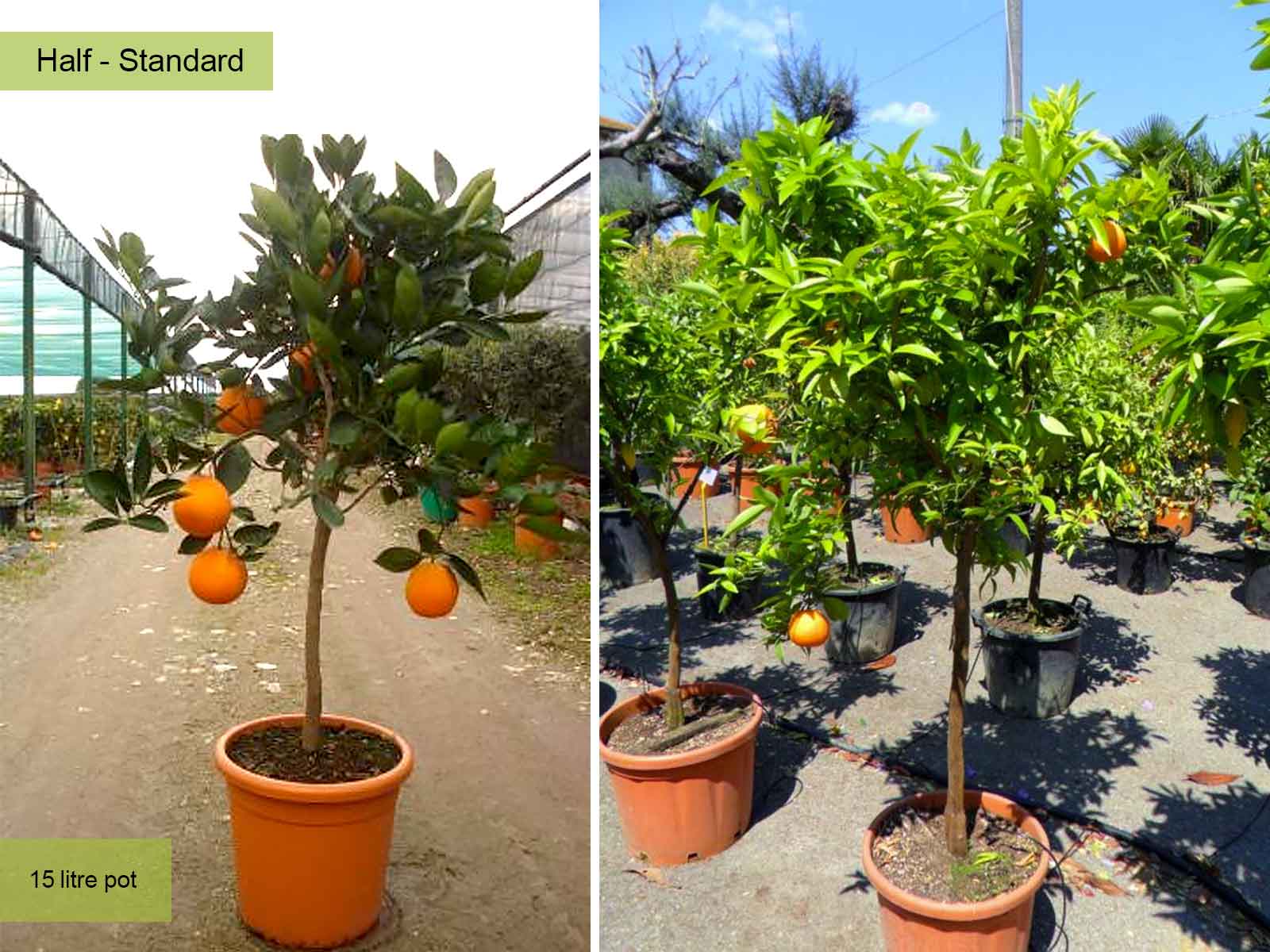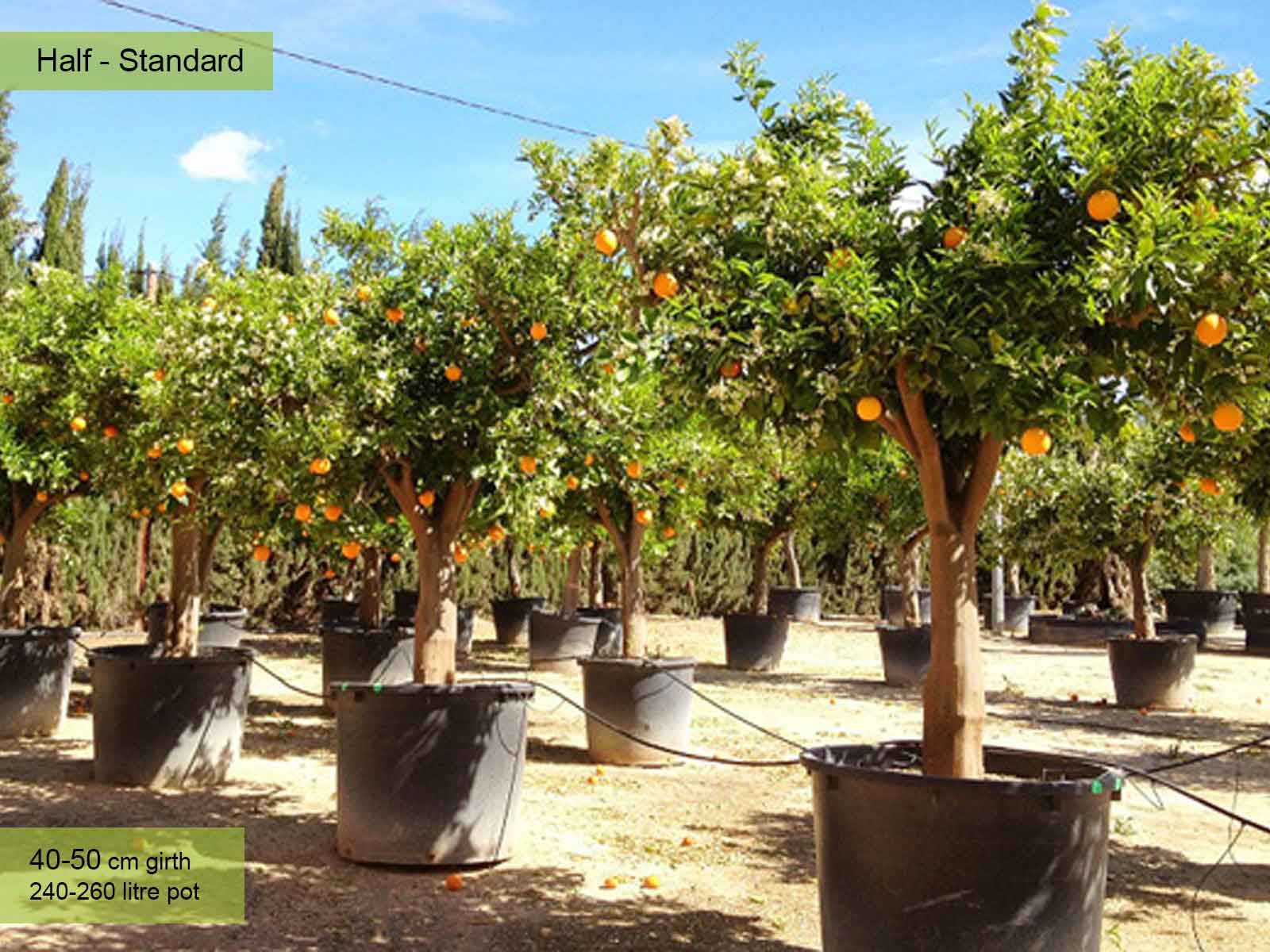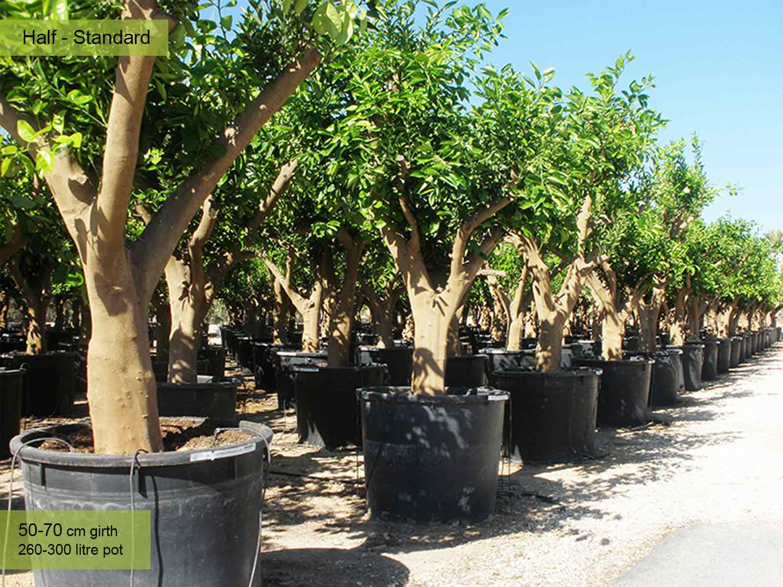 240-260 litre pot: trunk 80 – 120 cm (2.6-3.9 ft), canopy app. 100 – 150 cm (3.2-4.9 ft), 40-50 cm girth