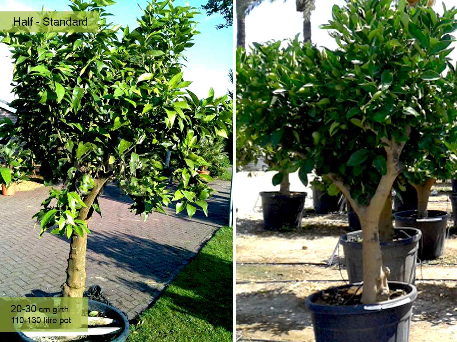 110-130 litre pot: trunk 80 – 120 cm (2.6-3.9 ft), canopy app. 80 – 100 cm (2.6-3.2 ft), 20-30 cm girth
