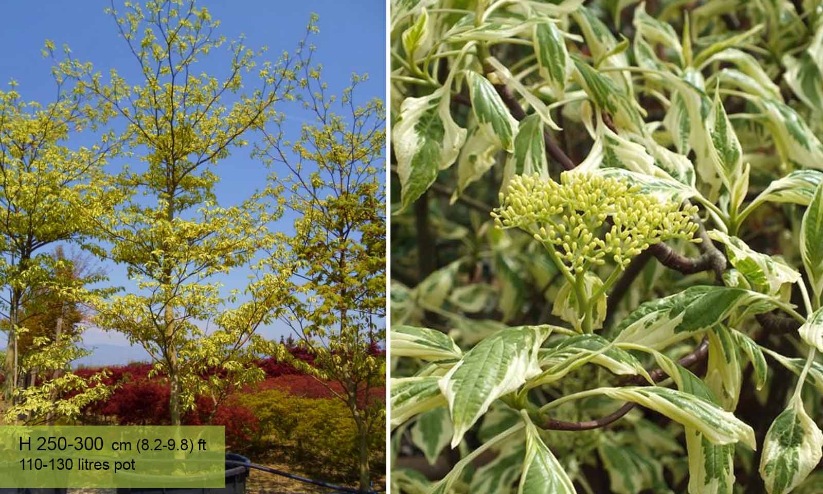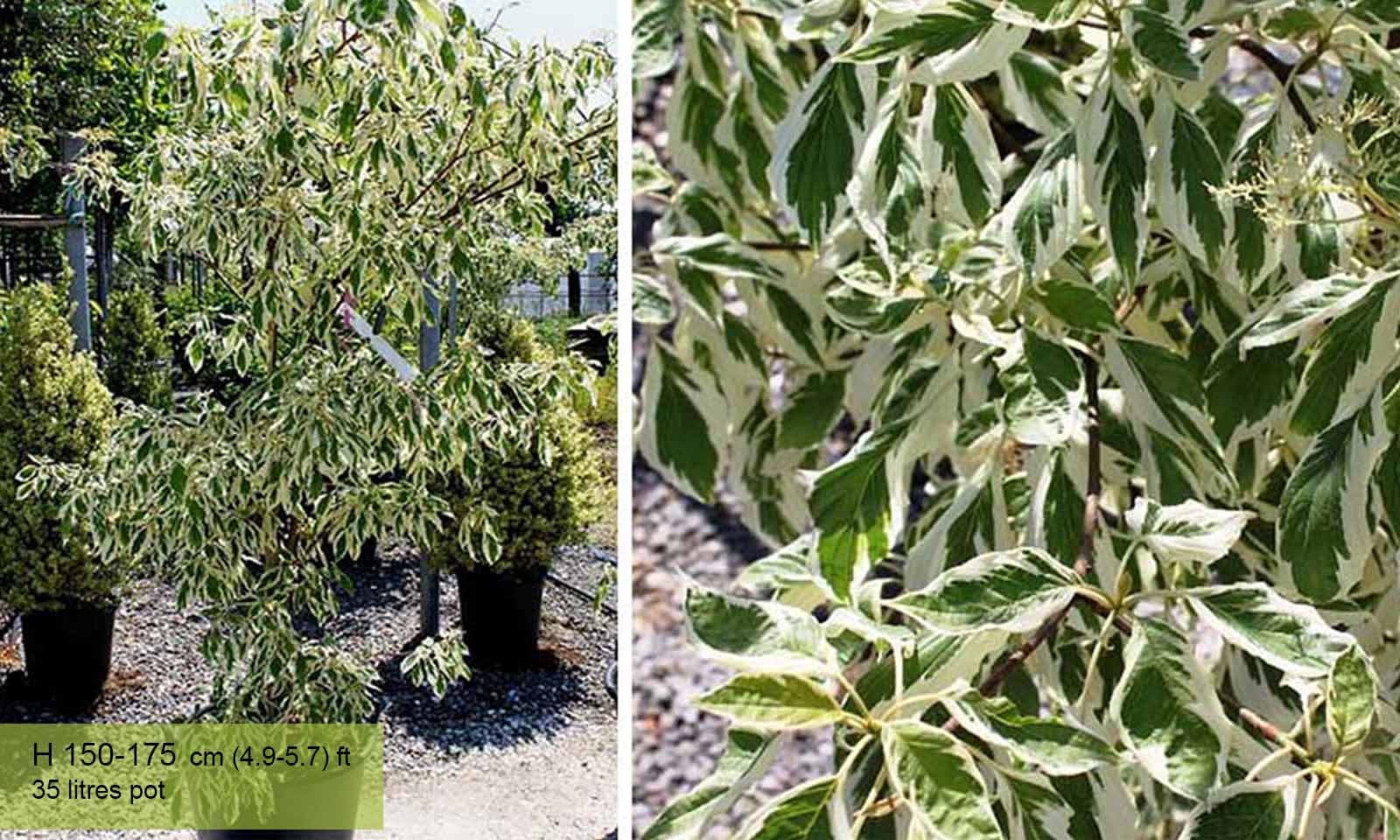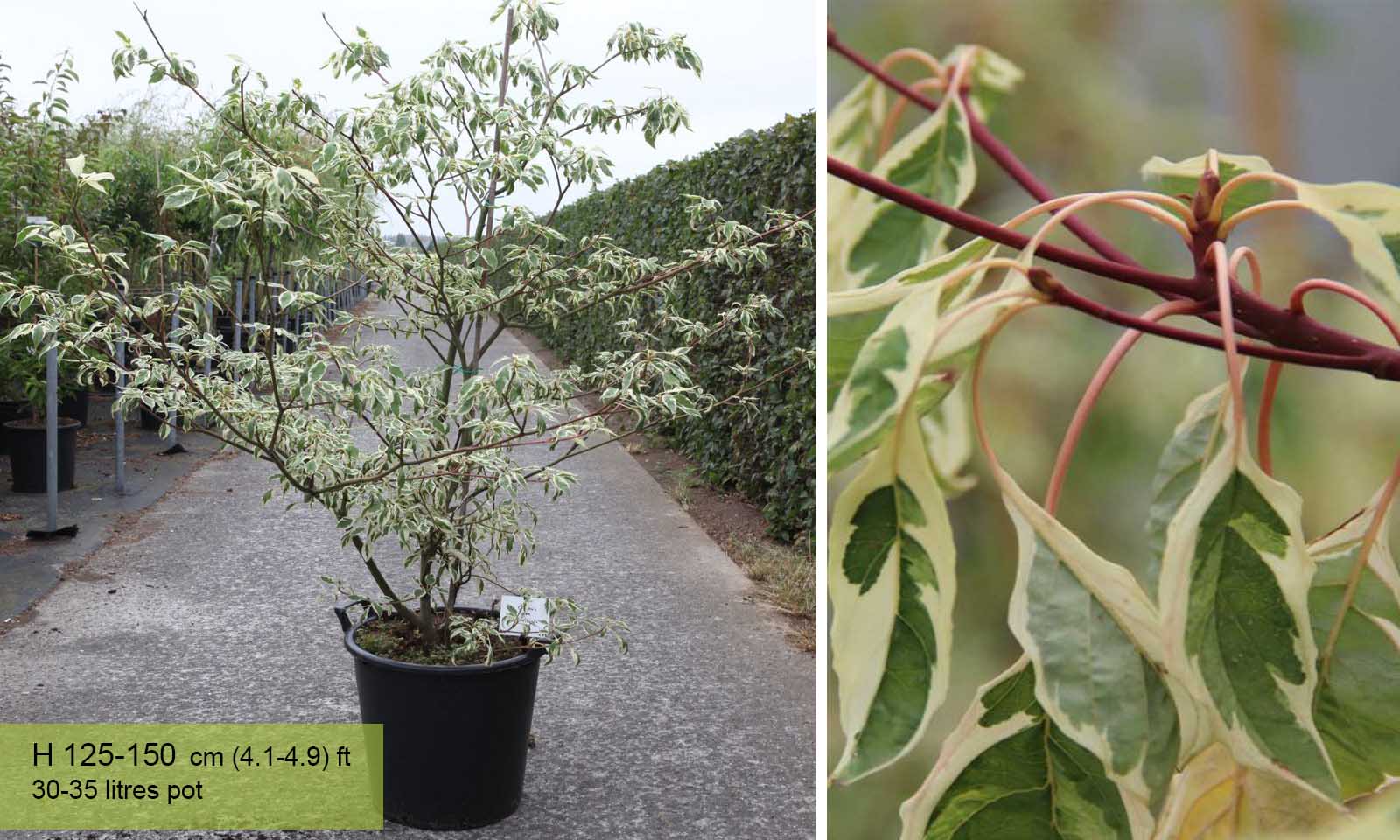 ‘Variegata’ is a small deciduous tree with strongly tiered branches bearing narrowly ovate leaves broadly margined with cream and turning yellow in autumn. Small, cream flowers in flat clusters are followed by black berries. The plant itself originates in Asia and is native to China, Korea, the Himalayas and Japan. The plant is hardy at H5 and is perfect for the British climate although take caution in an extreme cold snap and make sure to shelter the plant. It is prone to pests but it is generally disease free.