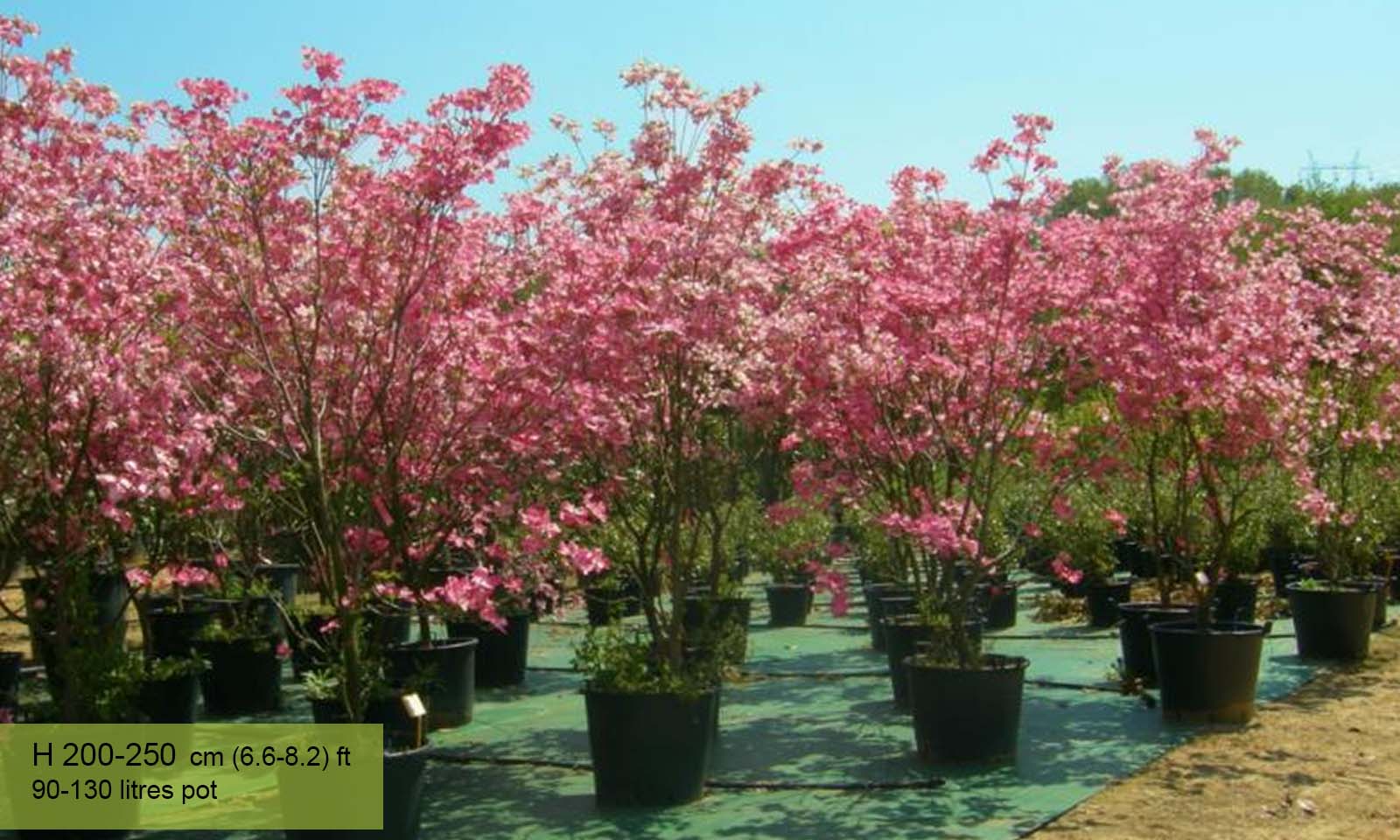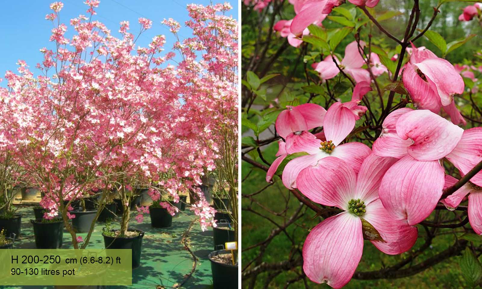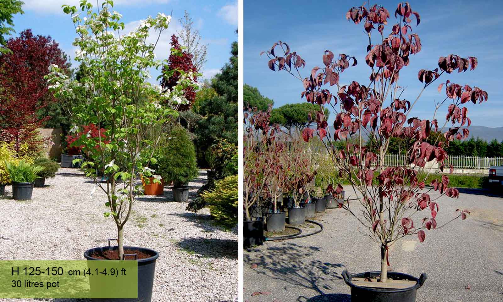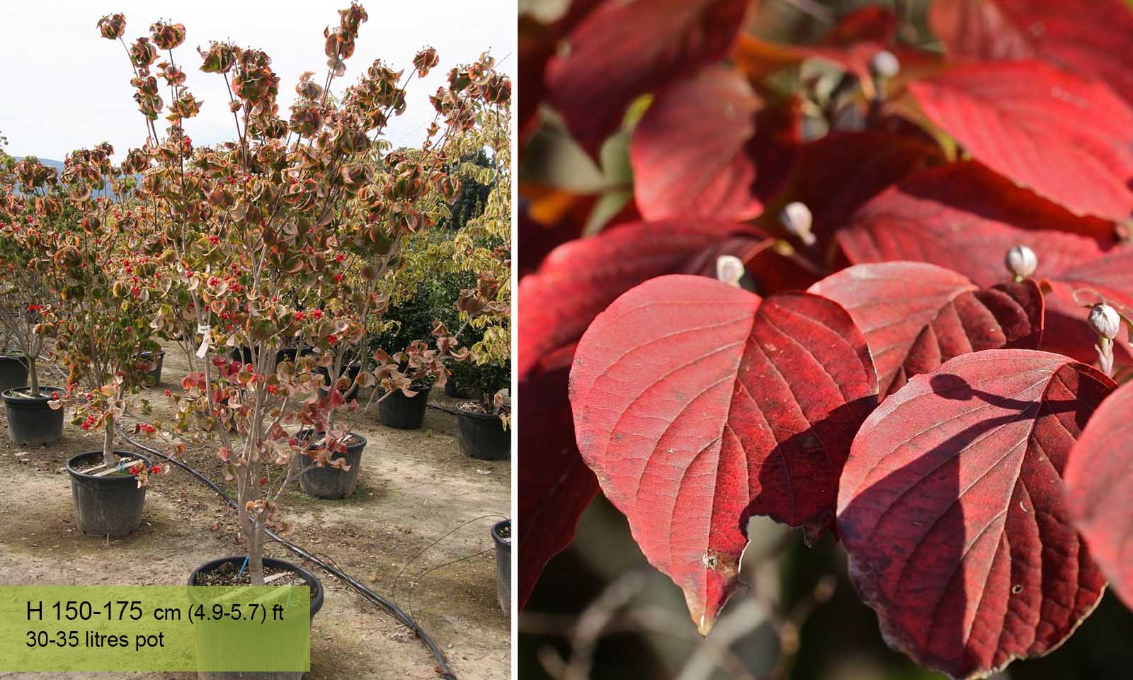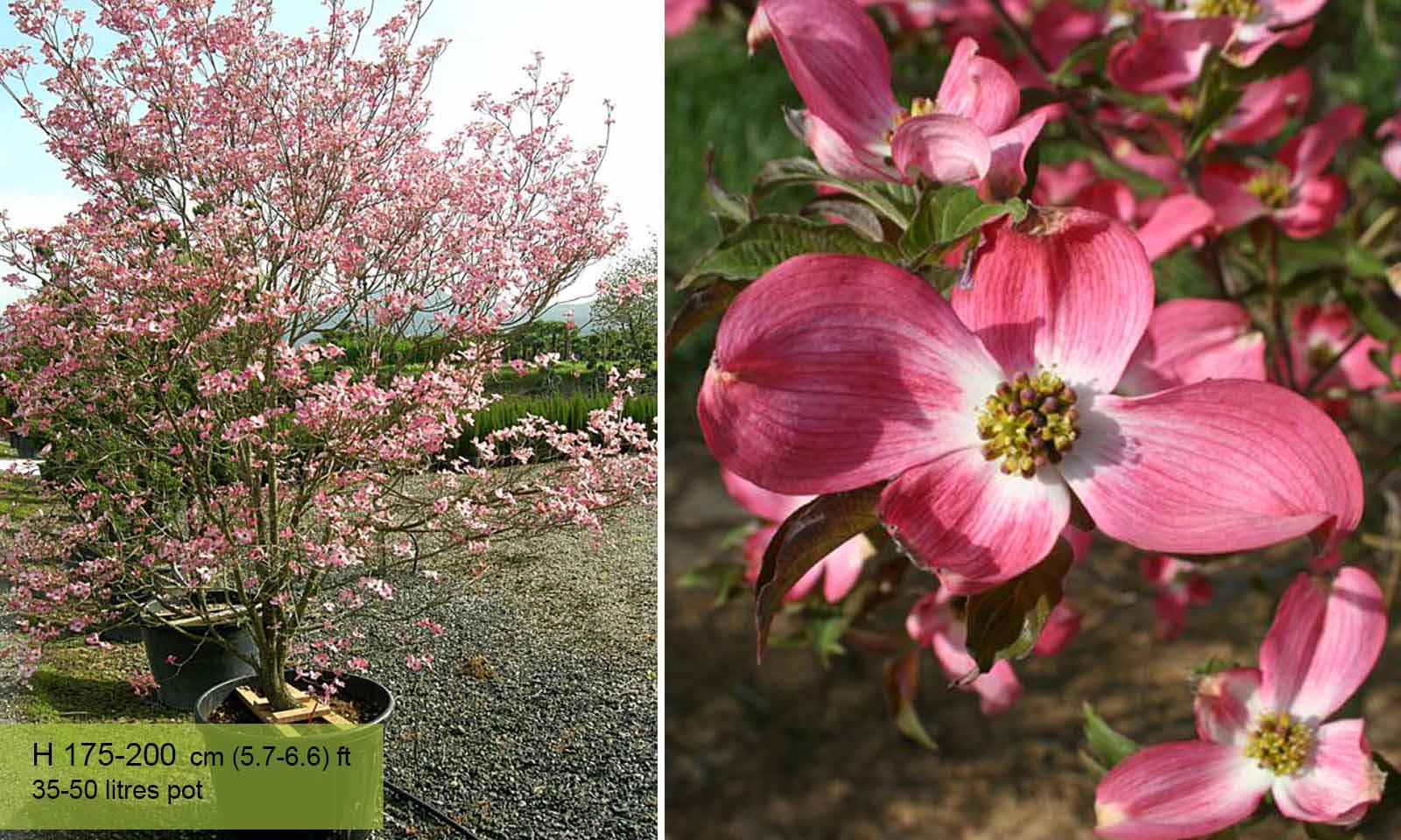 Cornus Florida Rubra forms a broadly conical tree with ovate, slightly twisted, leaves that show good autumn colour. The plant itself originates from North America, particularly around the Eastern part of the country. The plant has an interesting history in that around 1915, forty dogwood saplings were donated by U.S. to Japan in the 1912-15 exchange of flowers between Tokyo and Washington, D.C. The cherry trees survived despite war between the two countries later on. Eventually all the trees except one died and in 2012 America donated more of these trees once again to Japan on the anniversary of 1912. Discrete green flowers, surrounded by four showy bracts in a reddish-pink and white, appear in early summer followed by red fruits. The plant itself is hardy for the British climate at H5 and only needs sheltering in extreme cold weather. The plant itself is generally pest free but can get horse chestnut scale so keep an eye out for this. There are potential diseases to take into consideration as well. Follow the guidelines of pruning group 1 for maintaining.