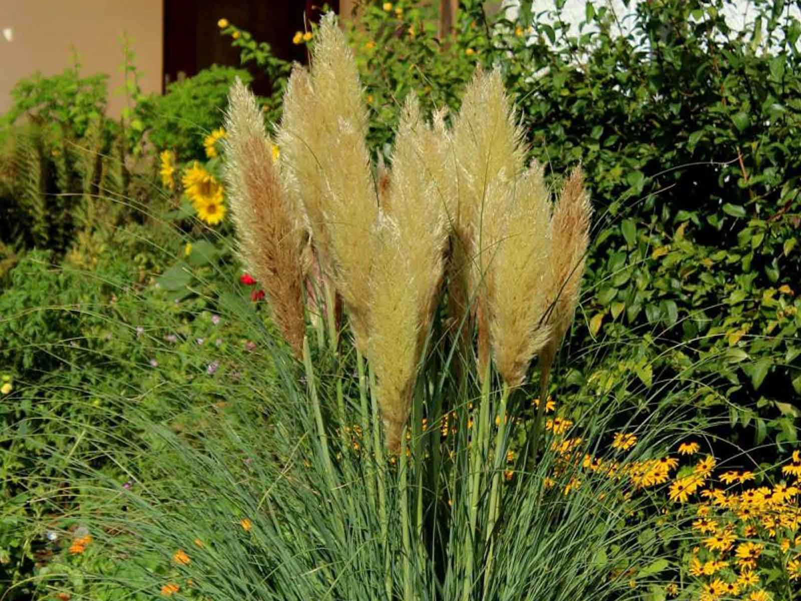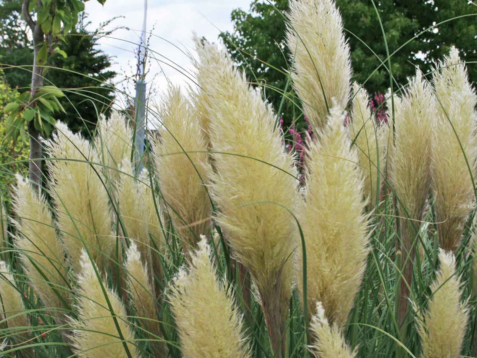 Gold Band Pampas Grass is one of the most impressive plants you can include in a garden design. The dense crest of golden yellow flowers emerges in late summer. The cascading bush of evergreen leaves are bright green with edges streaked with yellow. Wear gloves when trimming and tending to it, as the leaves are very sharp.