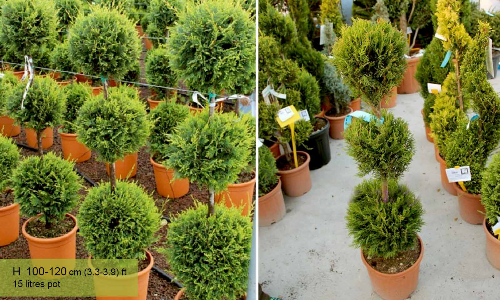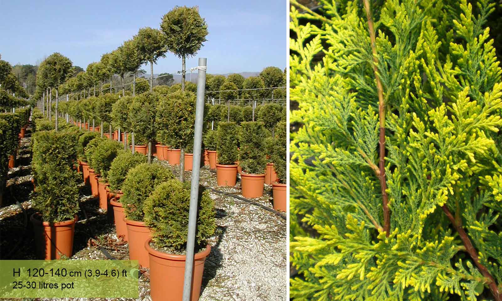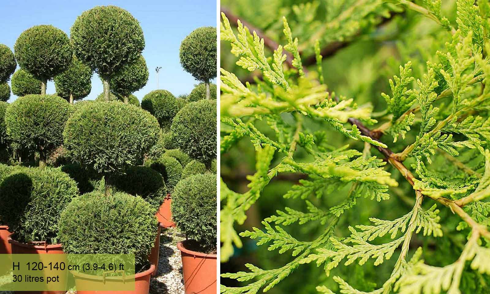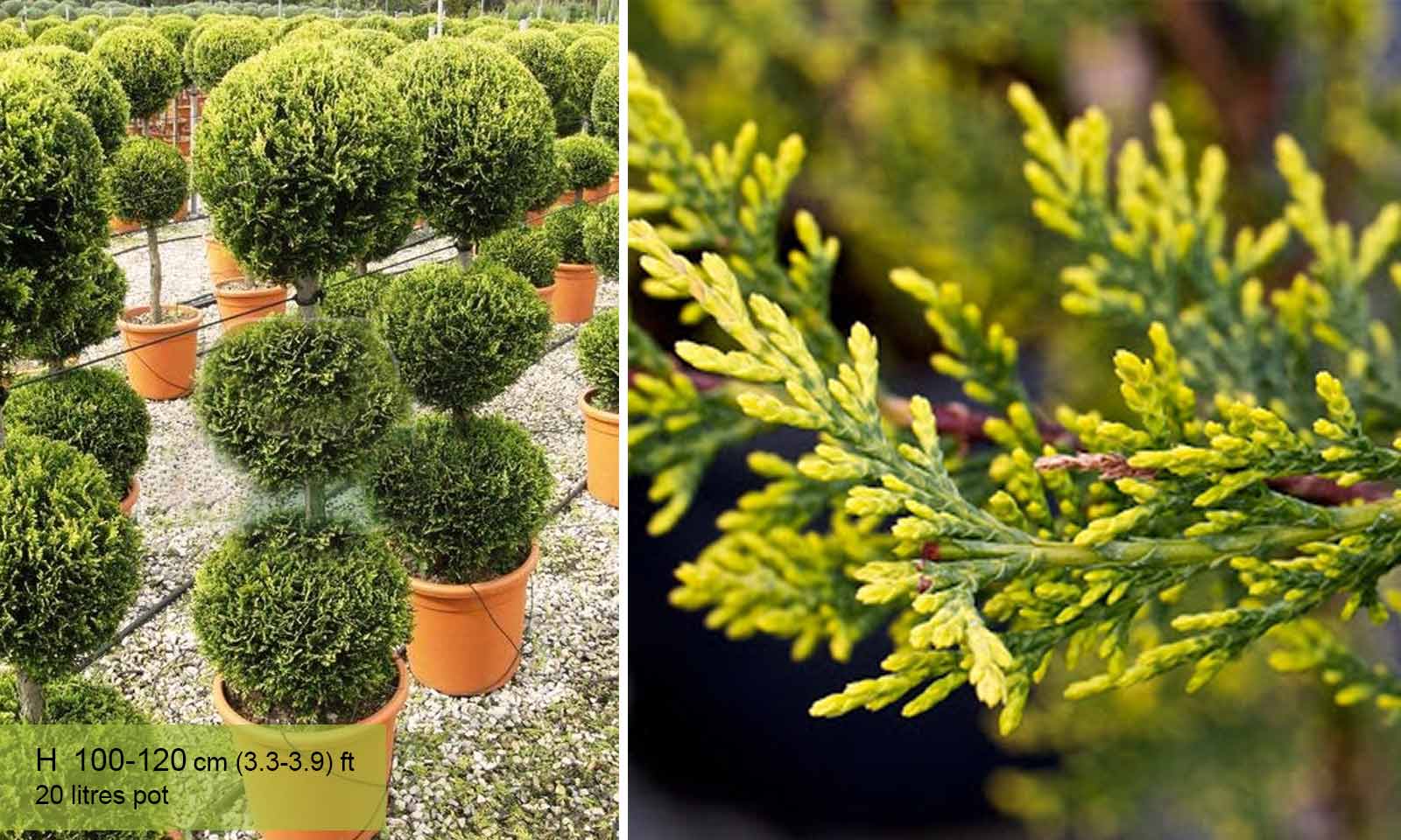The three ball Cupressocyparis leylandii Castlewellan Gold topiary is an impressive yet modestly priced topiary, ideal for anyone seeking to create a dramatic effect on a limited budget. It is available in three heights: 80 cm, 160/180 cm, 180/200 cm. Three ball evergreen Castlewellan Gold is a good choice as a topiary plant for inexperienced gardeners because it is hardy and easy to care for.