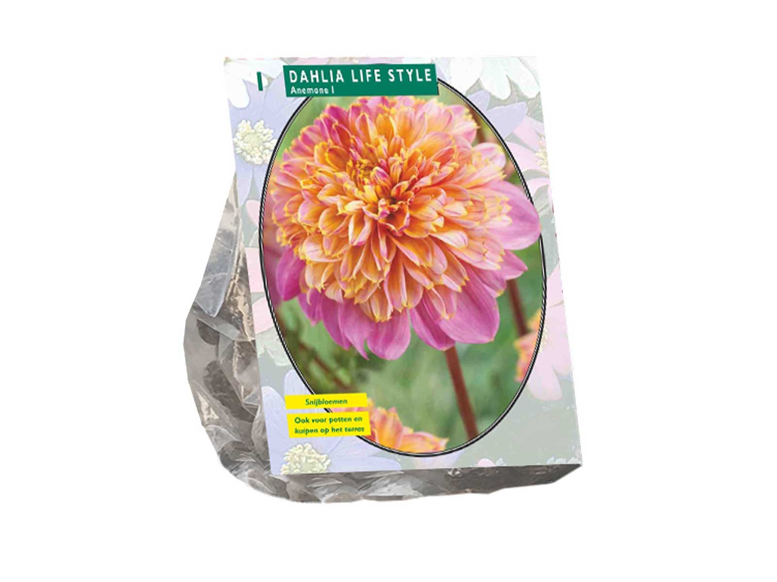 Dahlia Anemone ‘Lifestyle’ is a charming variety featuring soft, peachy-pink blooms with a delicate anemone form. The petals surround a prominent, dark central disk that creates a beautiful contrast, adding depth and visual interest to the flower. Its graceful, ruffled petals and gentle coloration make it an excellent choice for borders, beds, and containers, bringing a subtle yet elegant touch to any garden.