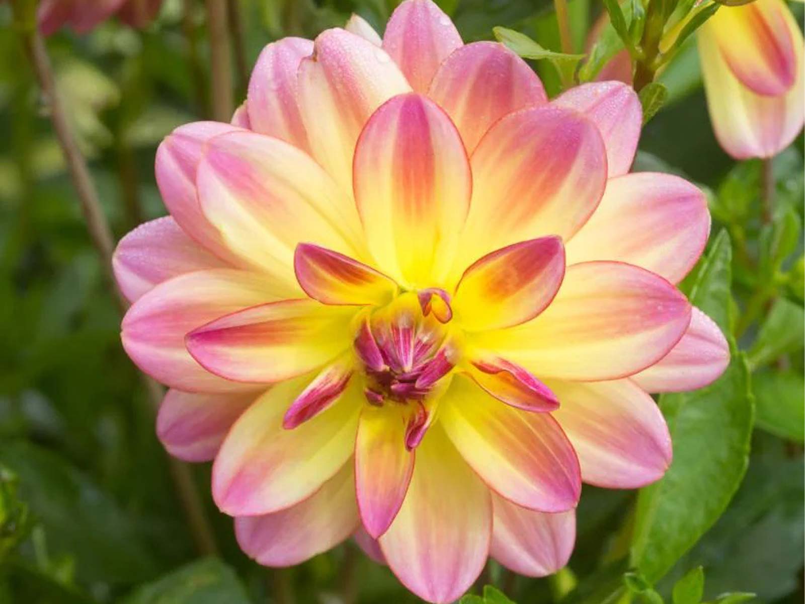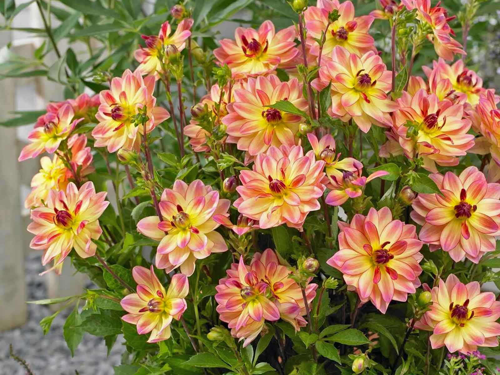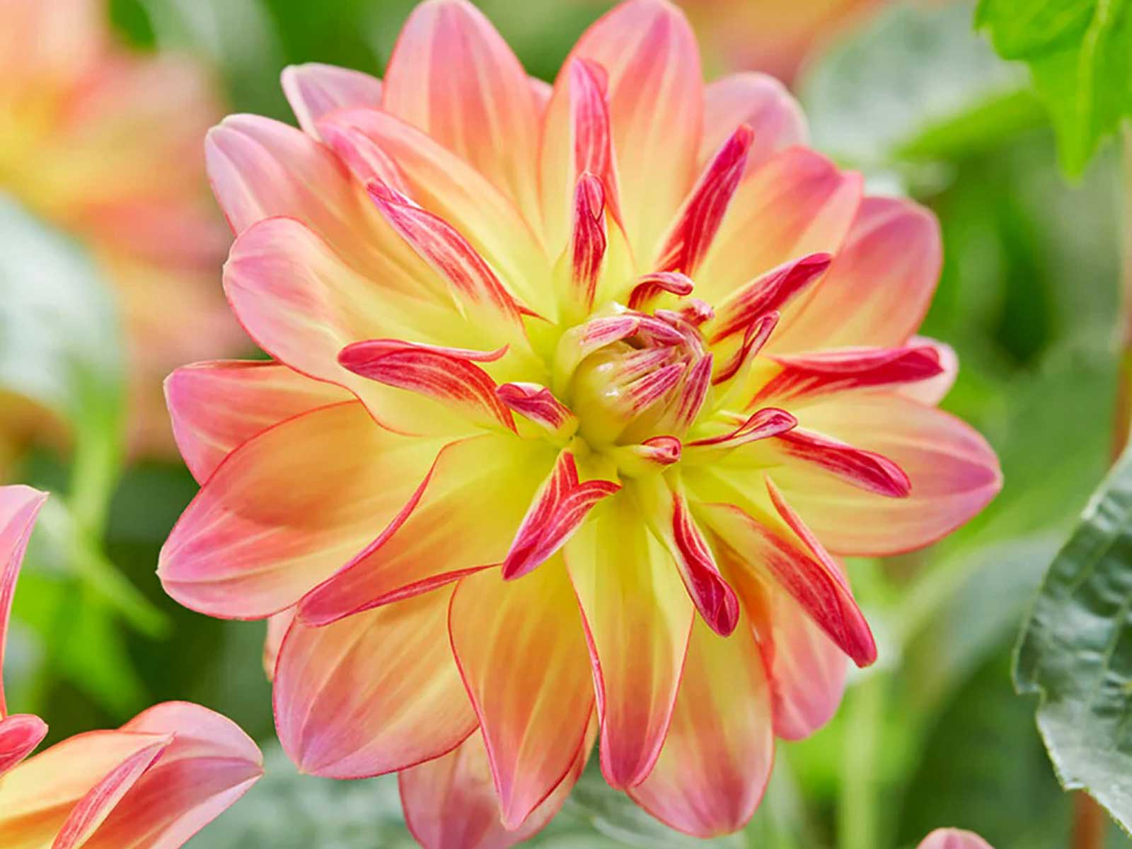 Dahlia ‘Pacific Ocean’ is a compact, upright variety with pale yellow blooms elegantly edged in rosy pink. Its soft, bicolor petals create a warm, delicate effect, making it a standout in borders, beds, and containers. This free-flowering dahlia provides continuous color from mid-summer through autumn, attracting pollinators and enhancing garden displays.