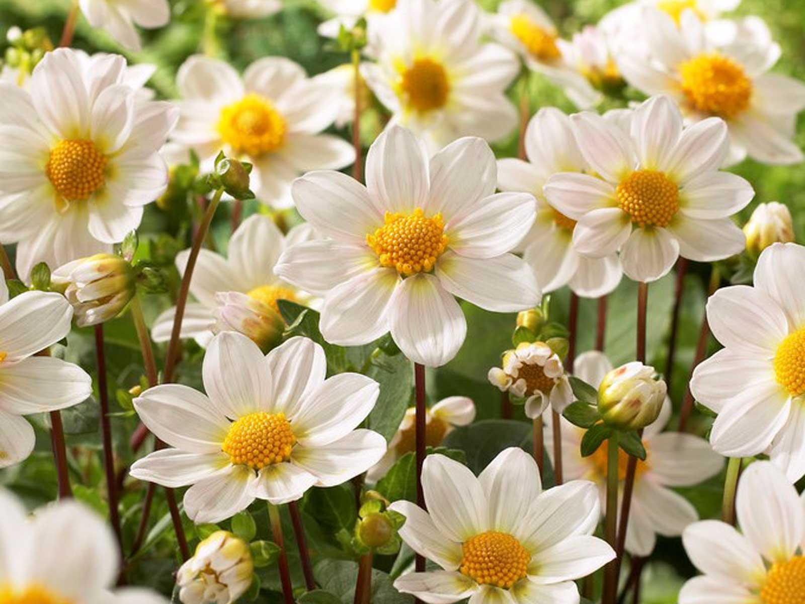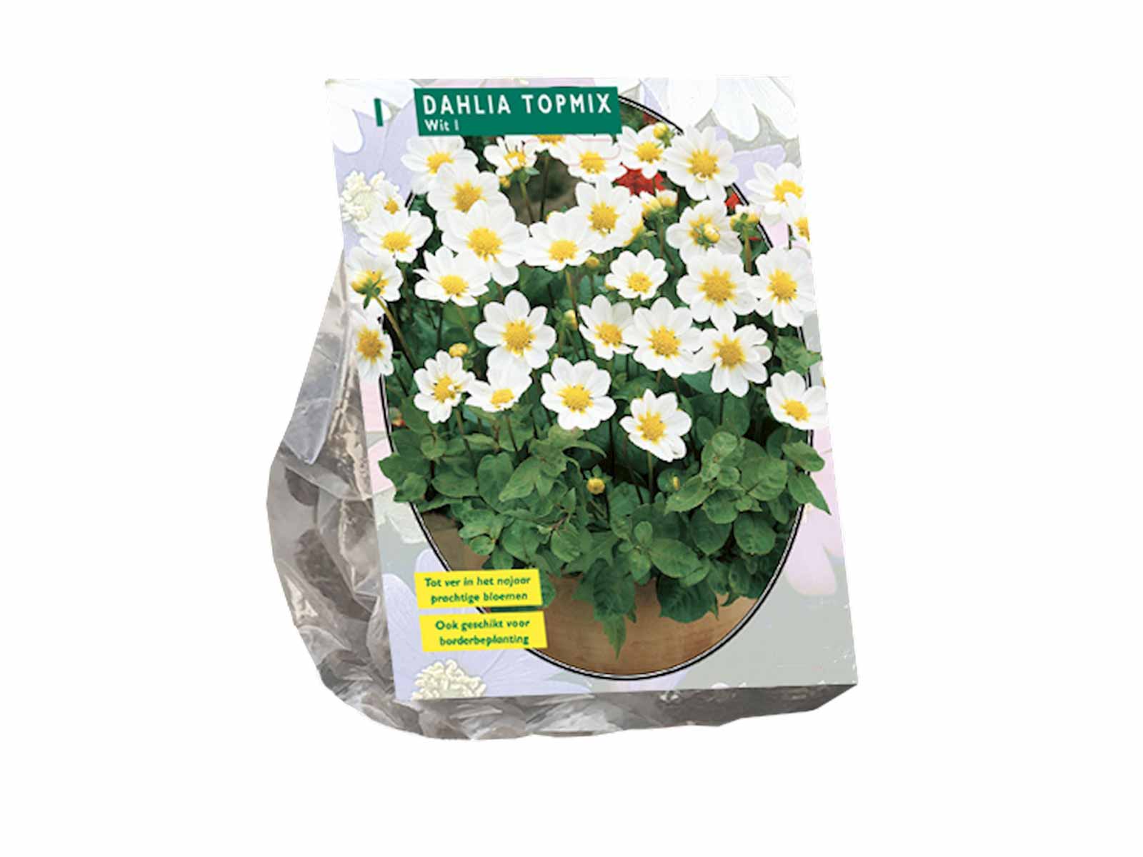 Dahlia Topmix ‘White’ is a charming compact variety featuring pure white single blooms that shine brightly against fresh green foliage. Its crisp, clean flowers add a touch of elegance and freshness to borders, containers, and small garden spaces, making it a lovely choice for both modern and cottage-style plantings.