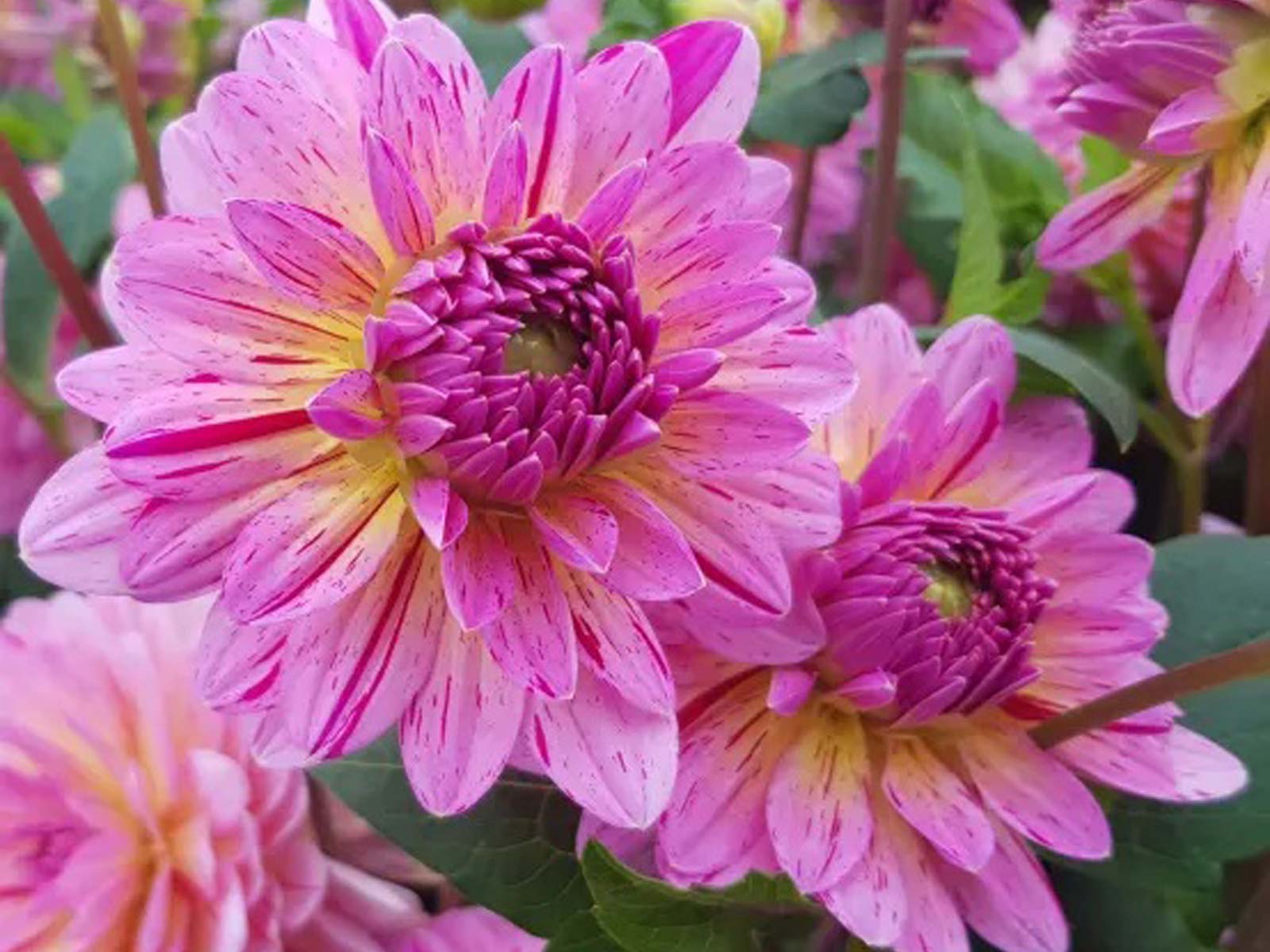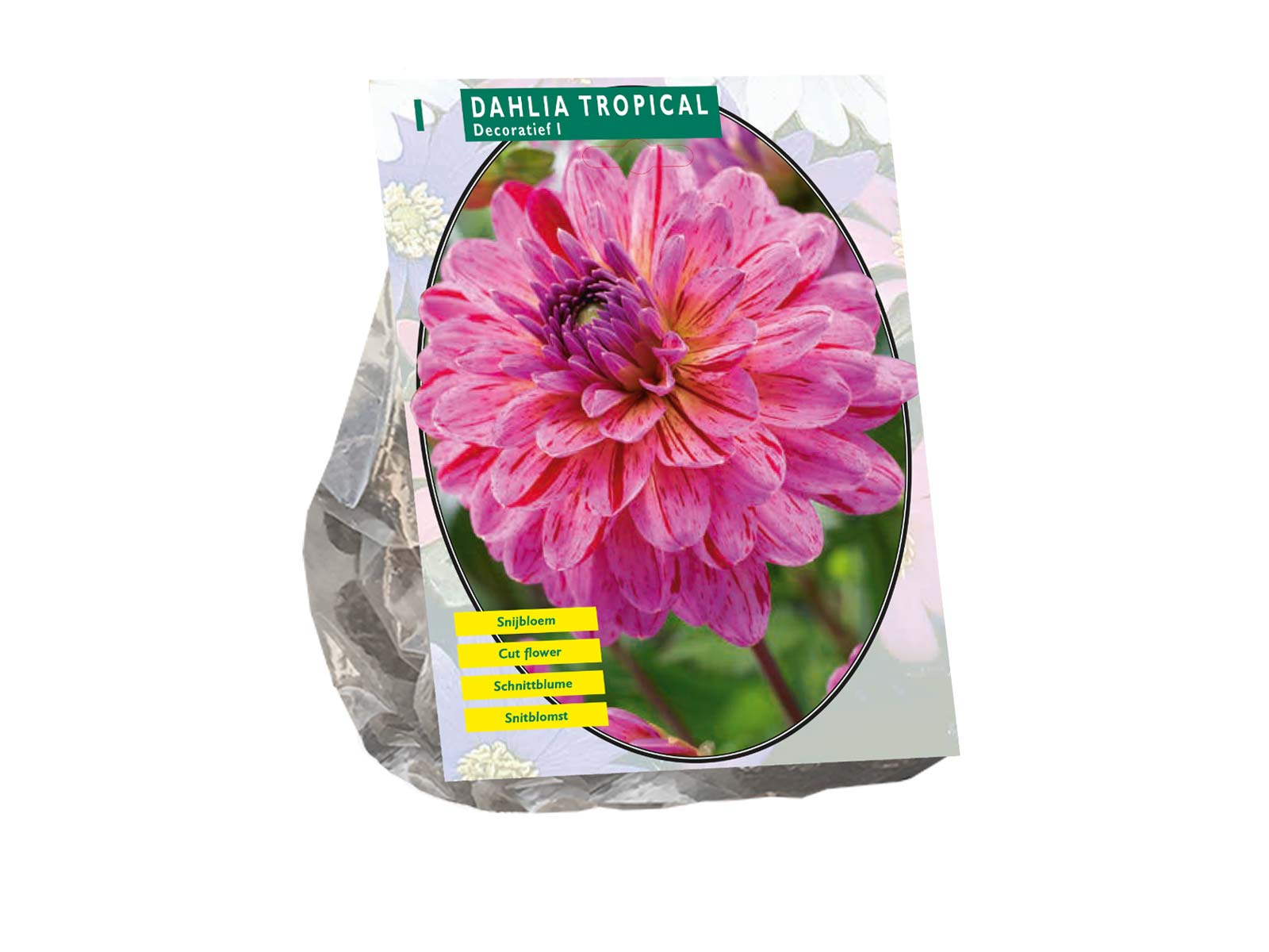 Dahlia ‘Tropical’ is a bold and radiant variety, featuring a blend of fiery orange, soft pink, and golden yellow hues. Its warm, sunset-like tones make it a standout in borders, beds, and floral arrangements, adding a touch of the exotic to any space. Each bloom is unique, ensuring a lively and ever-changing display throughout the season.