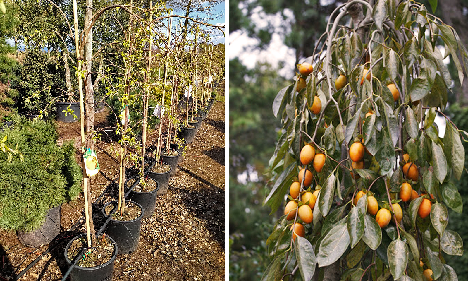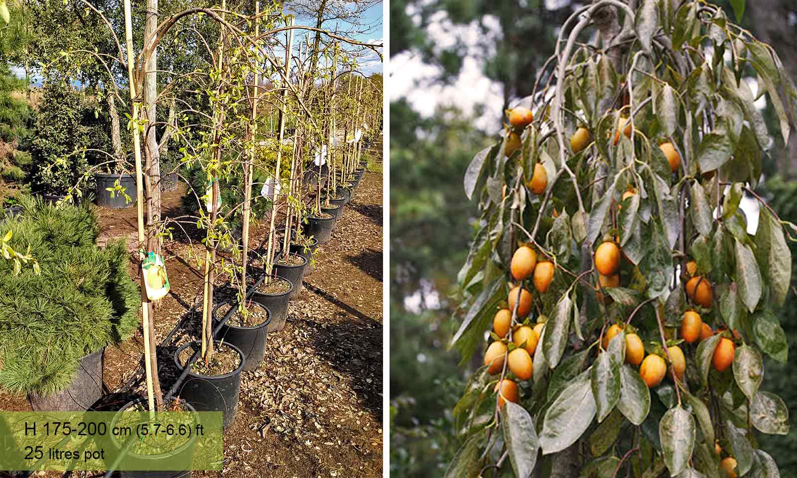 Native of China and Japan, where it has been cultivated for over a millennium, Japanese Persimmon is a small, deciduous fruit tree, increasingly found in gardens with its large, dark green leaves that turn orange and purple in autumn and its fruits crowding the tree until late autumn, bringing a note of lively, glowing colour. The yellowish-white flowers, on the other hand, in April-May are rather dull. Prefers temperate or hot climates, but grows successfully in northern zones. No problems as far as soil is concerned, adapts even to damp terrain, with sub-acid or sub-alkaline pH.