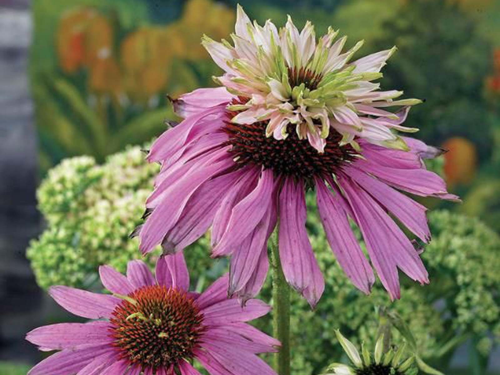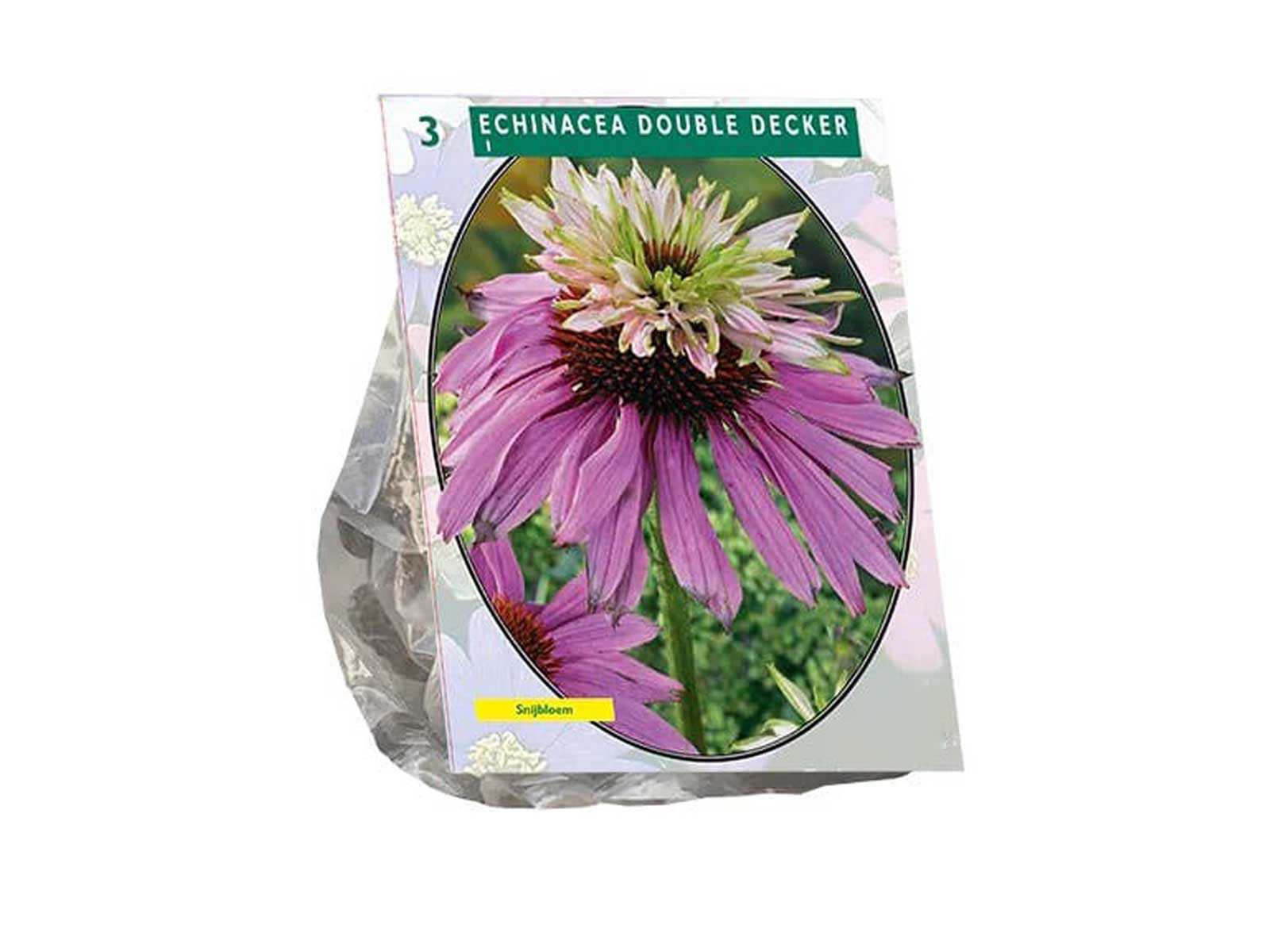 Echinacea ‘Double Decker’ is a unique and eye-catching variety of coneflower, featuring a striking two-layered bloom. Its large, deep pink petals surround a raised, greenish-brown cone, while a second set of smaller petals often emerges from the top, creating a distinctive, ruffled effect. This long-lasting perennial is a standout in borders, prairie-style plantings, and pollinator gardens, attracting bees and butterflies throughout the season.