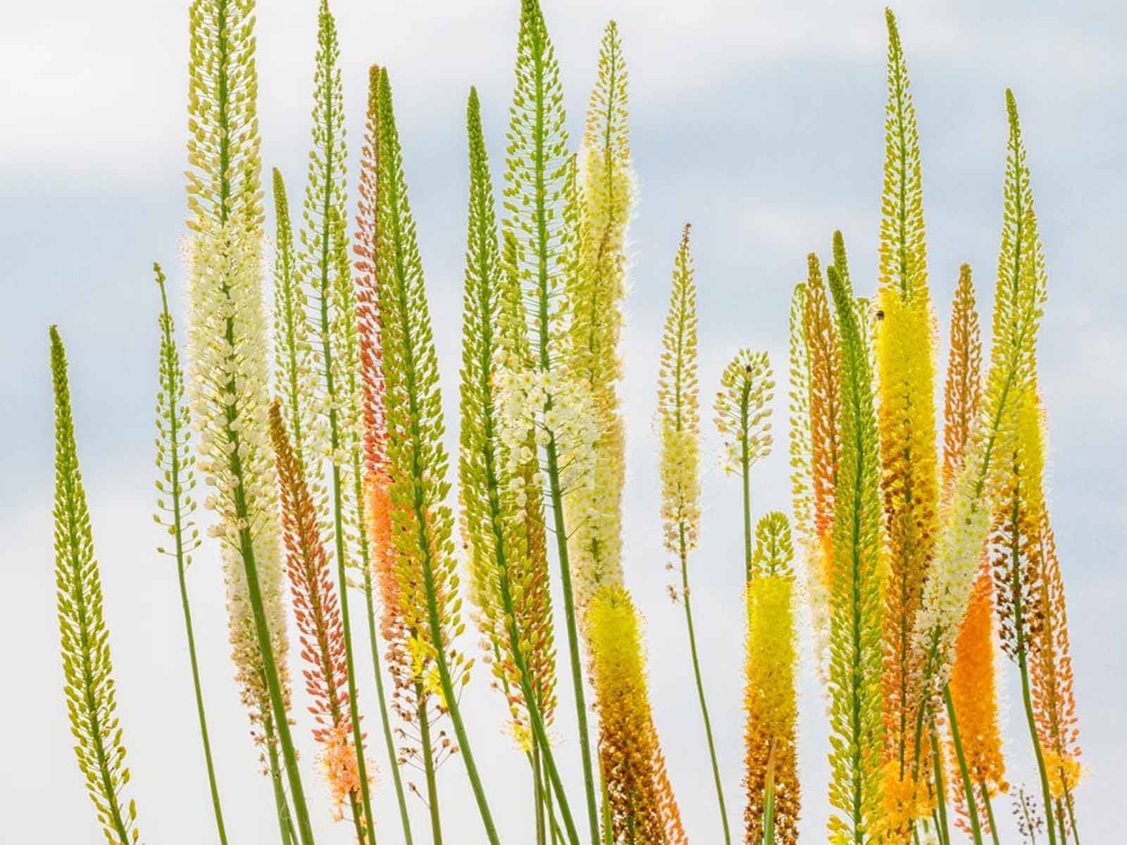Eremurus ‘Ruiter Hybrid Mix’, also known as Foxtail Lily, is a stunning perennial producing tall, elegant flower spikes in shades of yellow, orange, pink, and white. Its densely packed, star-shaped blooms rise above clumps of narrow, strap-like foliage, creating a striking vertical accent in borders and prairie-style plantings. This drought-tolerant variety is highly attractive to bees and butterflies, adding movement and life to the garden.