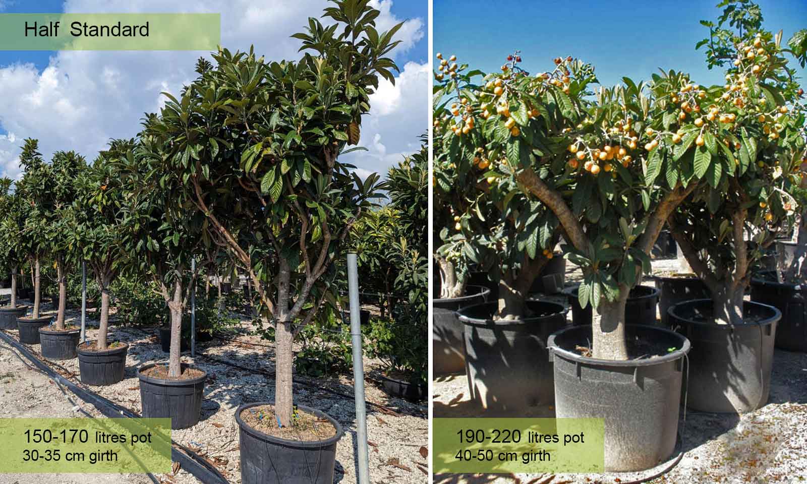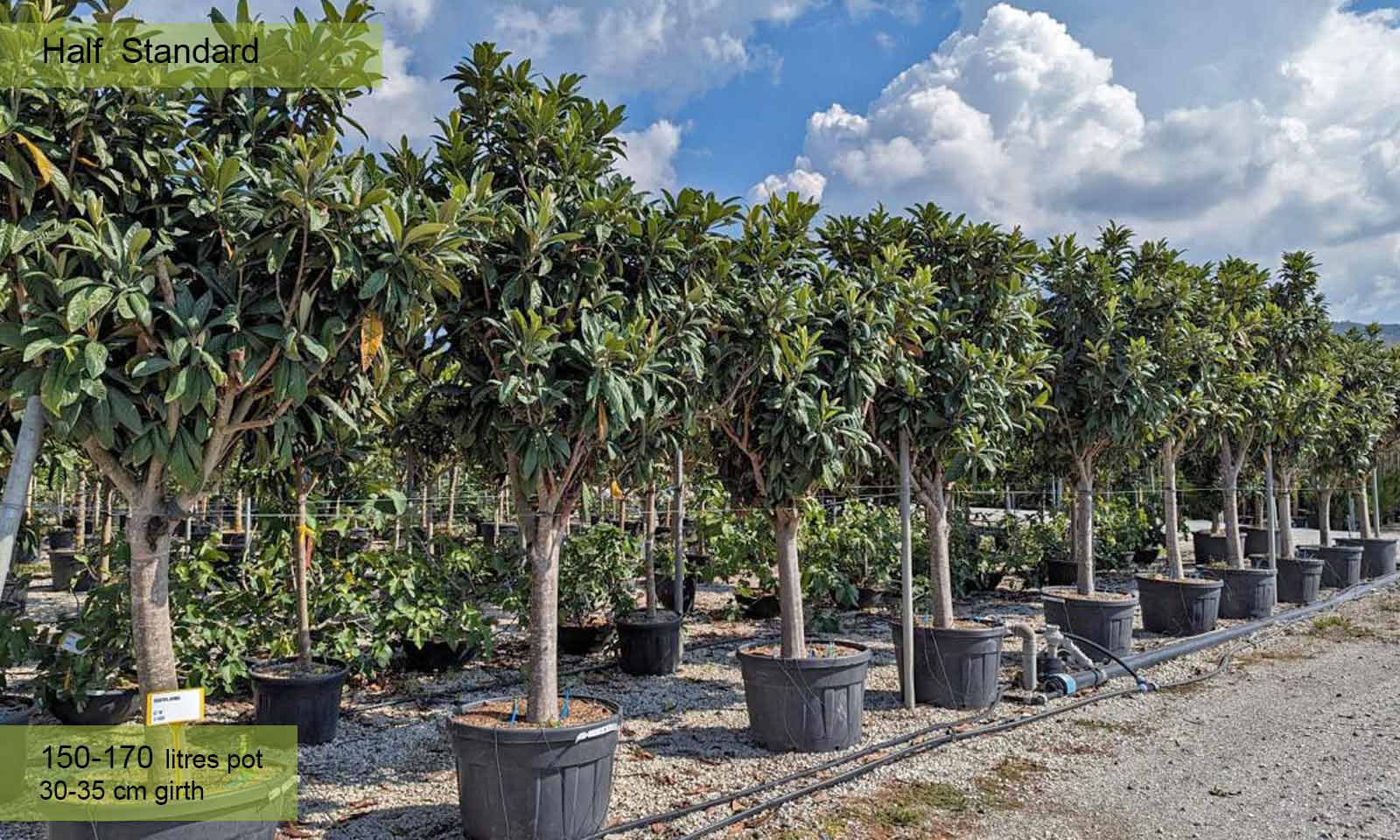 150-170 litre pot: trunk 80 – 120 cm (2.6-3.9 ft), canopy app. 100 – 140 cm (3.3-4.6 ft)