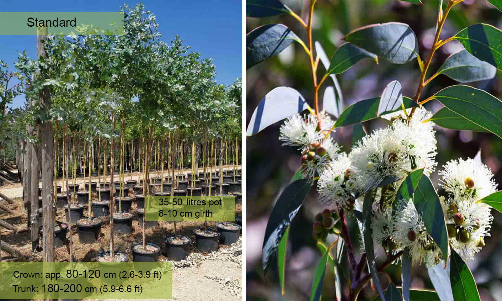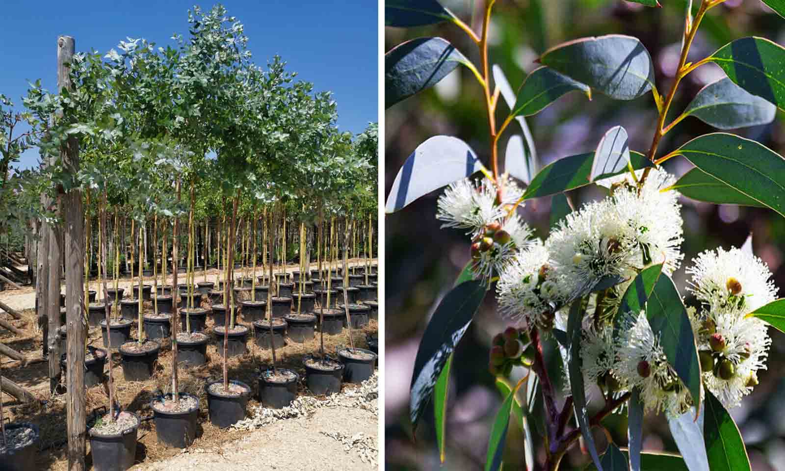 Eucalyptus are evergreen trees or large shrubs, often fast-growing, with smooth, brownish-grey or white trunk, most with aromatic foliage, and clusters of small, white, yellow or red flowers. Eucalyptus Globulus is a fast-growing evergreen tree to 30 m or more, with white to cream, yellow or grey bark that sheds in ribbons to reveal light green and brown inner bark. It has highly aromatic foliage, the juvenile leaves ovate and greyish-blue; adult leaves sickle-shaped. White flowers appear on mature trees in spring or summer.