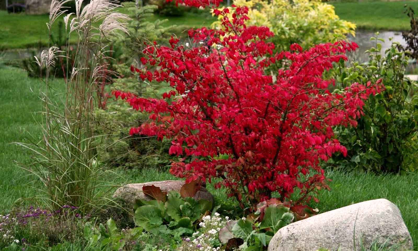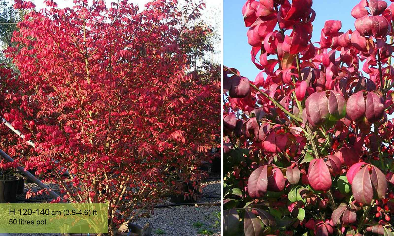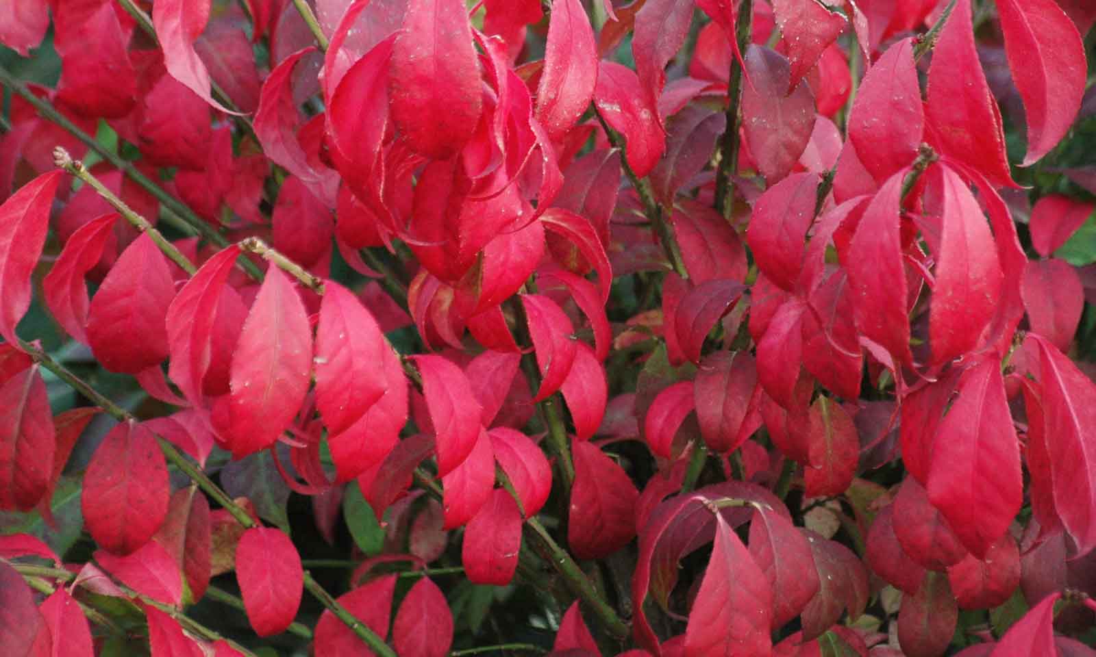 Euonymus Alatus is a dark-leaved shrub, inconspicuous for most of the year but in autumn it comes into its own when the foliage turns vivid shades of scarlet and crimson. The summer flowers are insignificant, but they result in attractive purple and red fruits which split open to form four winged lobes with a bright orange seed at the centre. The bark is also attractively winged. It’s perfect for growing as a specimen shrub in a mixed border or front garden, where it’s magnificent autumn colours can be fully appreciated.