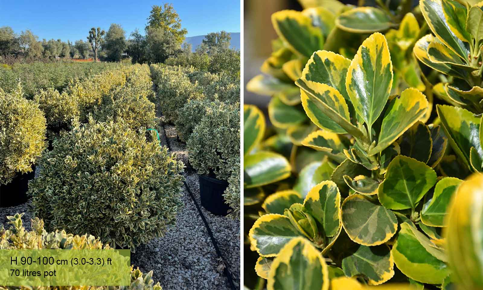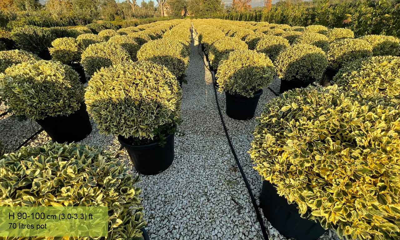 A dense, evergreen shrub with dark green oval-shaped leaves that are edged with yellow margins, lends itself very well to being trimmed into various shapes. Our ball shaped plants add an air of elegance to any garden.