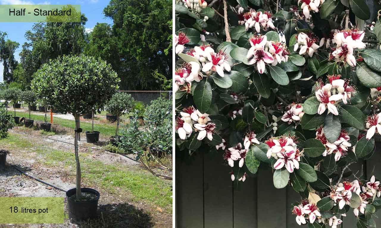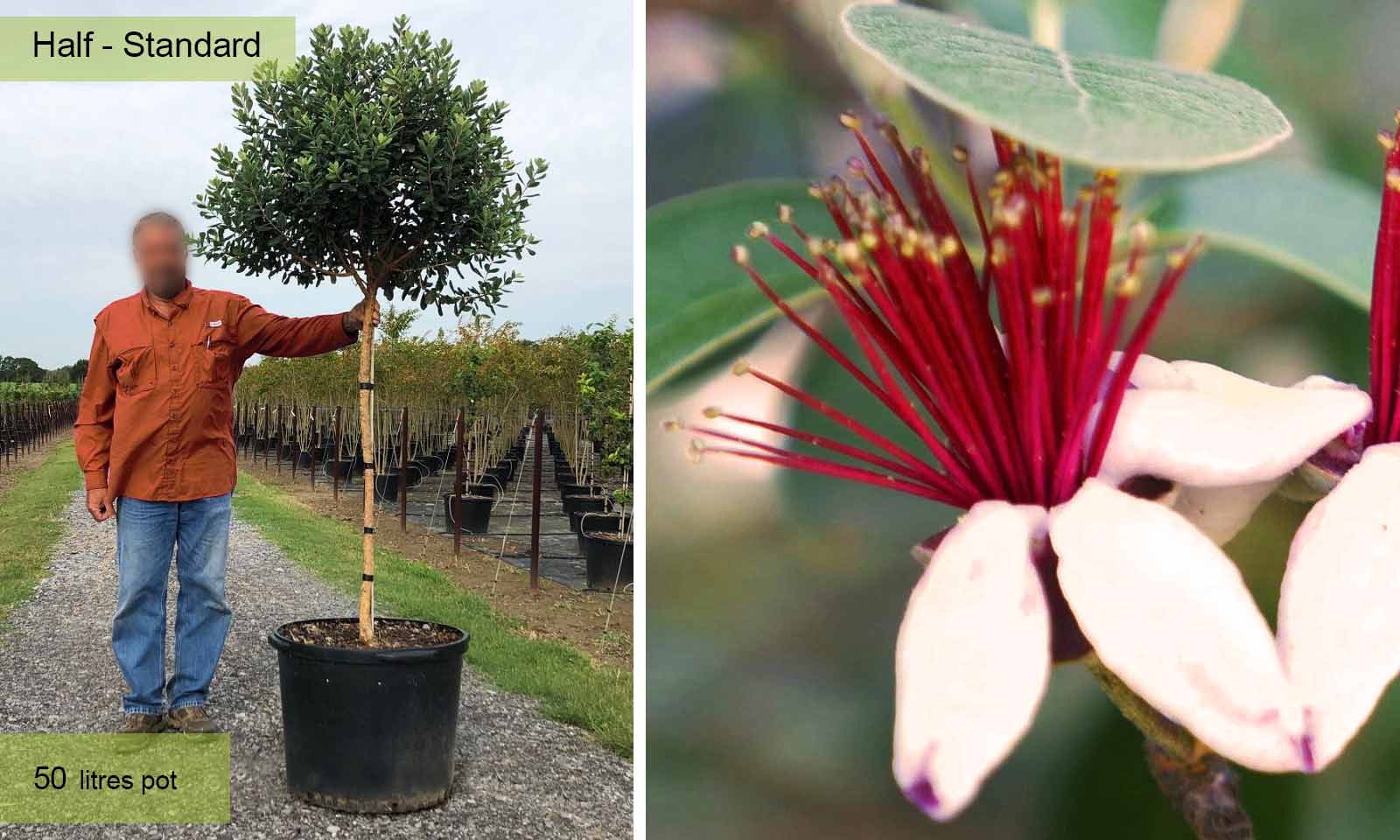 Pineapple Guava or Feijoa Sellowiana (named after Portuguese botanist Joo da Silva Feij) is a small evergreen, fruit bearing tree originating from Brazil and northern Argentina. Feijoa Sellowiana is grown for its edible fruit which is green tinged with red and tastes like guava. Fruit production is fairly reliable as Feijoa fruit is self-pollinating. Plants grown from seed will take 4-6 years to produce flowers and fruit. Pineapple guava blooms in July, producing exotic flowers with beautiful white petals enveloping bright red stamens that burst skyward coating the end with yellow pollen granules. The oblong leaves are 7 cm long, green above with woolly white underside. Pineapple guava bark is initially light reddish brown but turns darker and peels with age. The plant itself is not very hardy at H3 so make sure to shelter during a cold snap or the British winter in general. The plant is usually pest and disease free so no need to worry there.