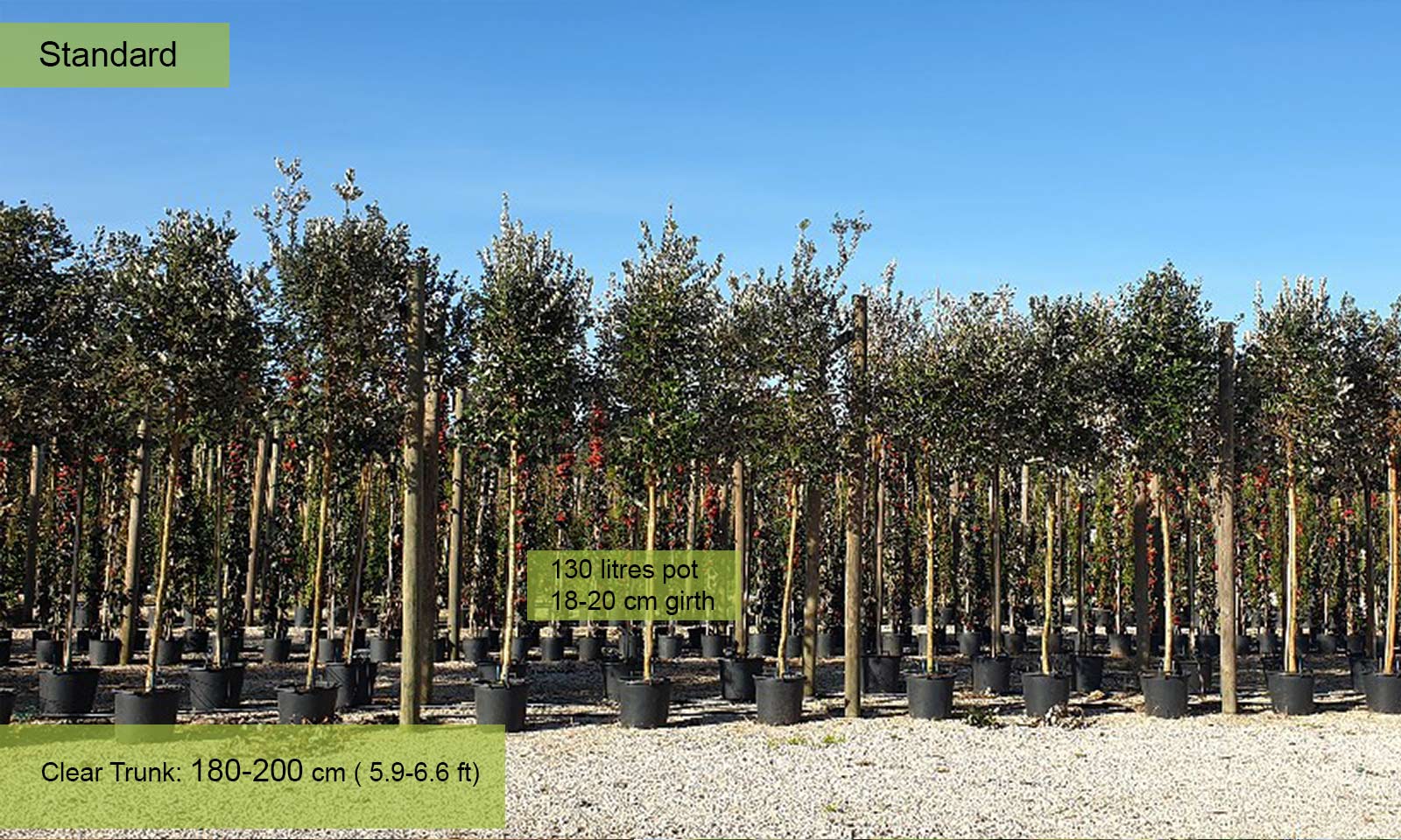 Girth 18-20 cm: 130 litre pot, clear trunk – 180-200 cm (5.9-6.6 ft), crown – 140-160 cm (4.6-5.2 ft);