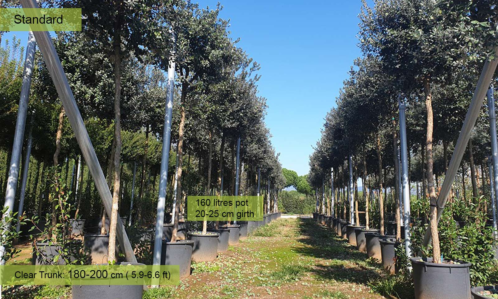 Girth 20-25 cm: 160 litre pot, clear trunk – 180-200 cm (5.9-6.6 ft), crown – 140-160 cm (4.6-5.2 ft);