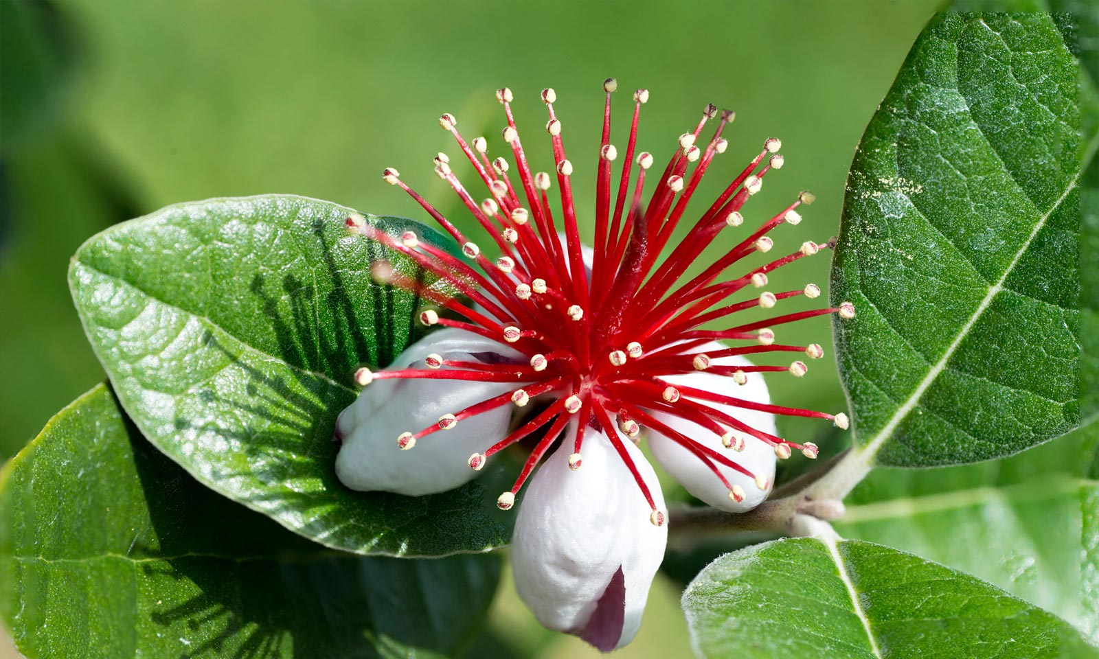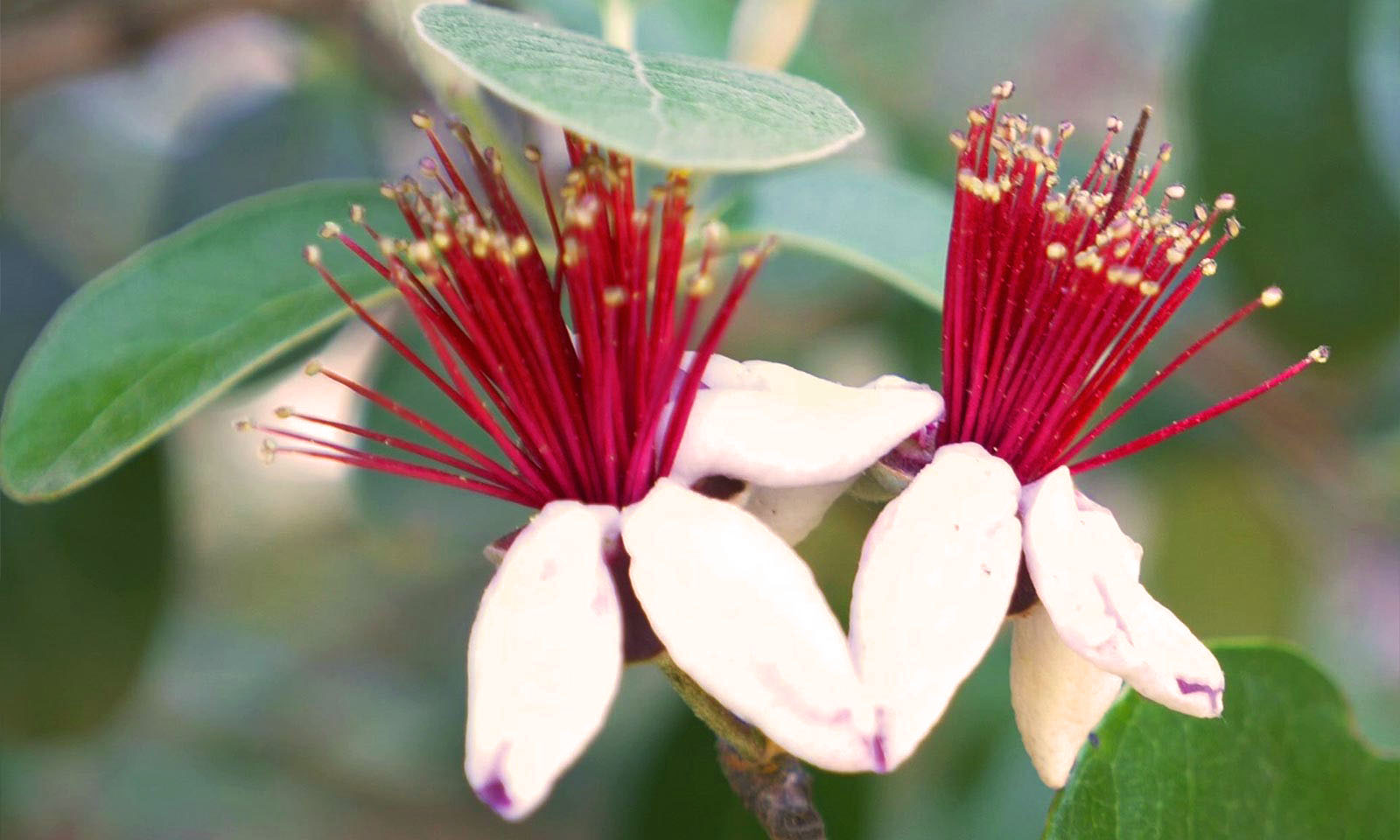 Pineapple Guava or Feijoa Sellowiana (named after Portuguese botanist Joo da Silva Feij) is a small evergreen, fruit bearing tree originating from Brazil and northern Argentina. Feijoa Sellowiana is grown for its edible fruit which is green tinged with red and tastes like guava. Fruit production is fairly reliable as Feijoa fruit is self-pollinating. Plants grown from seed will take 4-6 years to produce flowers and fruit. Pineapple guava blooms in July, producing exotic flowers with beautiful white petals enveloping bright red stamens that burst skyward coating the end with yellow pollen granules. The oblong leaves are 7 cm long, green above with woolly white underside. Pineapple guava bark is initially light reddish brown but turns darker and peels with age. The plant itself is not very hardy at H3 so make sure to shelter during a cold snap or the British winter in general. The plant is usually pest and disease free so no need to worry there.
